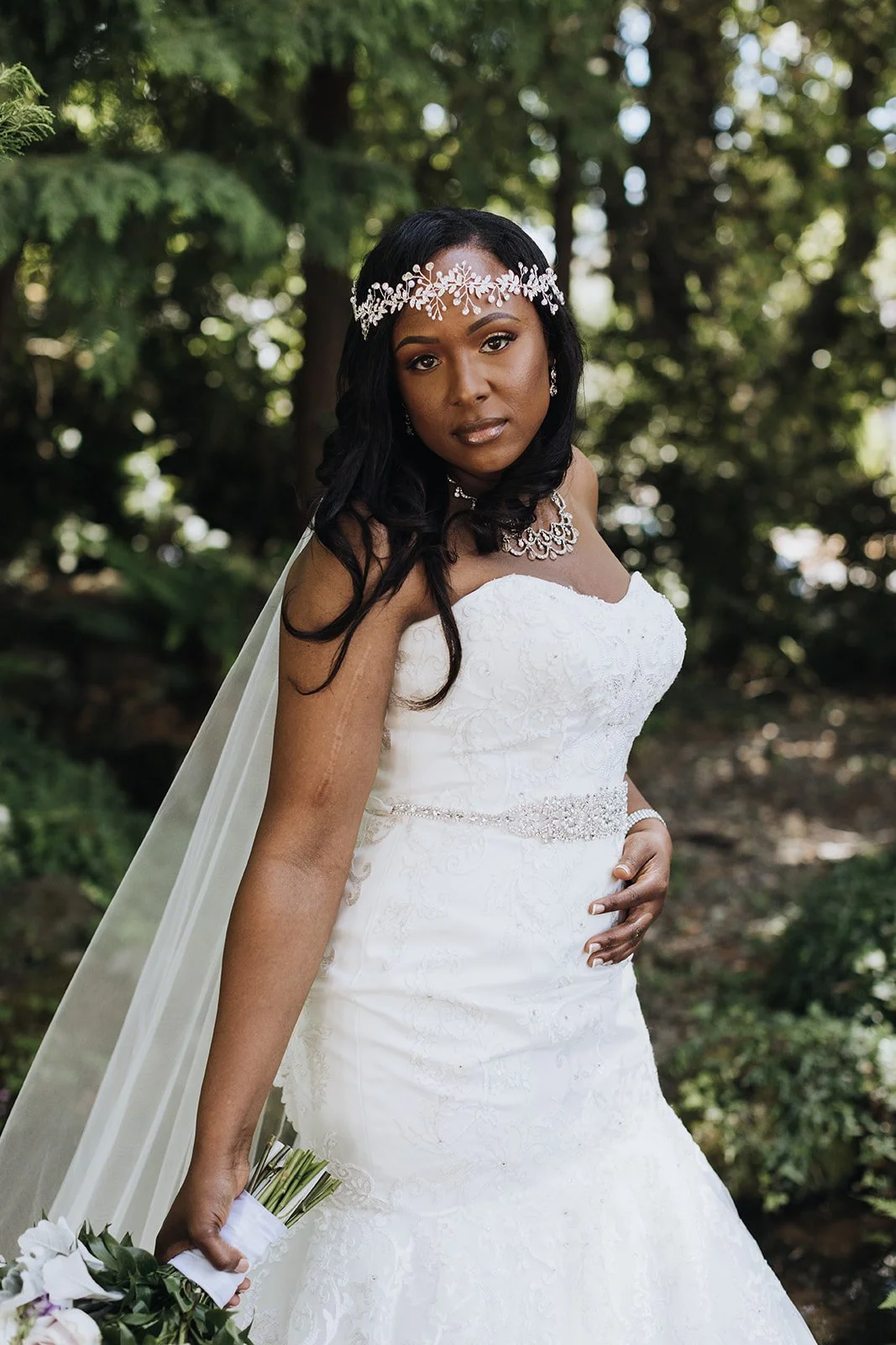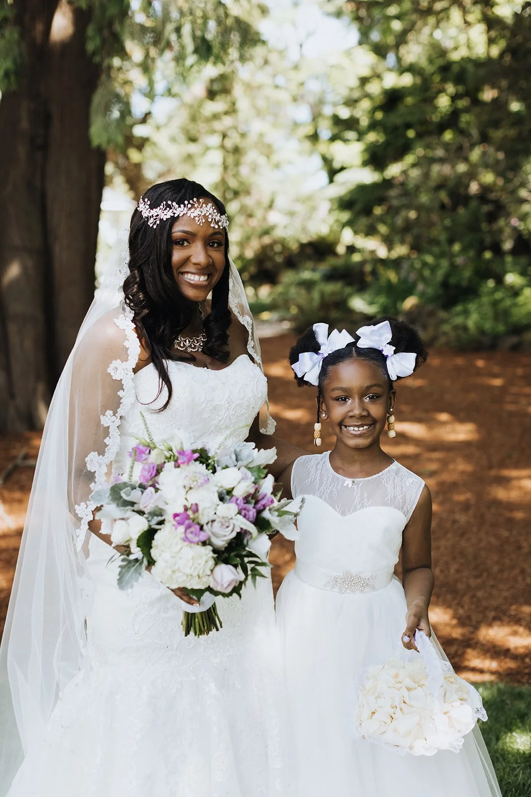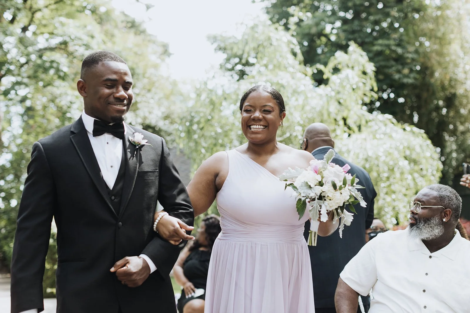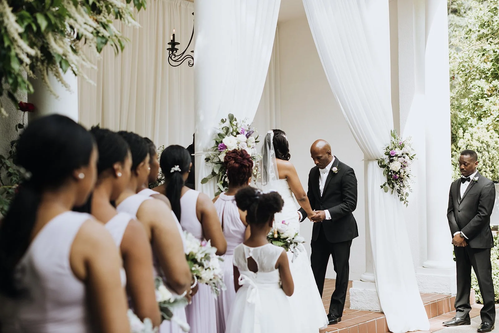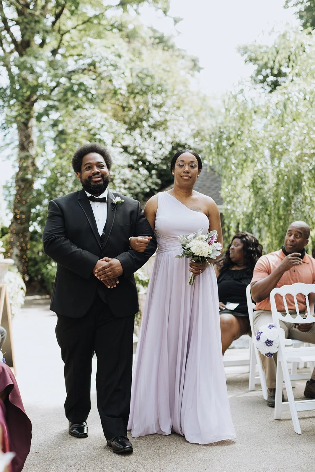 Kabbiba was breathtaking. A fitted lace gown with a beaded belt, lace-edged cathedral veil, a statement crystal necklace, and a delicate floral headpiece that sat across her forehead like a crown — she walked out, and the whole energy of the day shifted. Her bouquet was soft and lush, blush and lavender blooms with dusty miller trailing through, and it matched the palette of the entire event perfectly. Flanked by bridesmaids in flowing lavender gowns and groomsmen sharp in black tuxedos with white bow ties, this wedding party meant business.