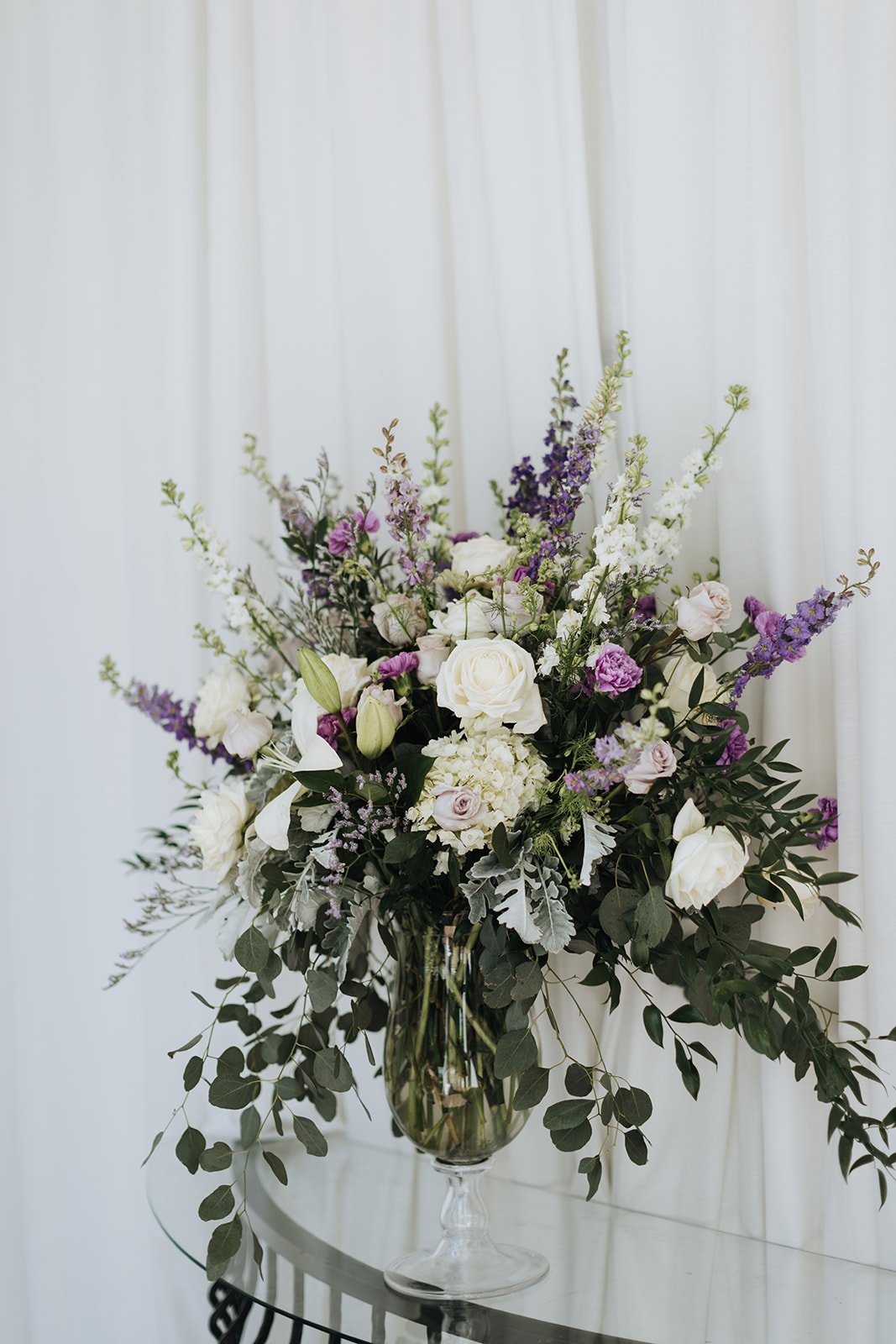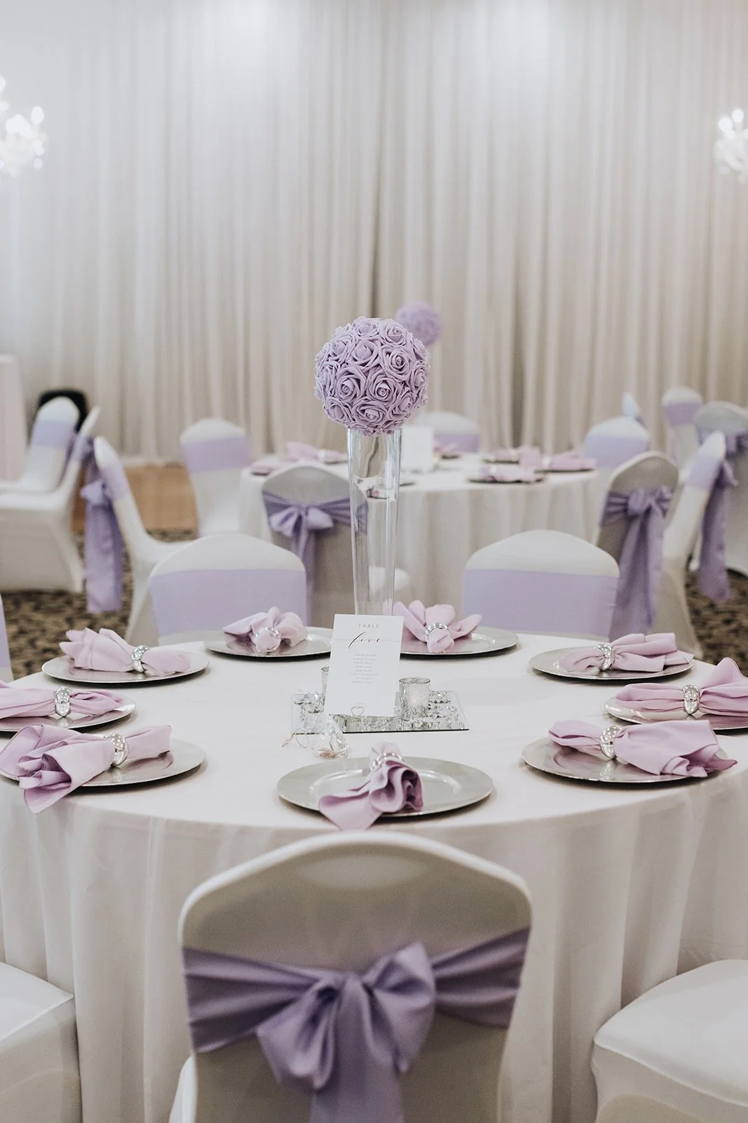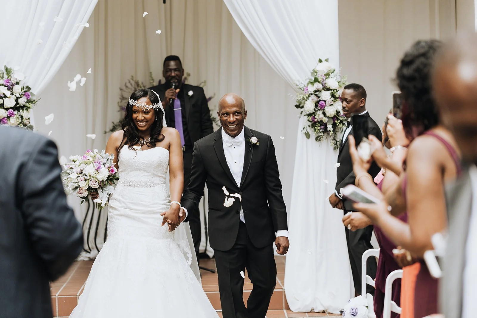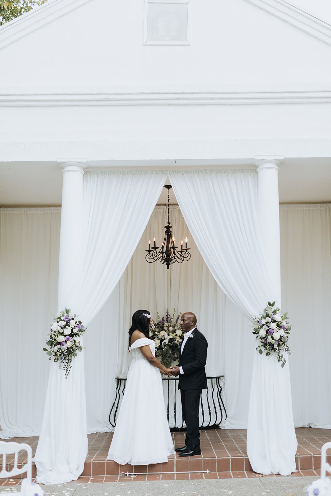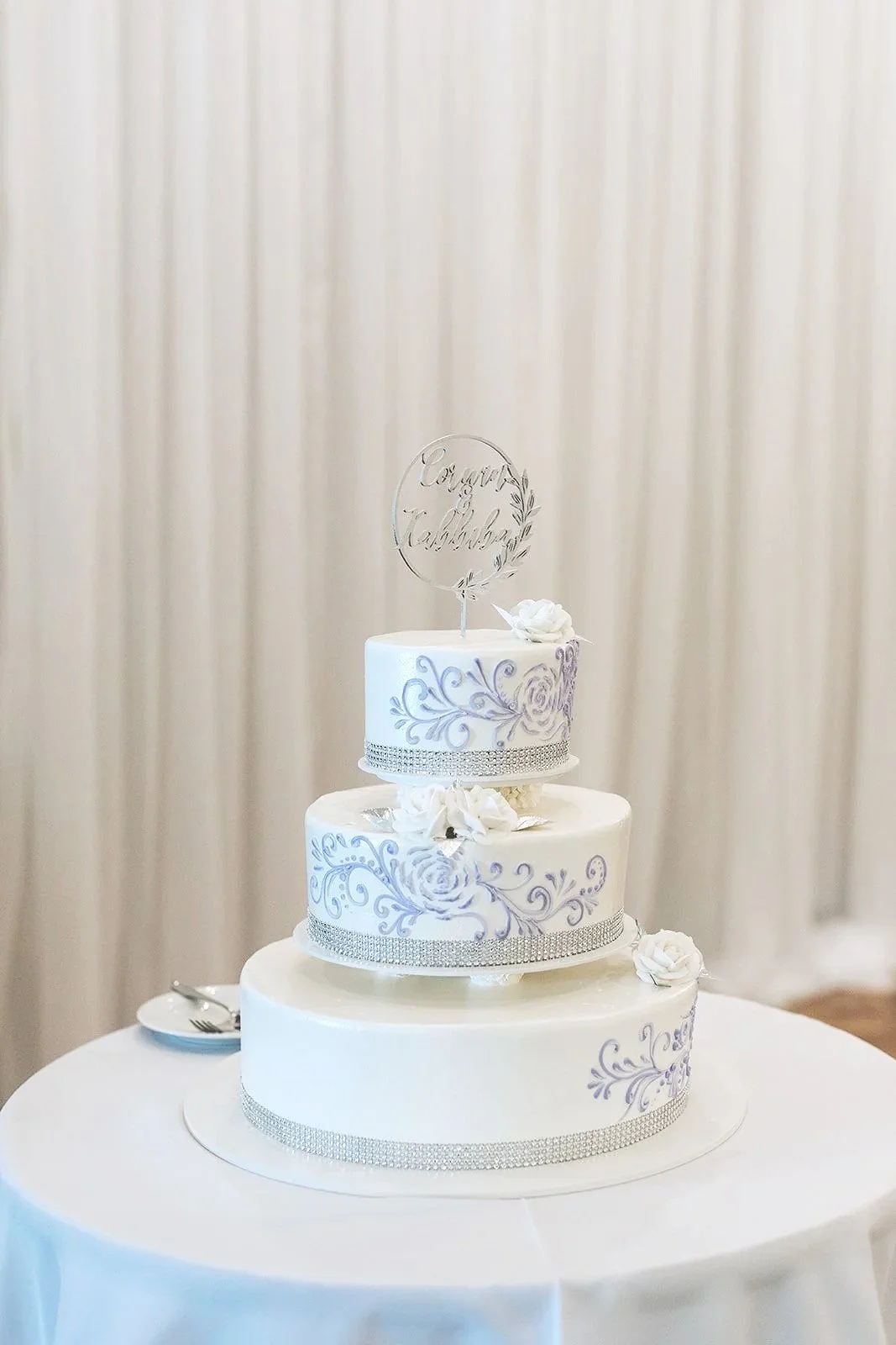 The ceremony took place under the white draped pavilion with tall floral arrangements on either side — white roses and purple blooms overflowing from the pedestals as Corwin and Kabbiba faced each other and made it official. The reception moved inside to the ballroom, dressed floor to ceiling in lavender and white — tall rose-ball centerpieces on mirrored bases, lavender chair sashes tied in perfect bows, and a three-tiered cake hand-painted in periwinkle scrollwork with rhinestone ribbon trim and a personalized acrylic topper that read Corwin & Kabbiba.
