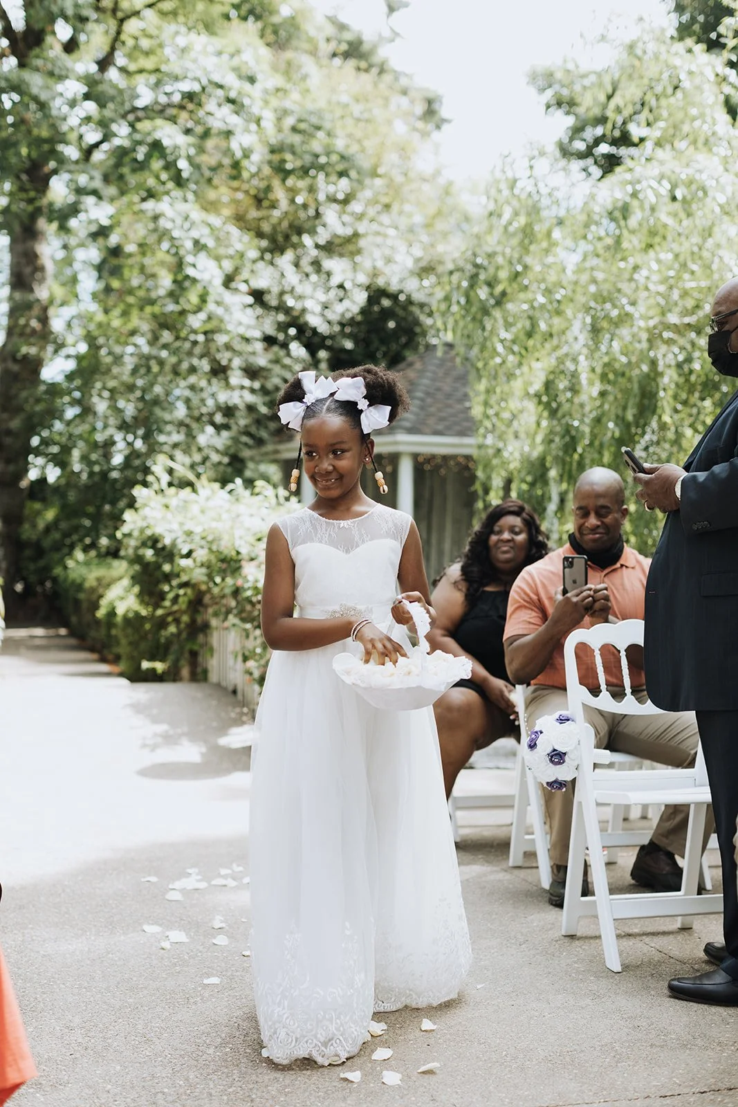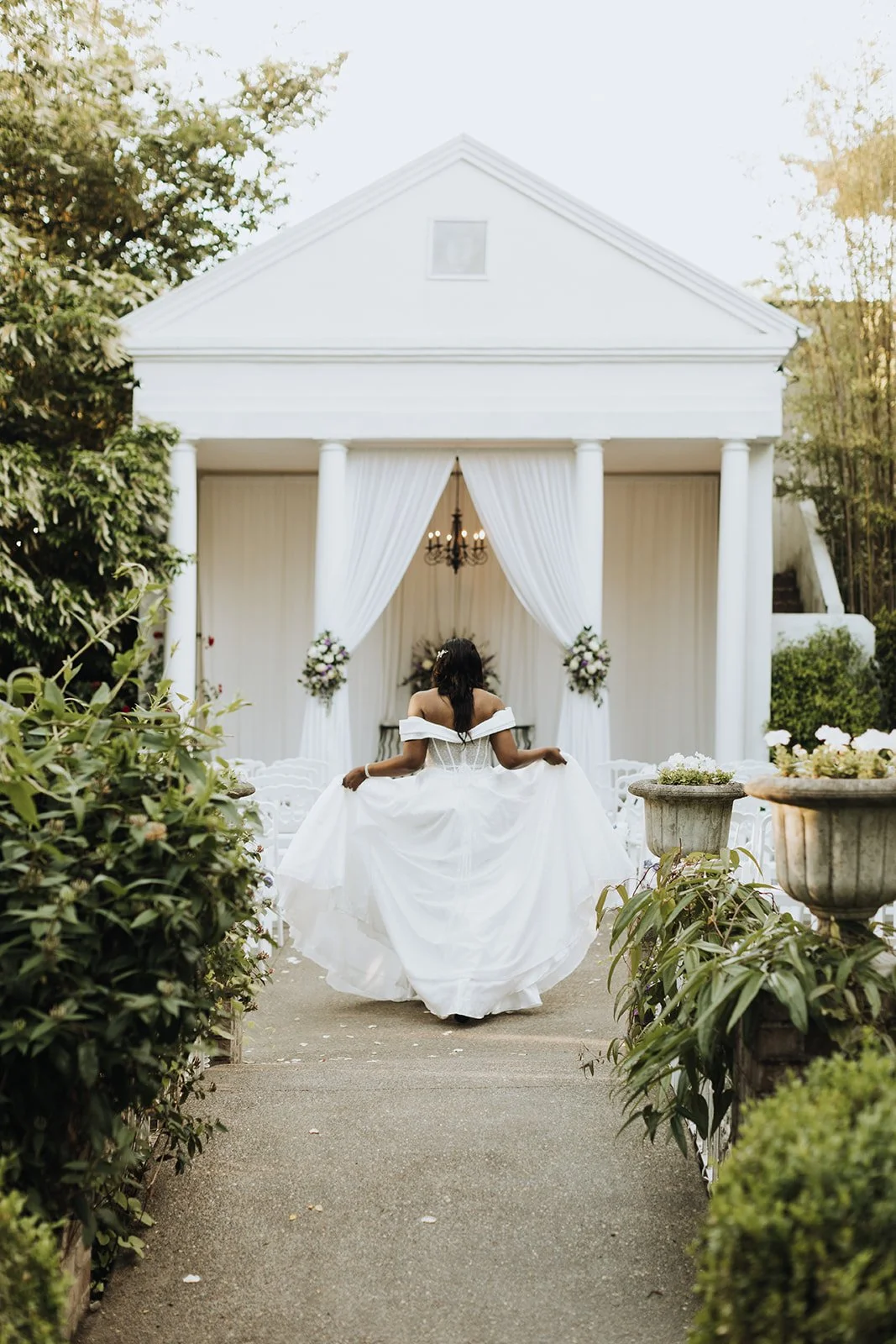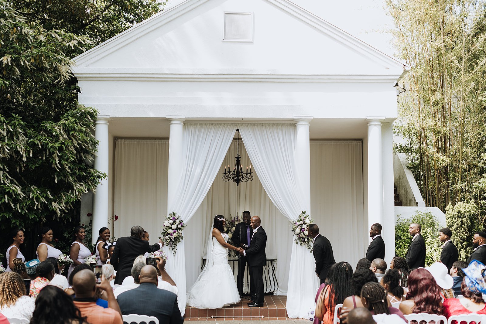 Gray Gables is one of those venues that does the work for you. Tucked in Southeast Portland, the estate grounds are lush and tree-lined, with a classic white outdoor ceremony space framed by columns and draped curtains that manages to feel both grand and intimate at the same time. It's the kind of place that looks like it was built specifically for moments like this one.