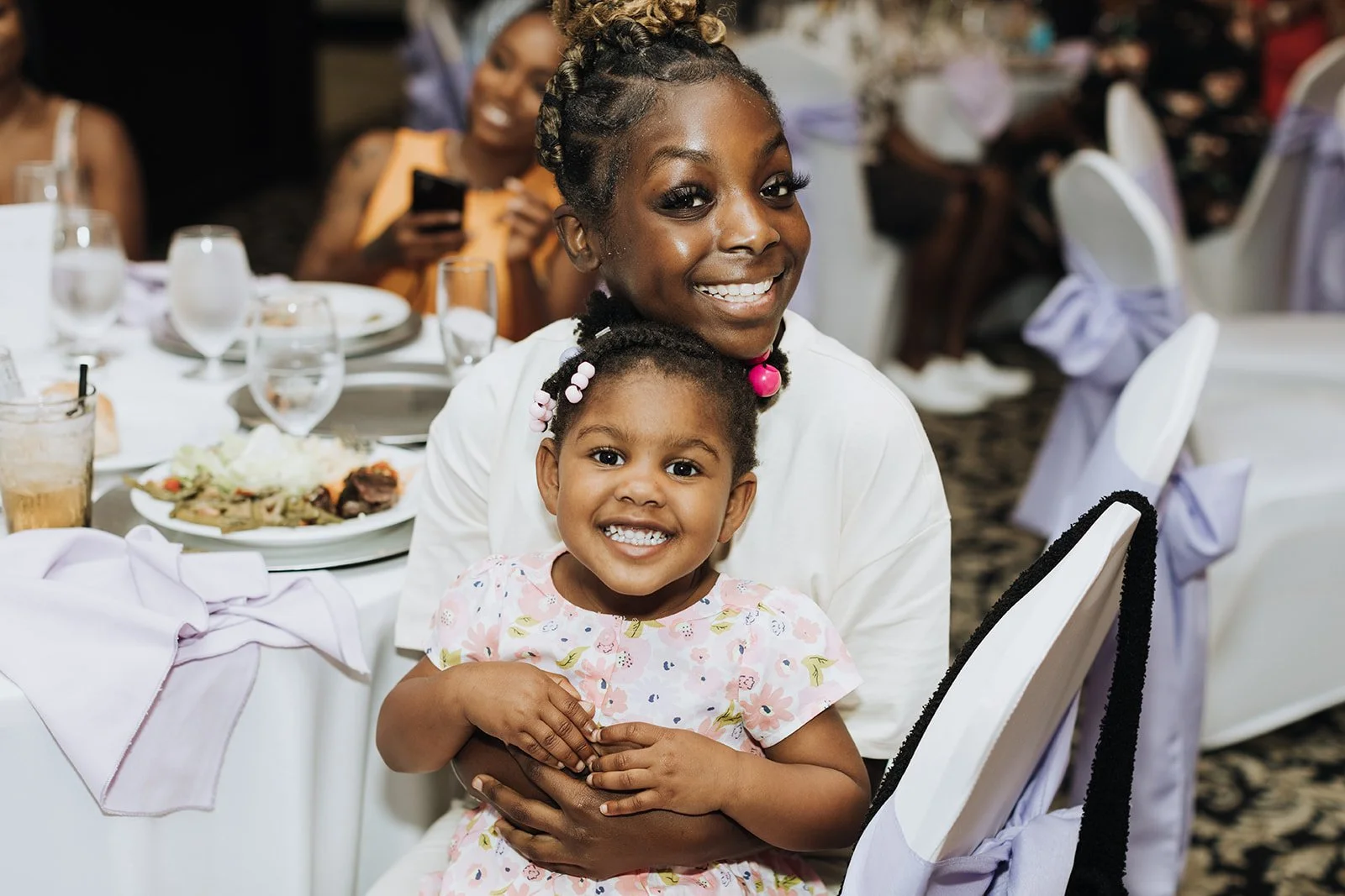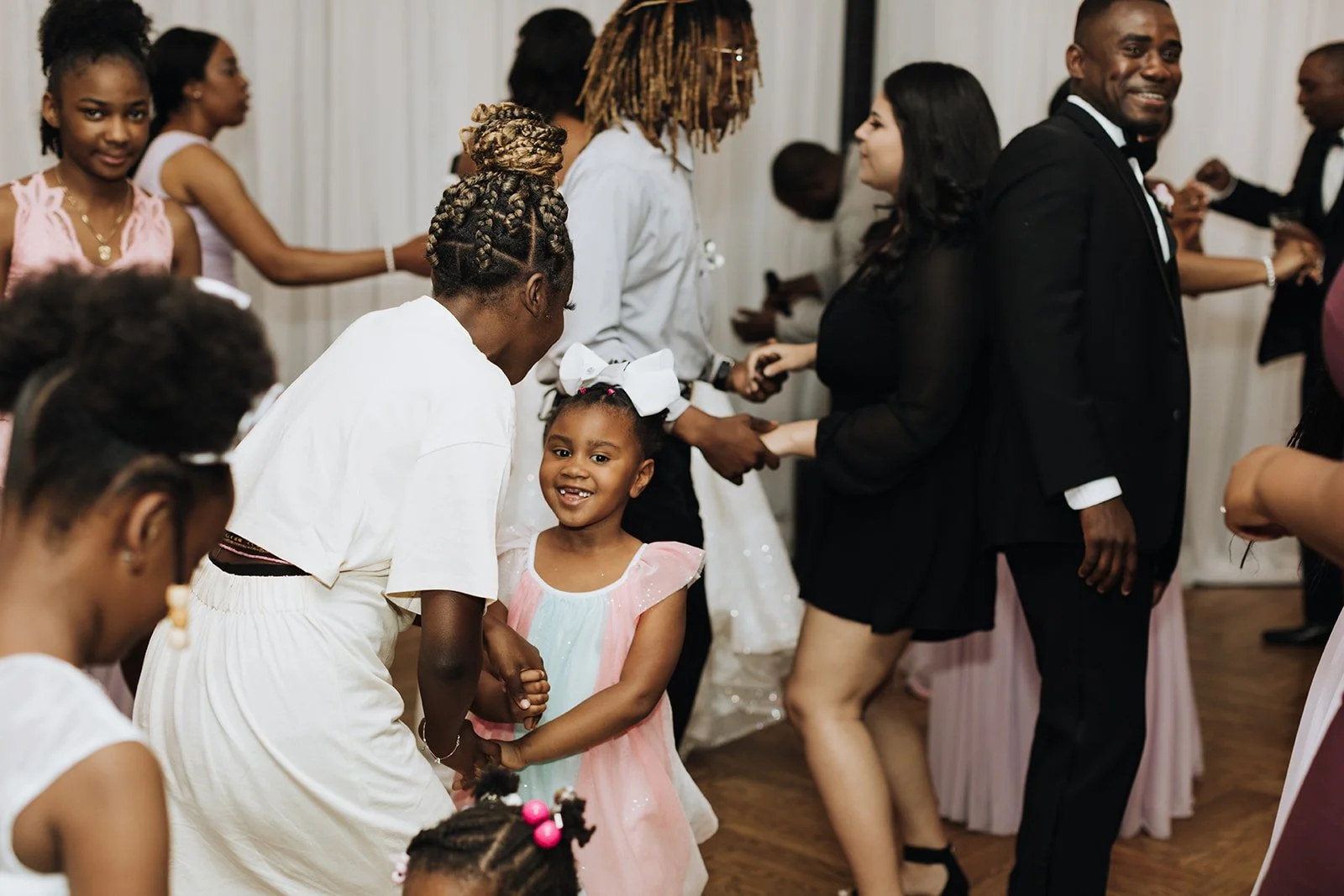 And then the dancing started. The floor filled up fast and didn't empty for the rest of the night — kids twirling in pastel dresses, family forming circles, the groom still grinning that same grin from the moment he first saw his bride. The joy in that room was the kind that fills a camera frame without you even trying.