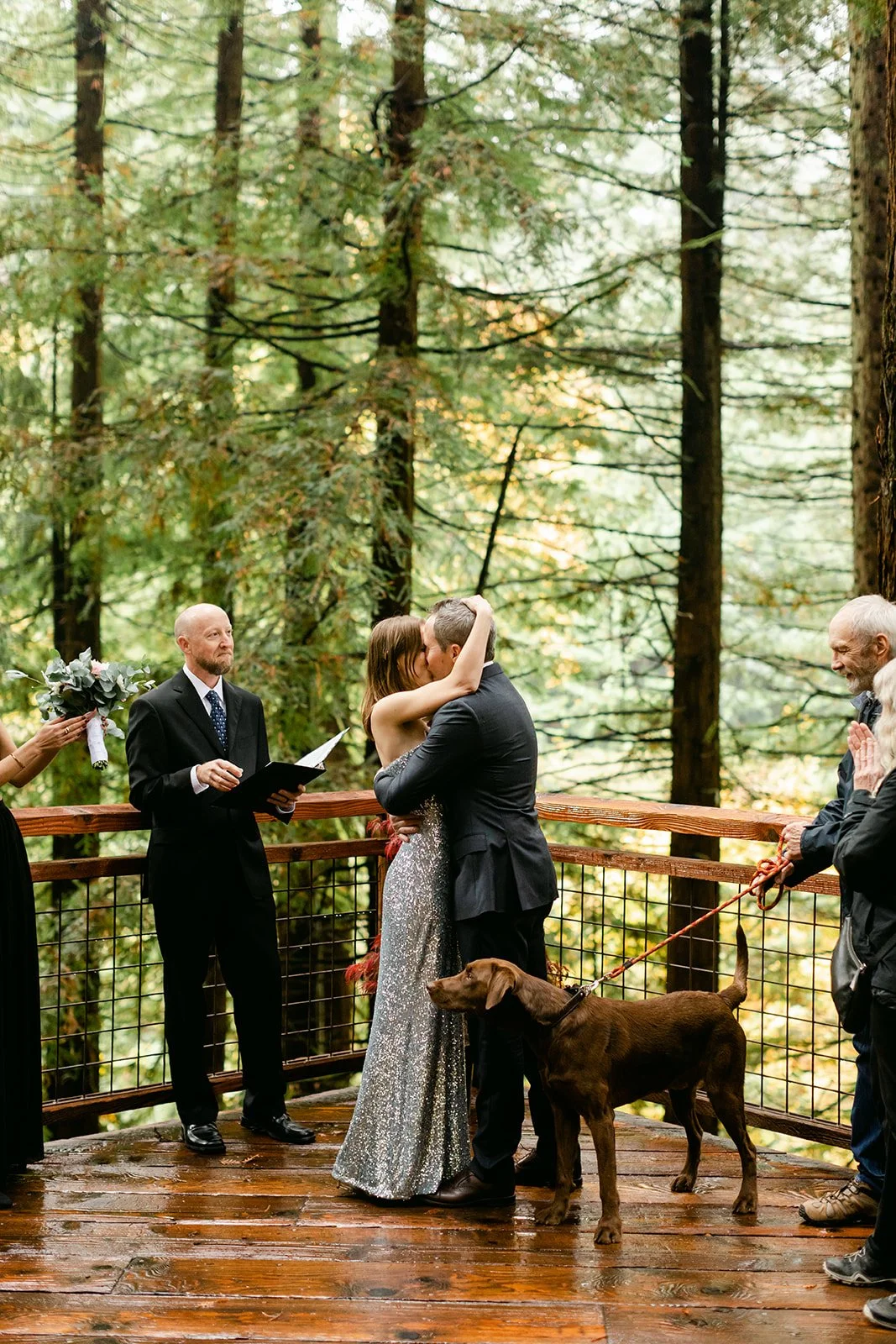 The group was small — just the people who matter most — and after the vows, everyone clinked mini champagne bottles with colorful straws, and the whole thing felt exactly as joyful as it should. Their chocolate lab was there too, fully invested in the proceedings and completely unimpressed by the rain. We wandered the arboretum paths for portraits in the fall color, the sequin gown catching light even under an overcast sky, and by the time we reached the towering redwoods, I had already taken frames I knew I would keep.