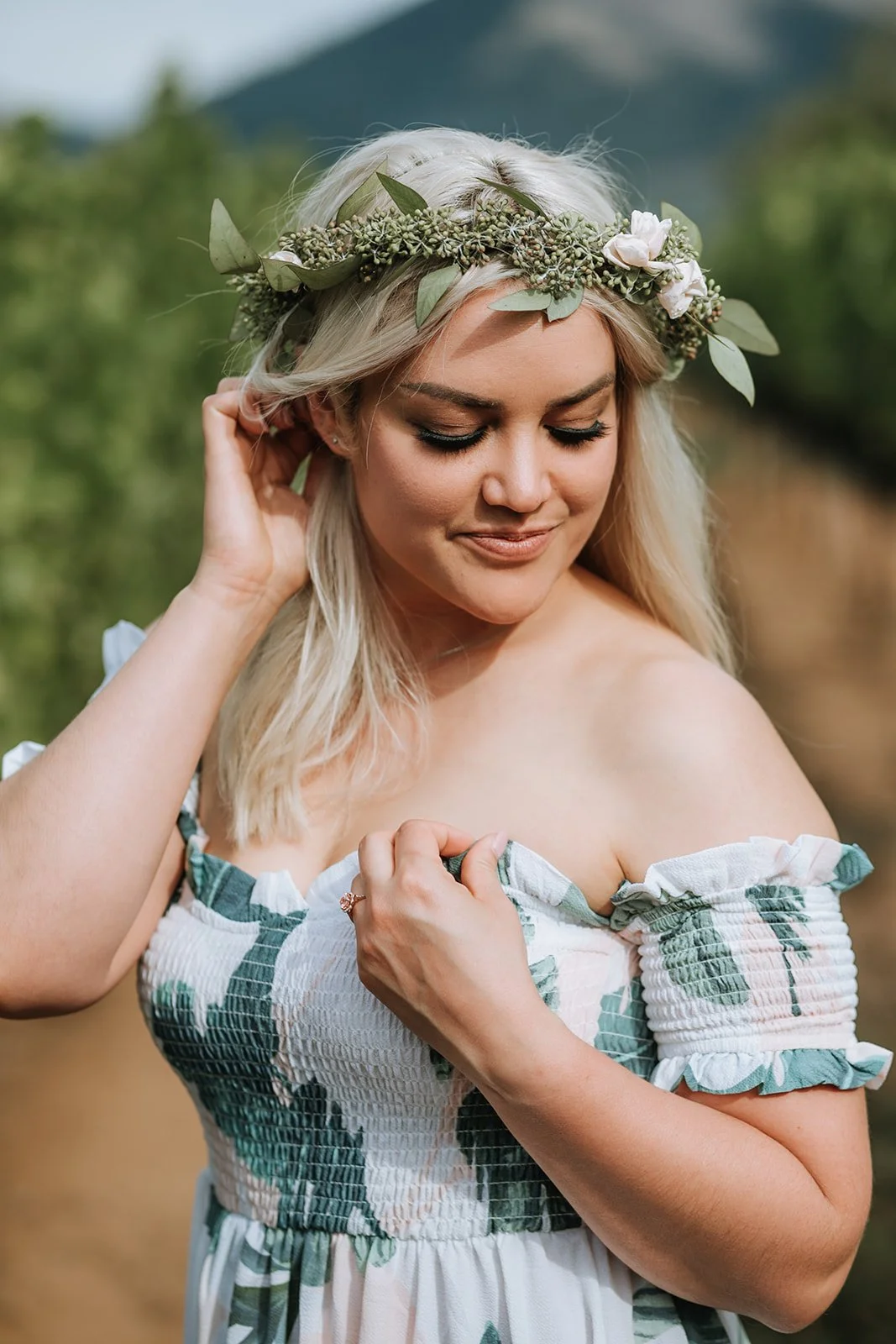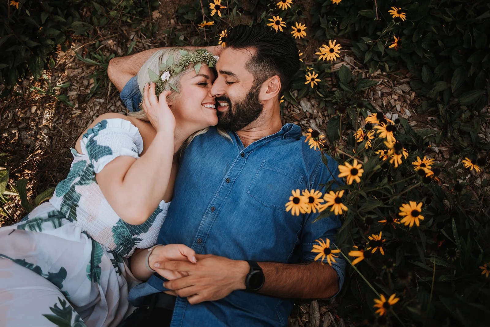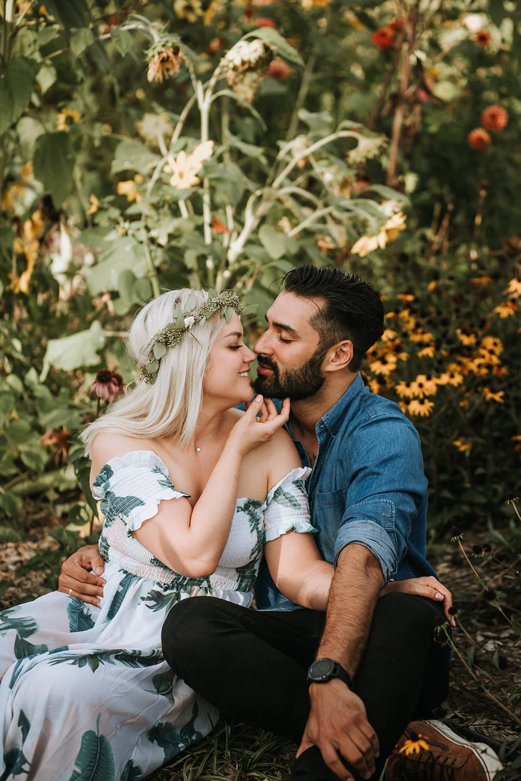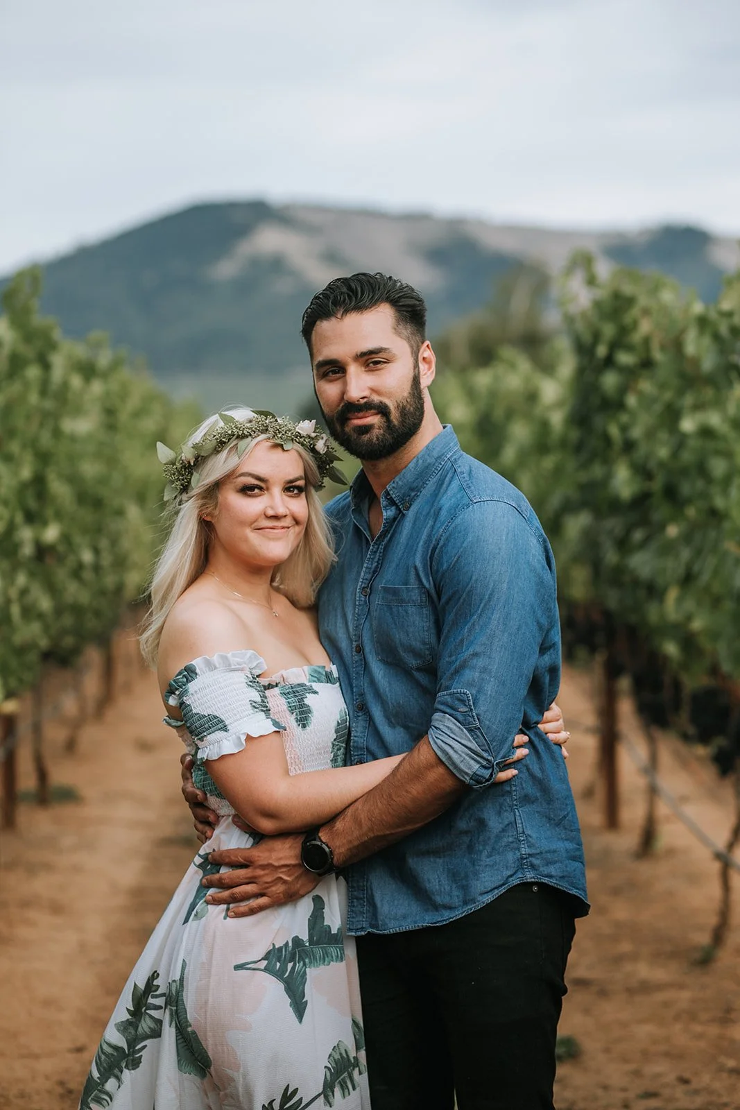We started at Marchesi Vineyards in Hood River, a gorgeous family-owned winery tucked into the Columbia River Gorge with vineyard rows that seem to go on forever and mountains sitting wide and patient in the distance. We wandered, we laughed, we did the thing where you pretend you are not being photographed and then forget entirely. Shelby's flower crown and that tropical-print dress against the summer green of the vines, Damien's enormous smile, the two of them sitting in the sunflower field at golden hour completely at ease: this is what engagement sessions are supposed to feel like.