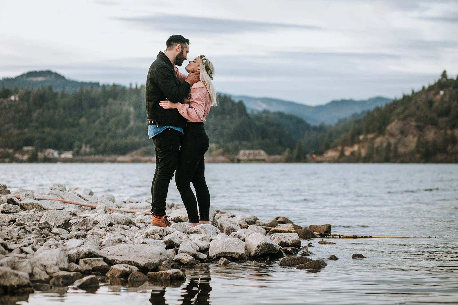 We moved to the waterfront as the light dropped, and the Columbia gave us everything: a wide-open sky, a bridge in the background, rocks to sit on, water to stand in, and that particular stillness that a big river has near dusk. And then we did the lift. You know the one. Dirty Dancing. The climactic moment where the music swells, and someone gets hoisted overhead against a sunset. We did it gender-swapped: Shelby lifting Damien, arms outstretched, completely horizontal, with just a little help from Photoshop to seal the deal. It is one of my favorite images I have ever made, and I will not apologize for it.