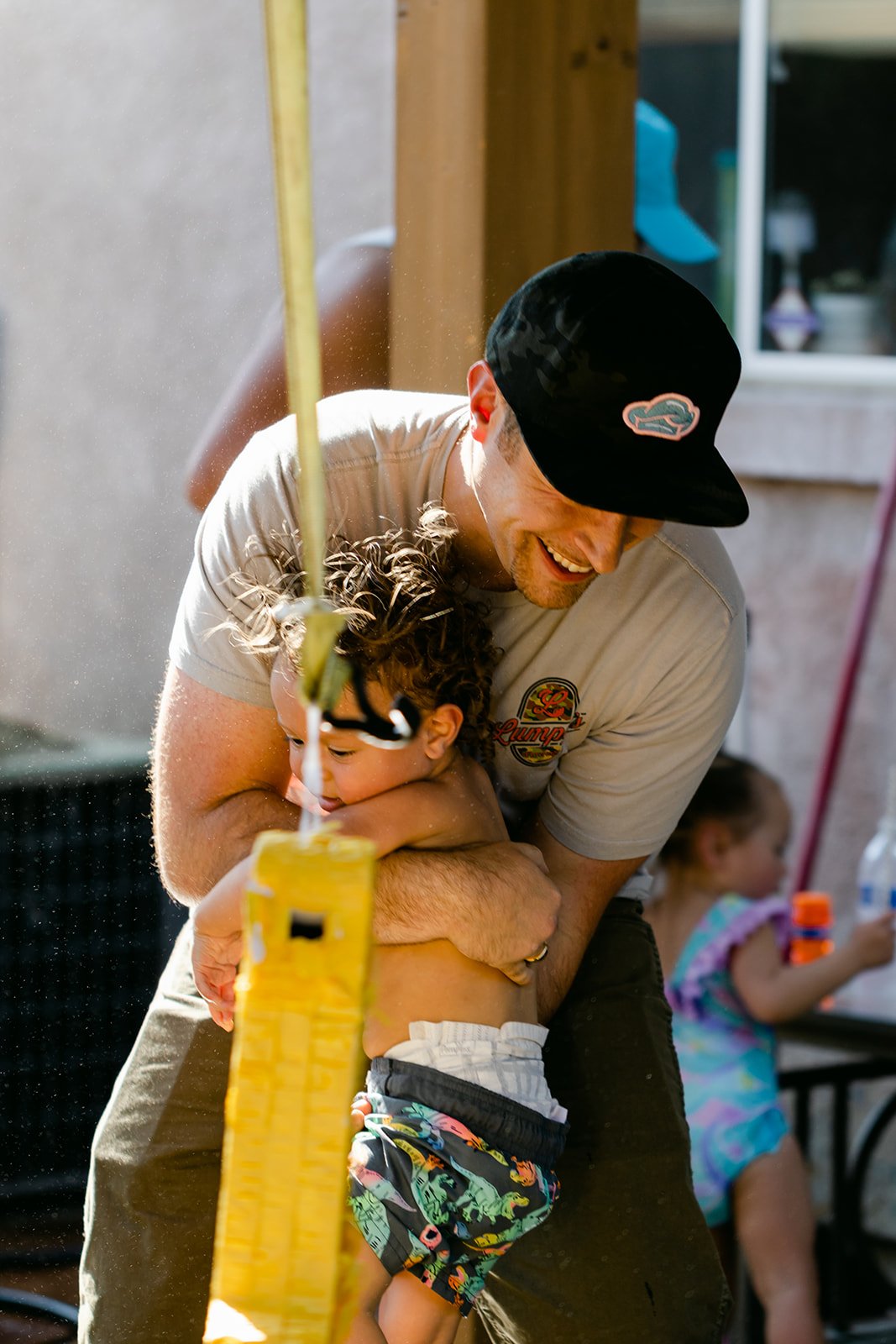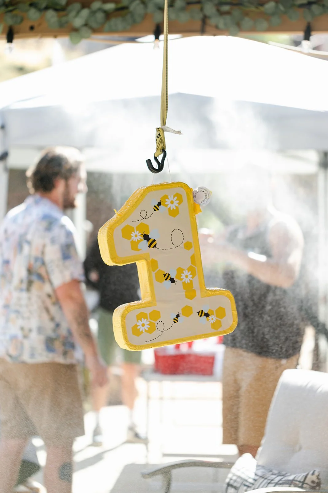 It was a hot Antioch summer day, the kind where the air shimmers and the only sensible response is to run through a sprinkler. So that's exactly what happened. The kids showed up in swimsuits, the piñata went up — a yellow number-one covered in honeycomb and bees, very on-theme — and absolute chaos followed in the best possible way. Kids swinging with everything they had, dads crouching down to help toddlers take their turn, a baby in a white ruffle onesie looking mildly alarmed and also deeply interested in the whole situation. When the piñata finally cracked open, there was a full-on scramble across the wet concrete for candy while the sprinklers kept going, and nobody cared even a little bit.