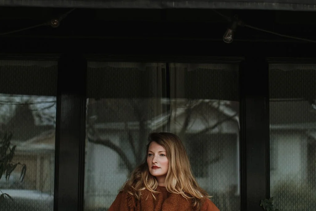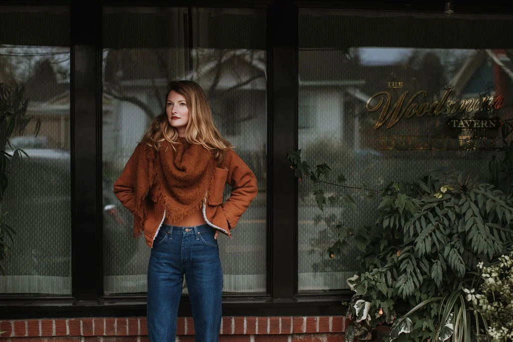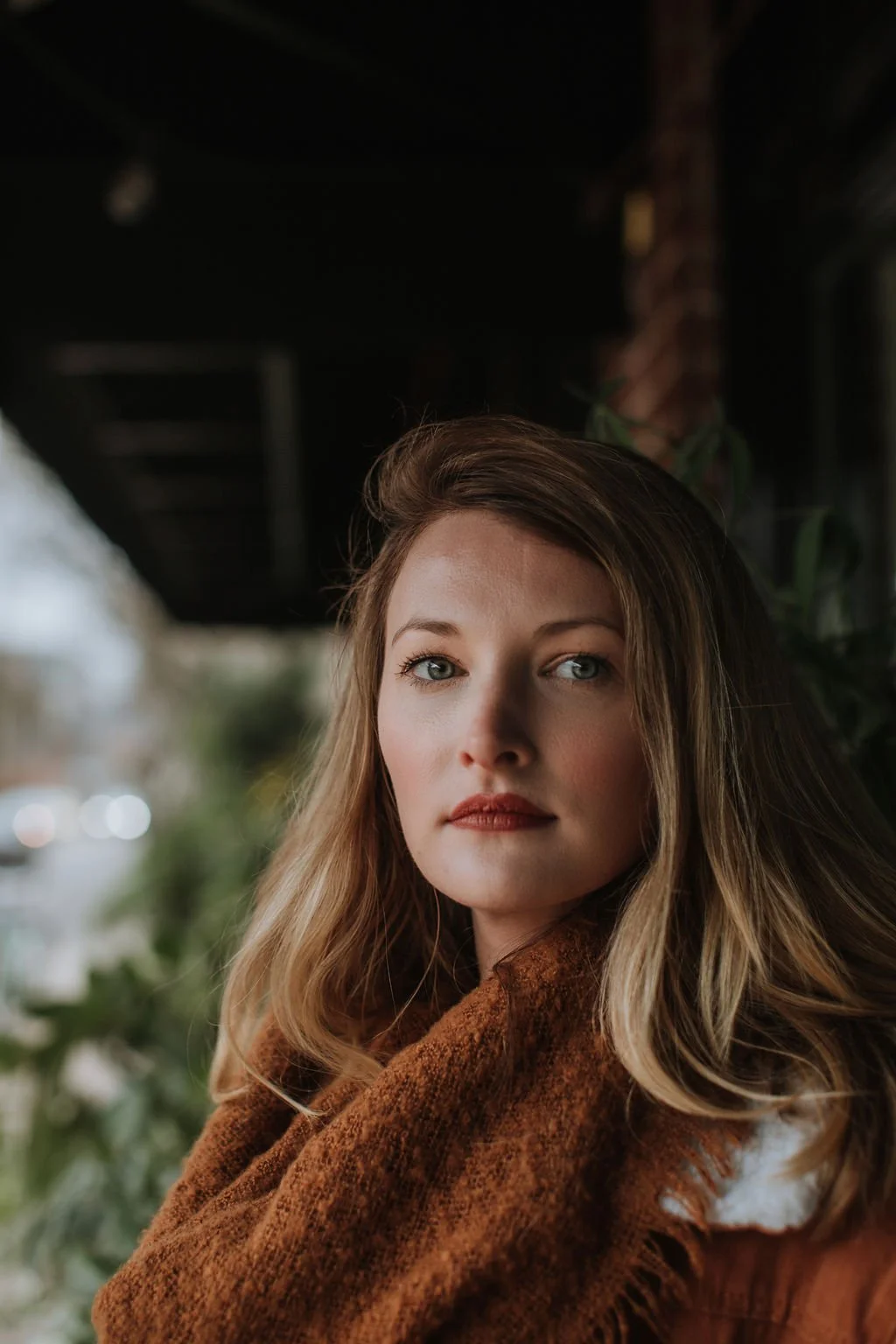We spent an afternoon walking around Kate's Portland neighborhood in that cold, cloudy winter light that the Pacific Northwest does so well. Brick storefronts, bare branches, quiet streets. Kate in her rust-colored sweater and a blanket scarf that somehow made the whole thing feel even more like a Portland winter. We stopped whenever we found good light, whenever Edward wanted to sniff something interesting, whenever it felt right. No rush.