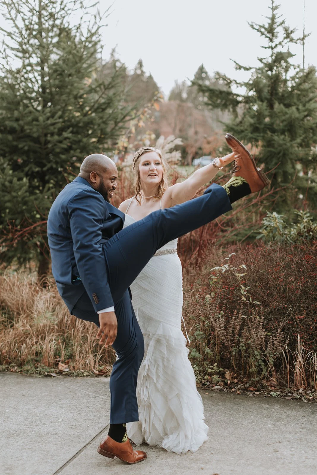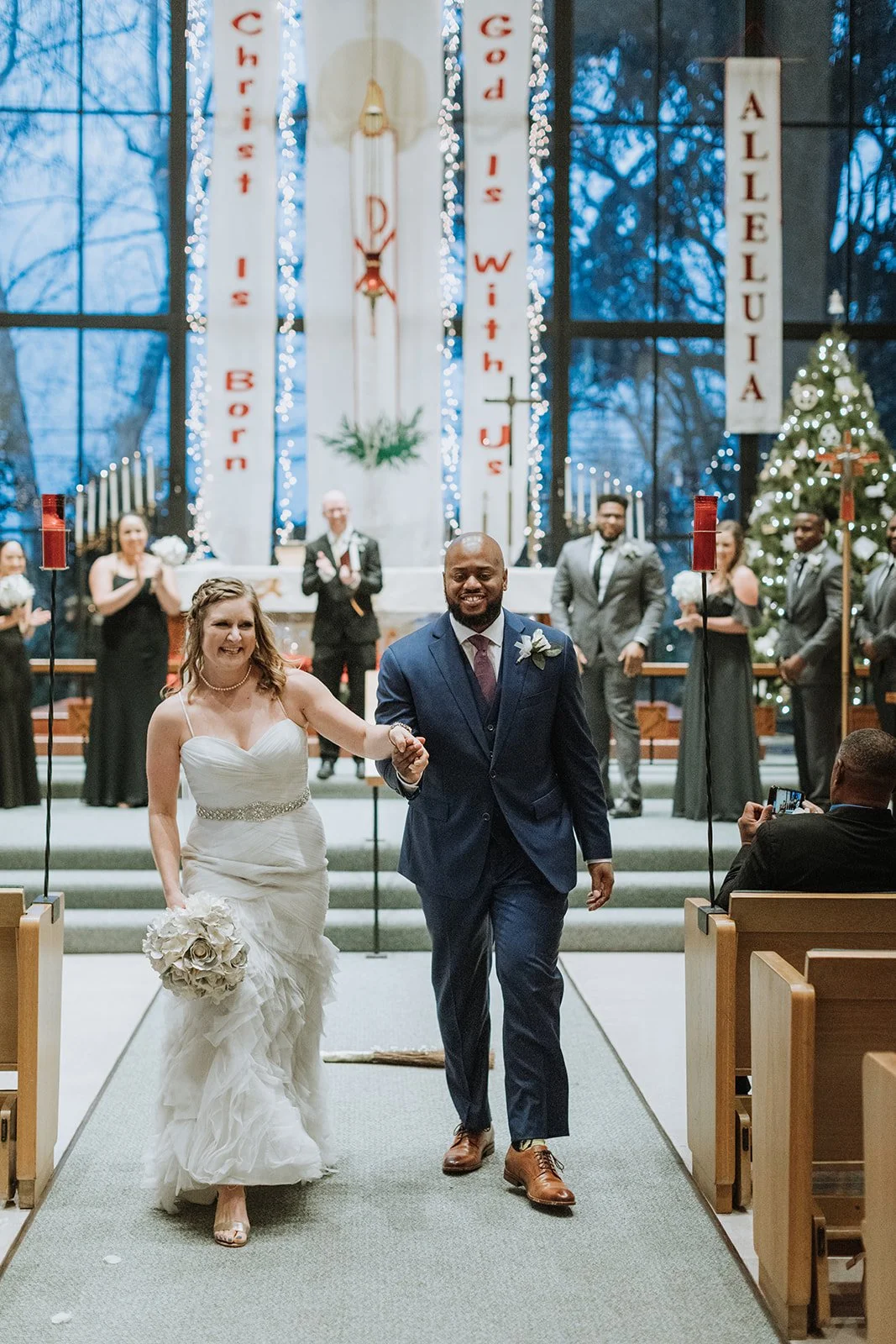 The ceremony was held at St. Michael's Lutheran Church, dressed in full Christmas splendor: towering trees flanking the altar, garland draping the pews, and the deep blue Pacific Northwest sky framed behind the arched windows. The flower girl practically owned that aisle. And when Abby walked in on her father's arm, the whole room held its breath.