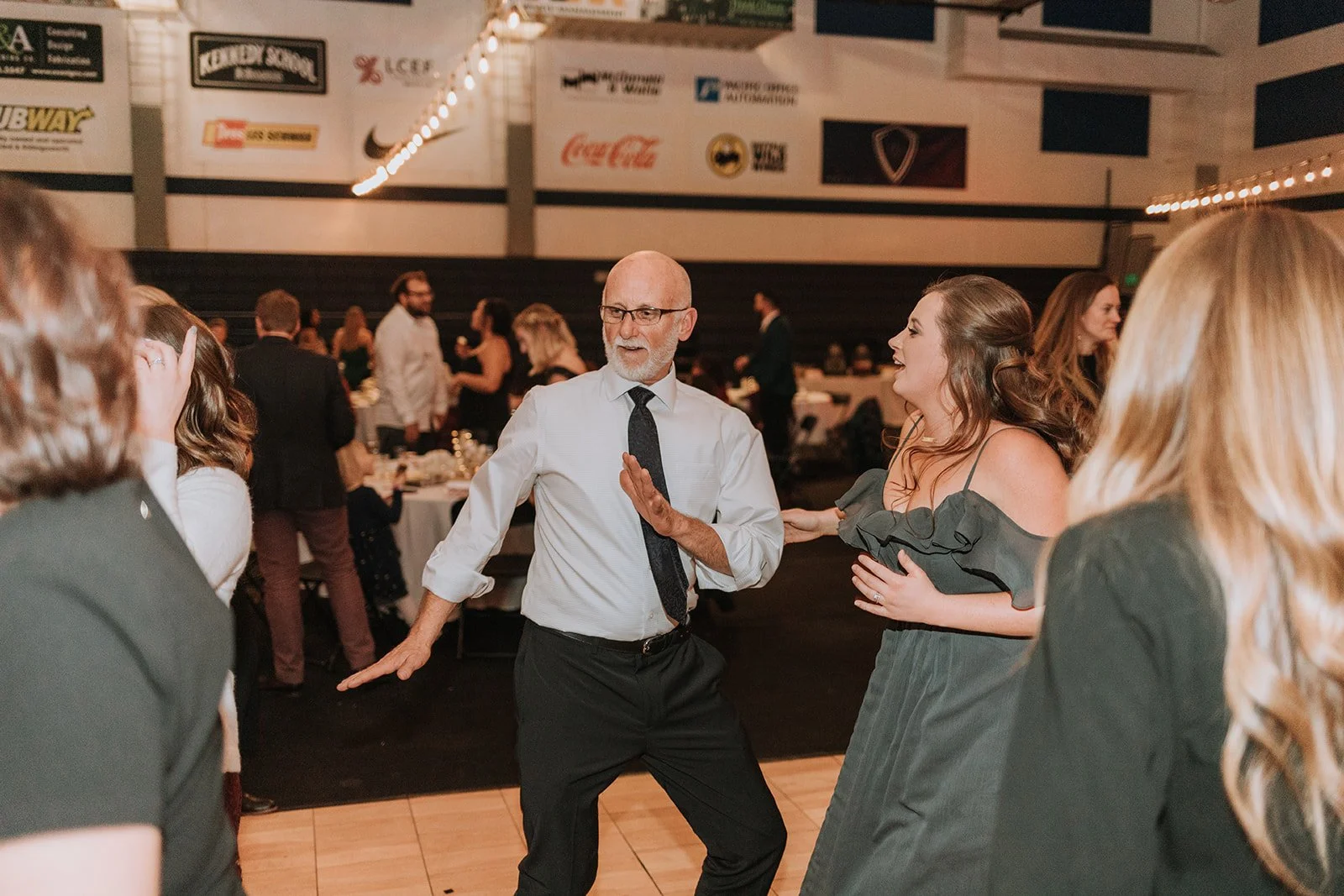 The reception moved into the Concordia gym, which had been transformed into something magical. Abby carried a stunning paper flower bouquet, and the couple had custom Funko Pop figures made in their likeness β a detail their guests absolutely loved. The dance floor never emptied. A little girl in a gold dress brought the house completely down.