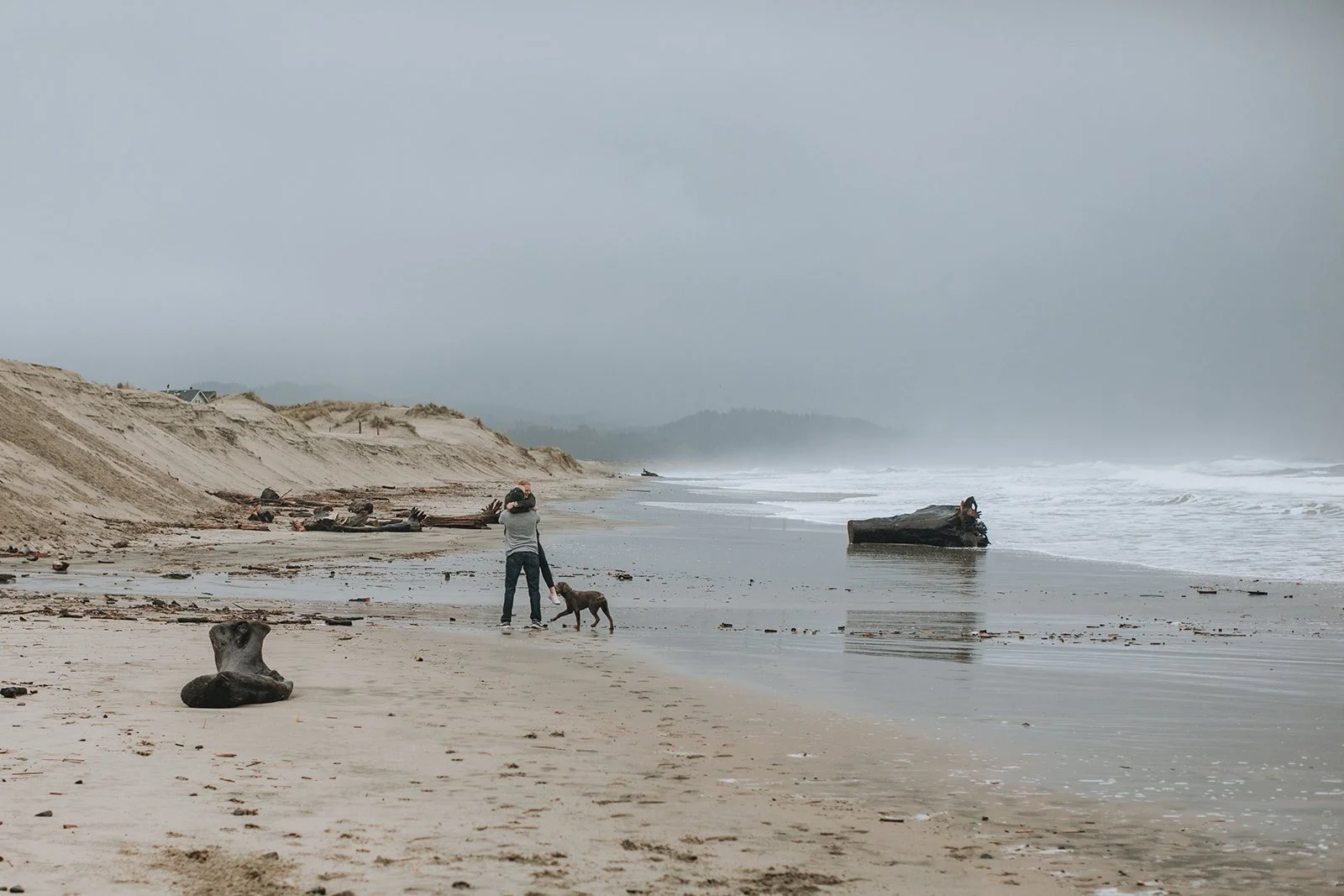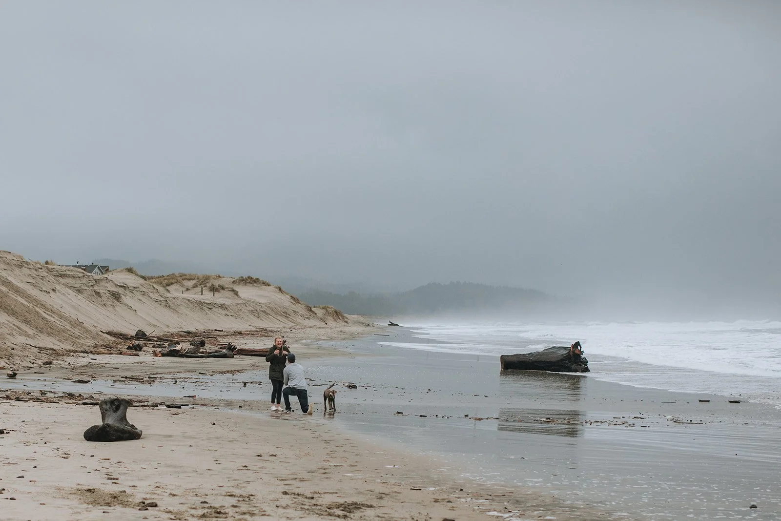 He had it all planned. Pacific City, Haystack Rock, a stormy grey sky that made the whole scene feel like something out of a novel. She thought they were just out for a walk on the beach with their pup. She had no idea I was there. And then he stopped, and he turned to her, and he asked. From where I was standing, I could see the exact moment it registered on her face. The way her whole body shifted. The way she reached for him.