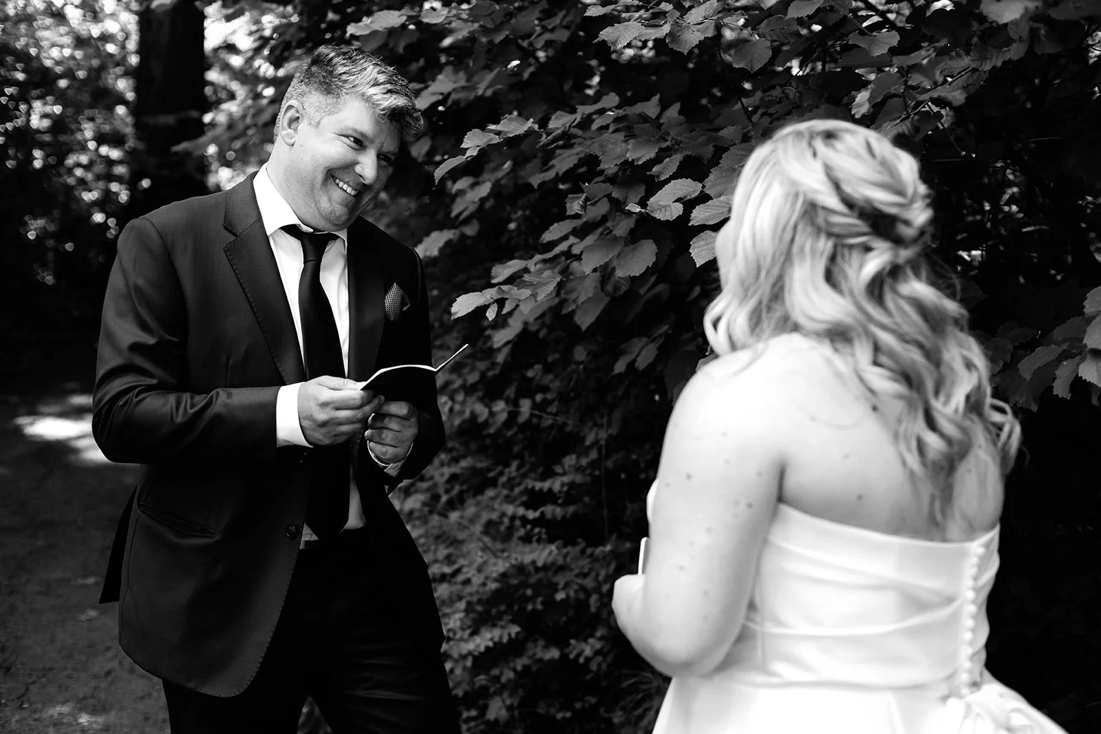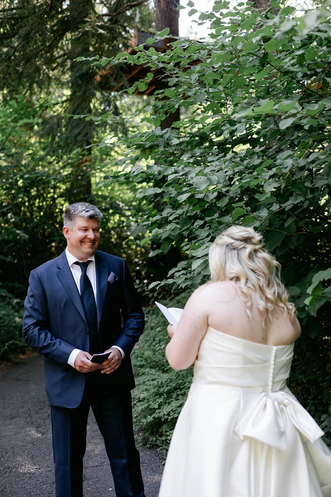 Before the ceremony, Jillian and Ryan slipped away into the forest to share private vows — just the two of them, surrounded by towering trees and dappled light. It was an intimate, unhurried moment that set the tone for the whole day: personal, heartfelt, and real. Watching Ryan's face as Jillian read to him said everything.