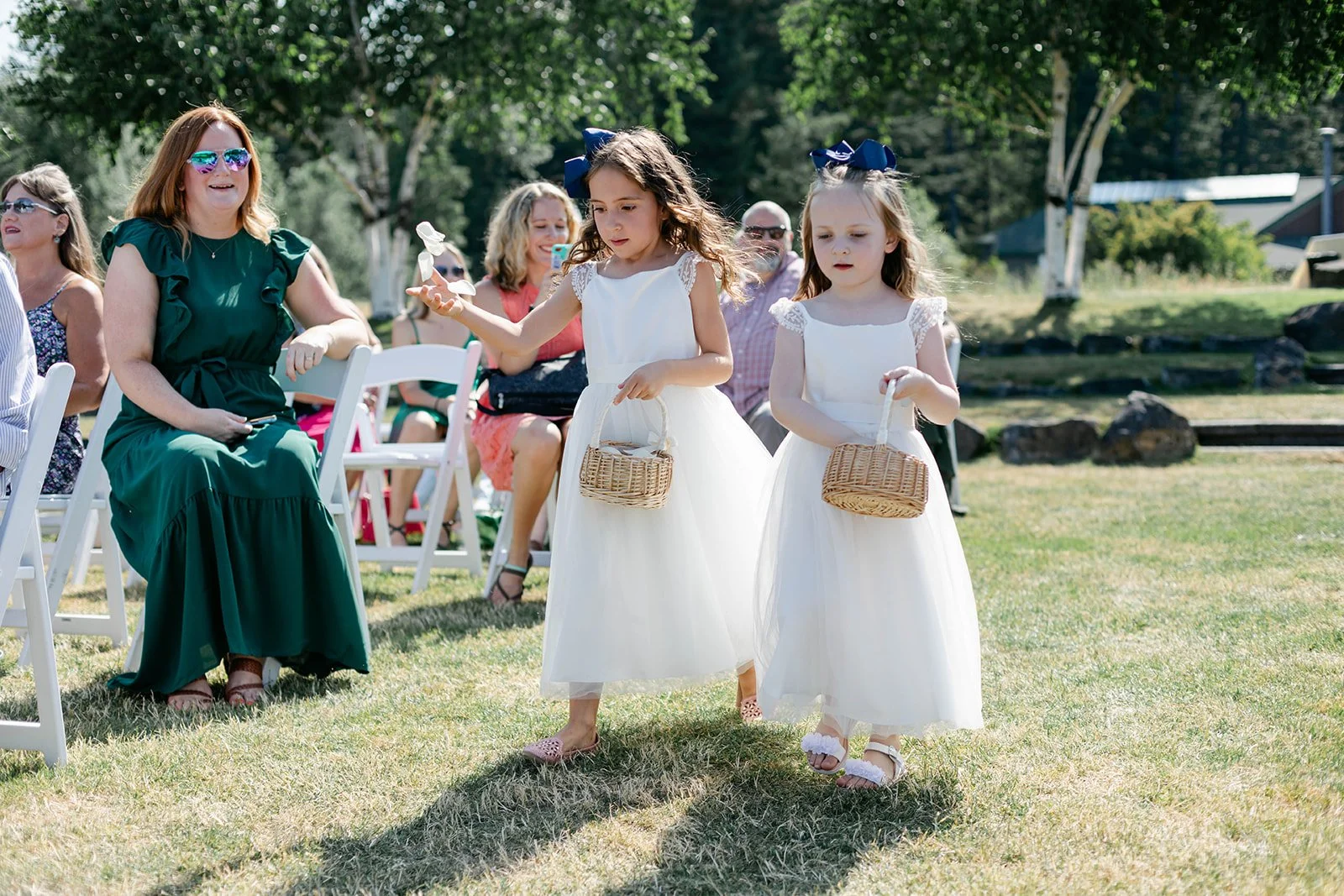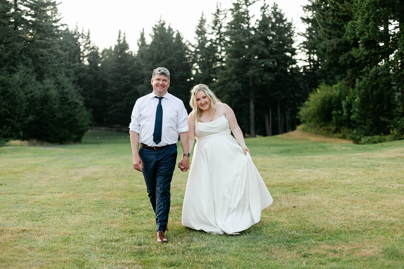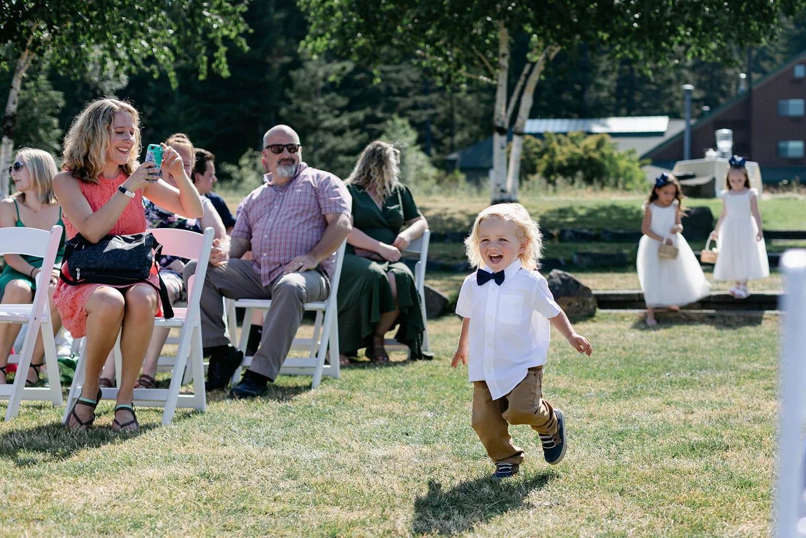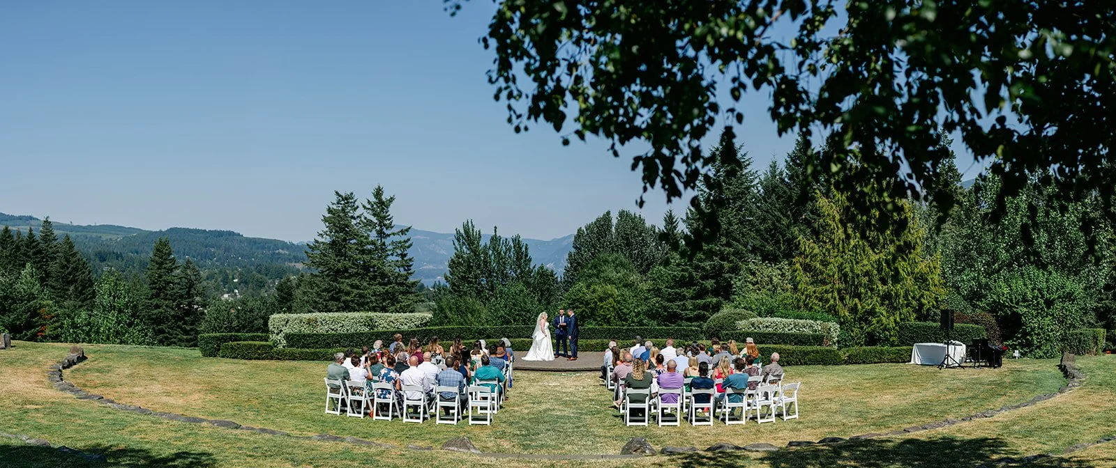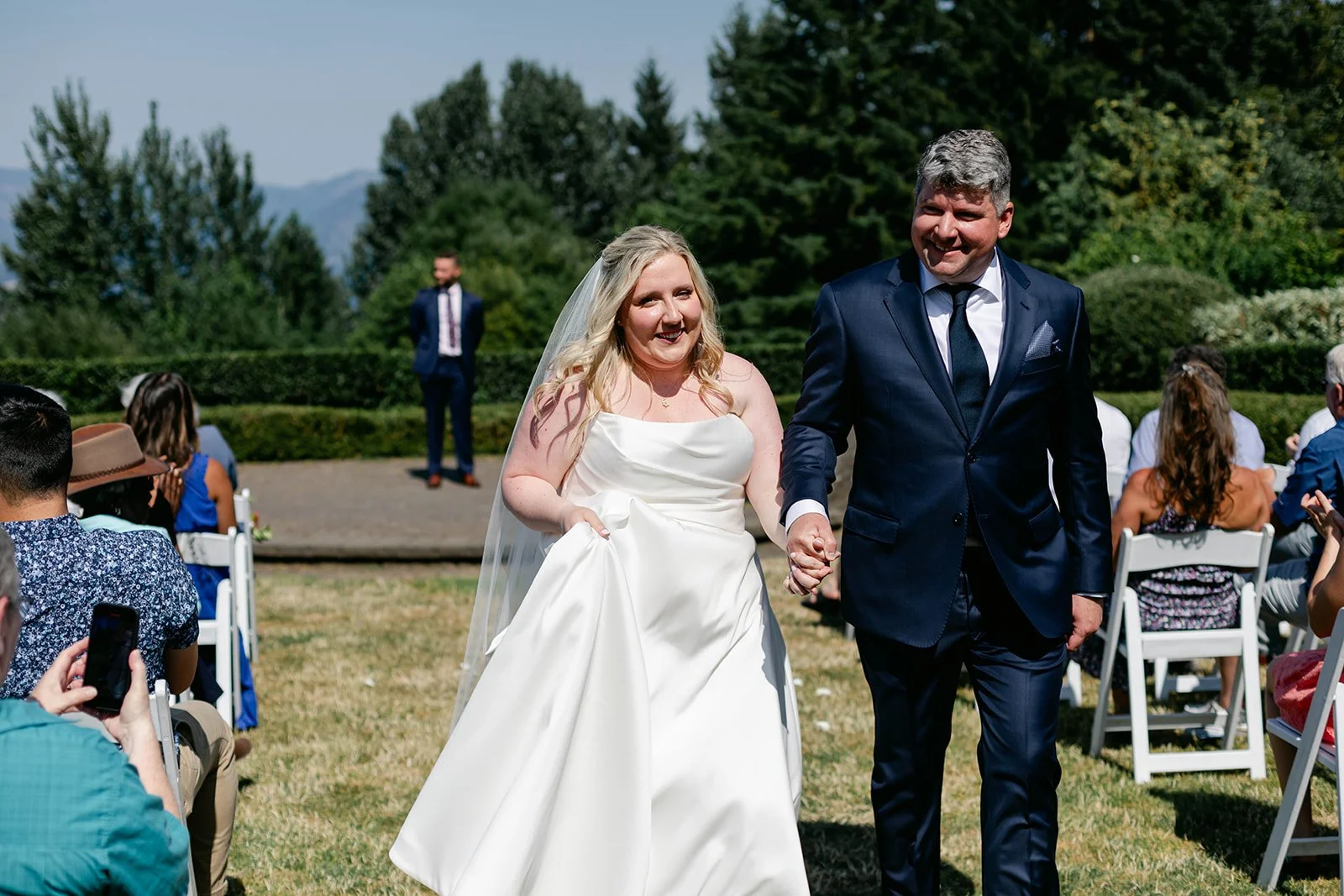 The ceremony itself was held on Skamania's iconic lawn, with the Cascade mountains rolling out behind them, and guests gathered under a wide-open blue sky. It was the kind of view that makes you stop mid-sentence. After they were pronounced married, the two walked back up the aisle, absolutely beaming — you couldn't wipe the smiles off their faces if you tried.