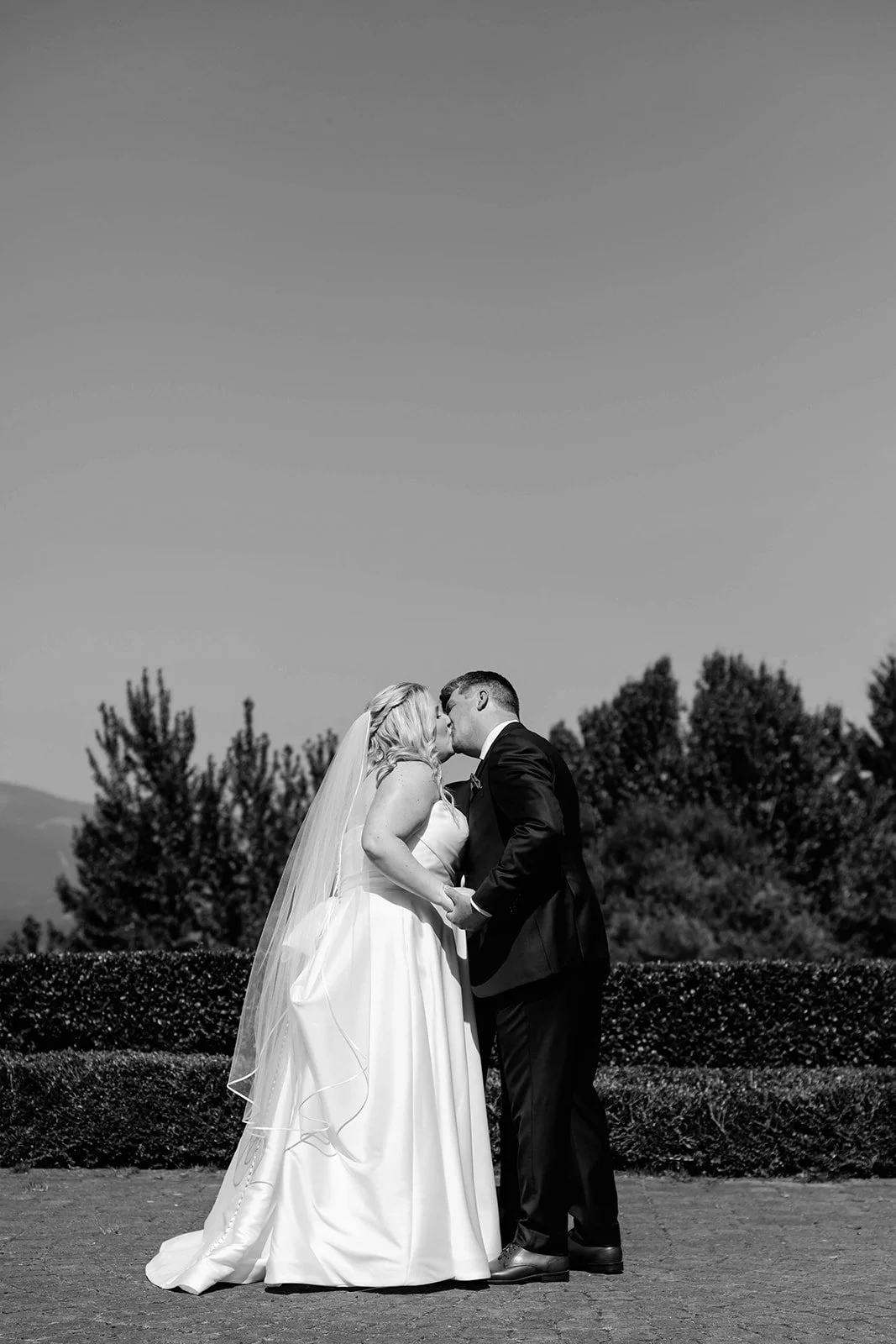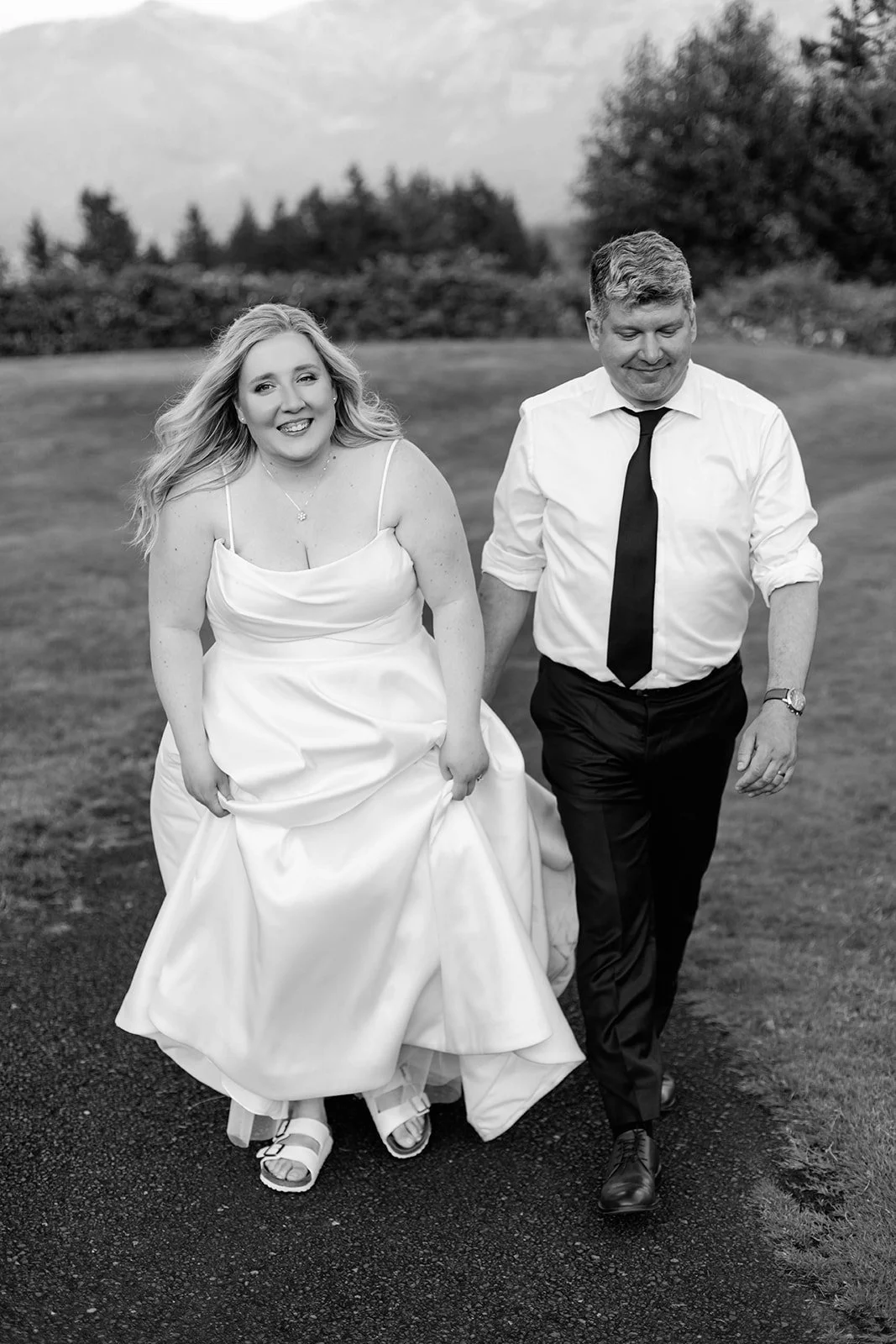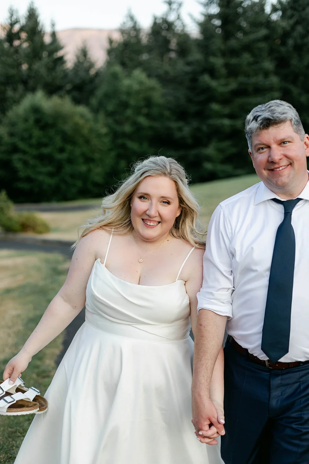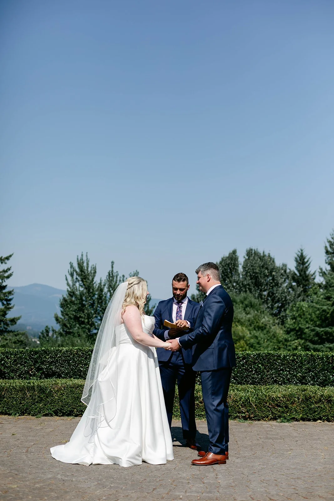 The ceremony itself was held on Skamania's iconic lawn, with the Cascade mountains rolling out behind them, and guests gathered under a wide-open blue sky. It was the kind of view that makes you stop mid-sentence. After they were pronounced married, the two walked back up the aisle, absolutely beaming — you couldn't wipe the smiles off their faces if you tried.