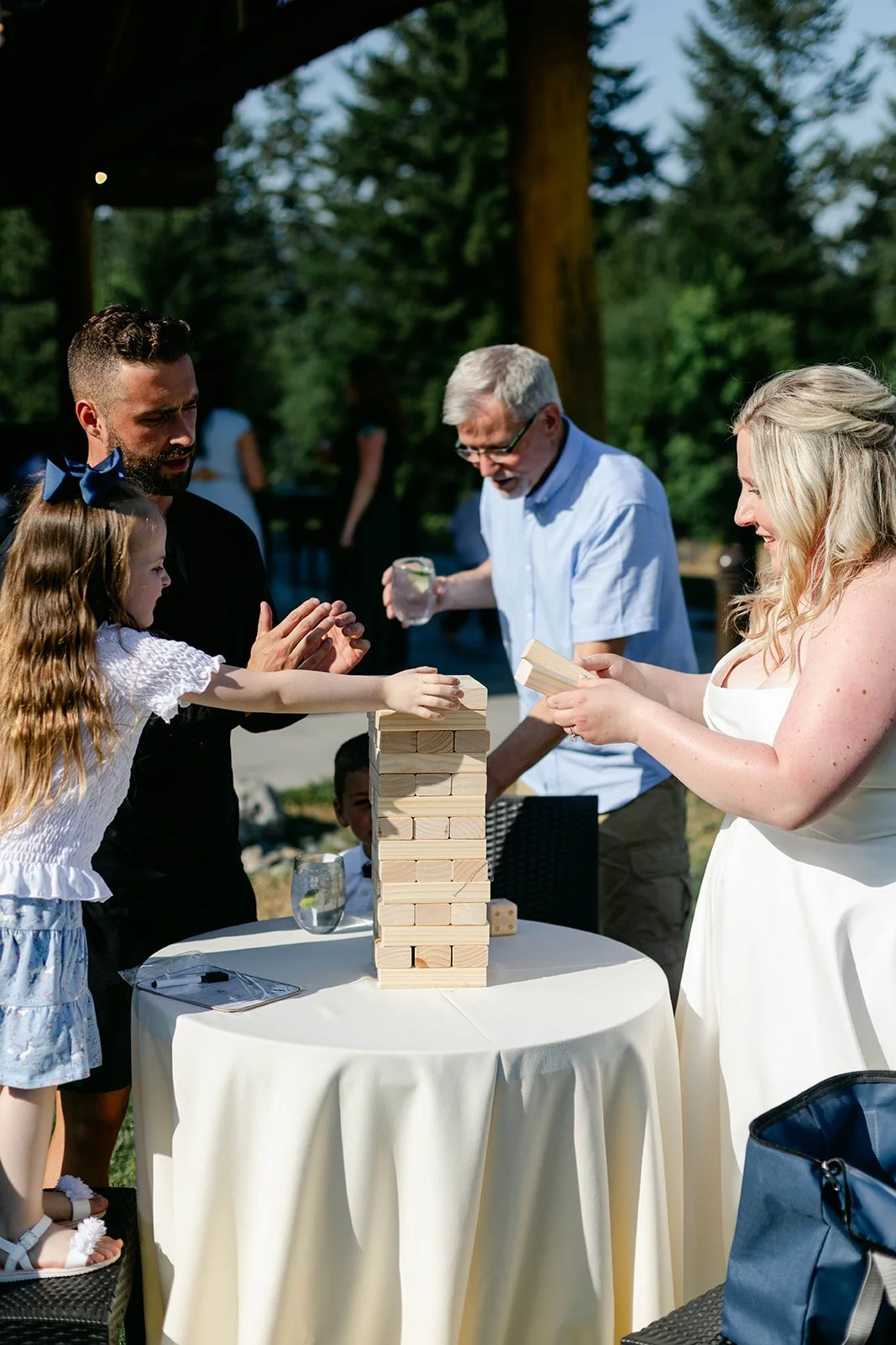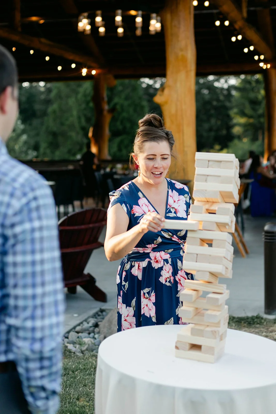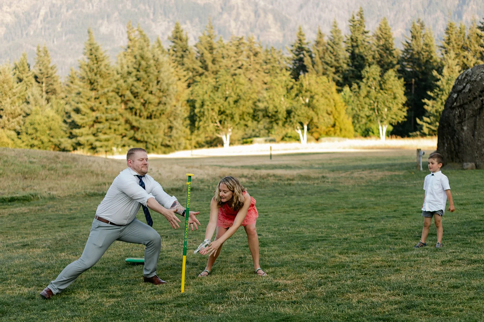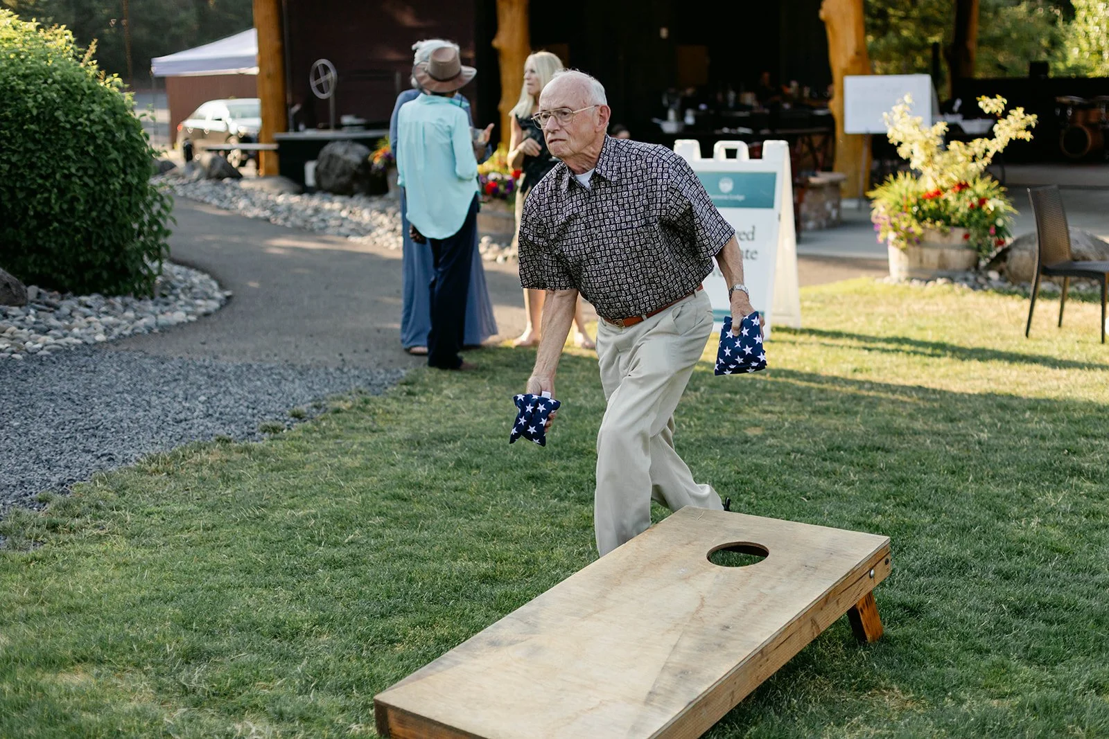 The reception flowed out onto the lodge's open-air pavilion, with those stunning mountain and river views stretching out beyond every table. Guests played cornhole and Kan Jam on the lawn in the evening light, and there was something genuinely joyful about seeing everyone — grandparents, kids, old friends — all just having the best time together.