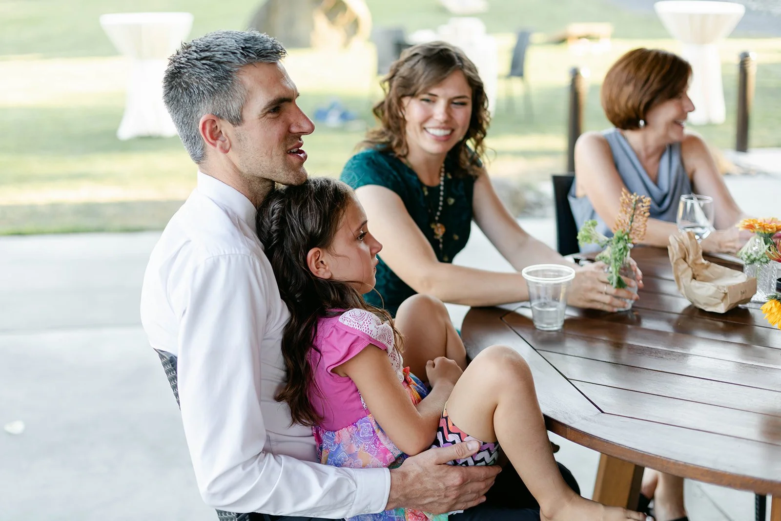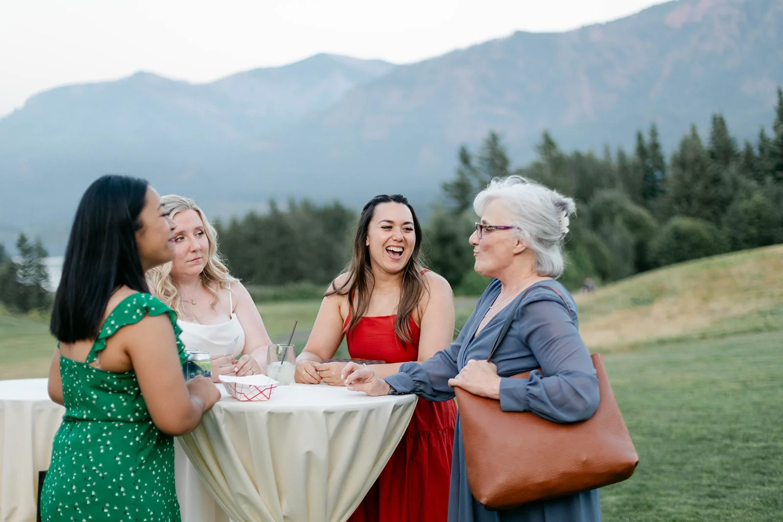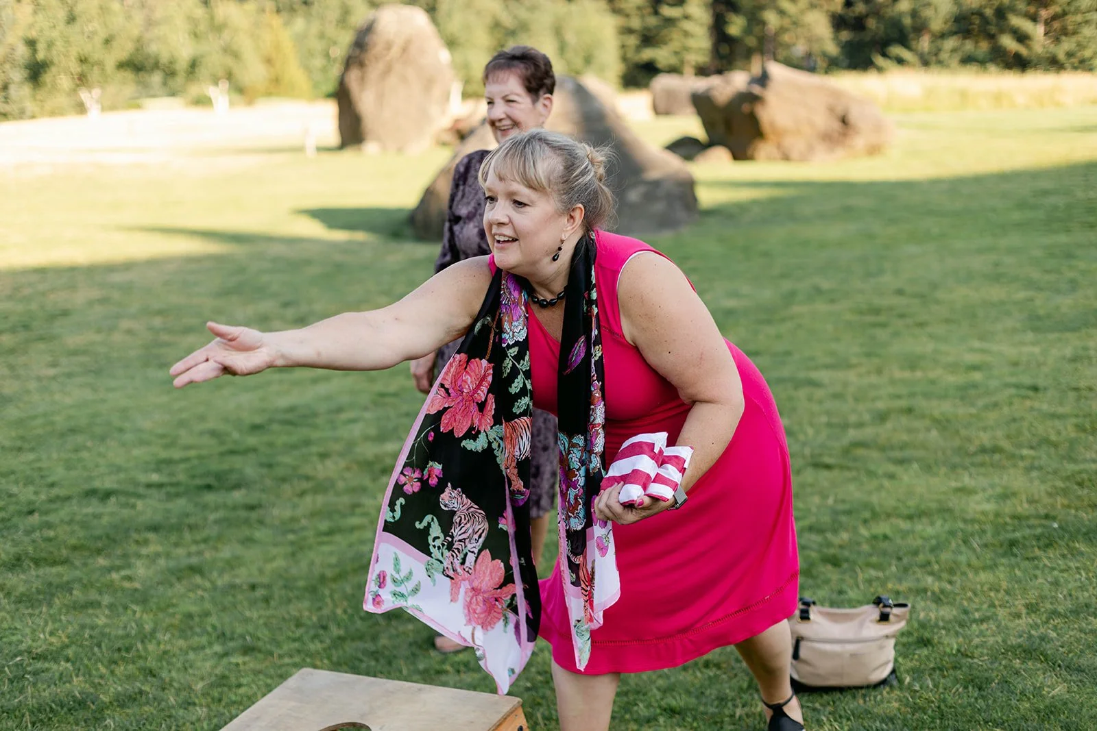 The reception flowed out onto the lodge's open-air pavilion, with those stunning mountain and river views stretching out beyond every table. Guests played cornhole and Kan Jam on the lawn in the evening light, and there was something genuinely joyful about seeing everyone — grandparents, kids, old friends — all just having the best time together.
