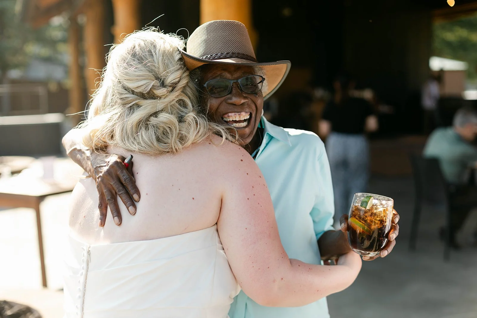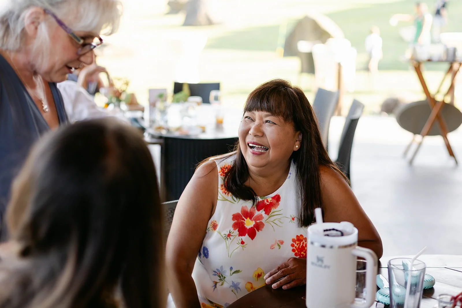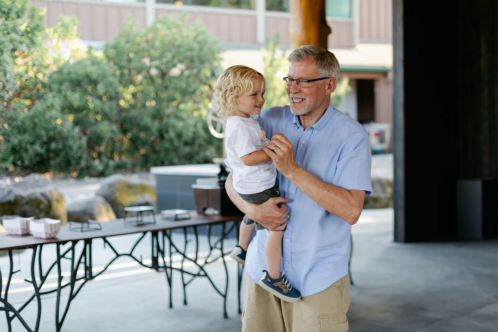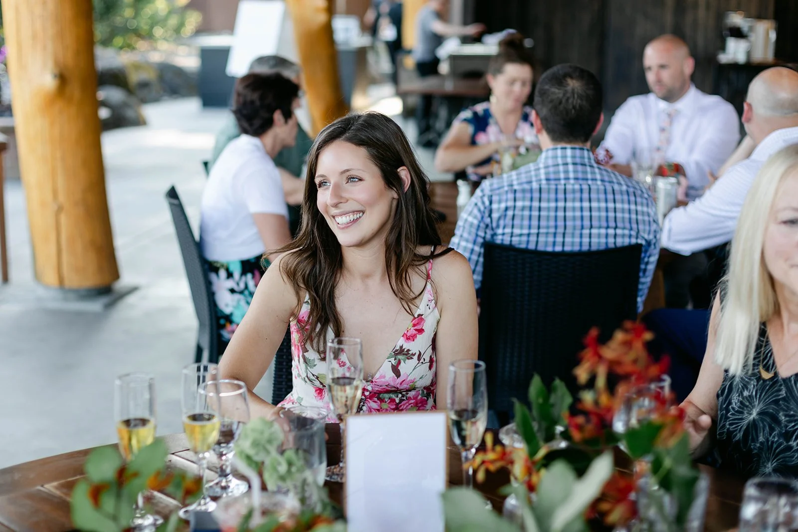 The reception flowed out onto the lodge's open-air pavilion, with those stunning mountain and river views stretching out beyond every table. Guests played cornhole and Kan Jam on the lawn in the evening light, and there was something genuinely joyful about seeing everyone — grandparents, kids, old friends — all just having the best time together.