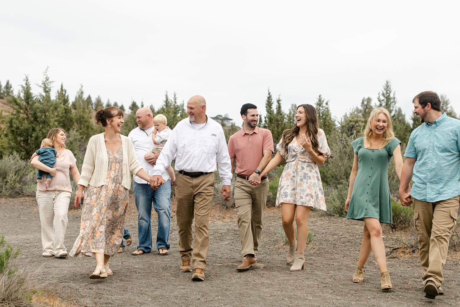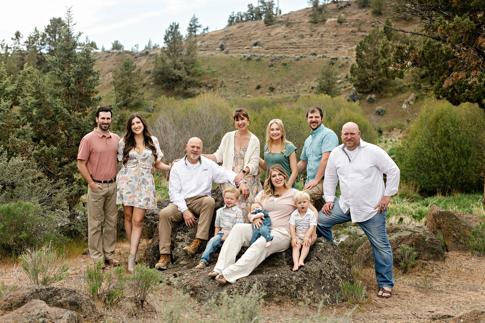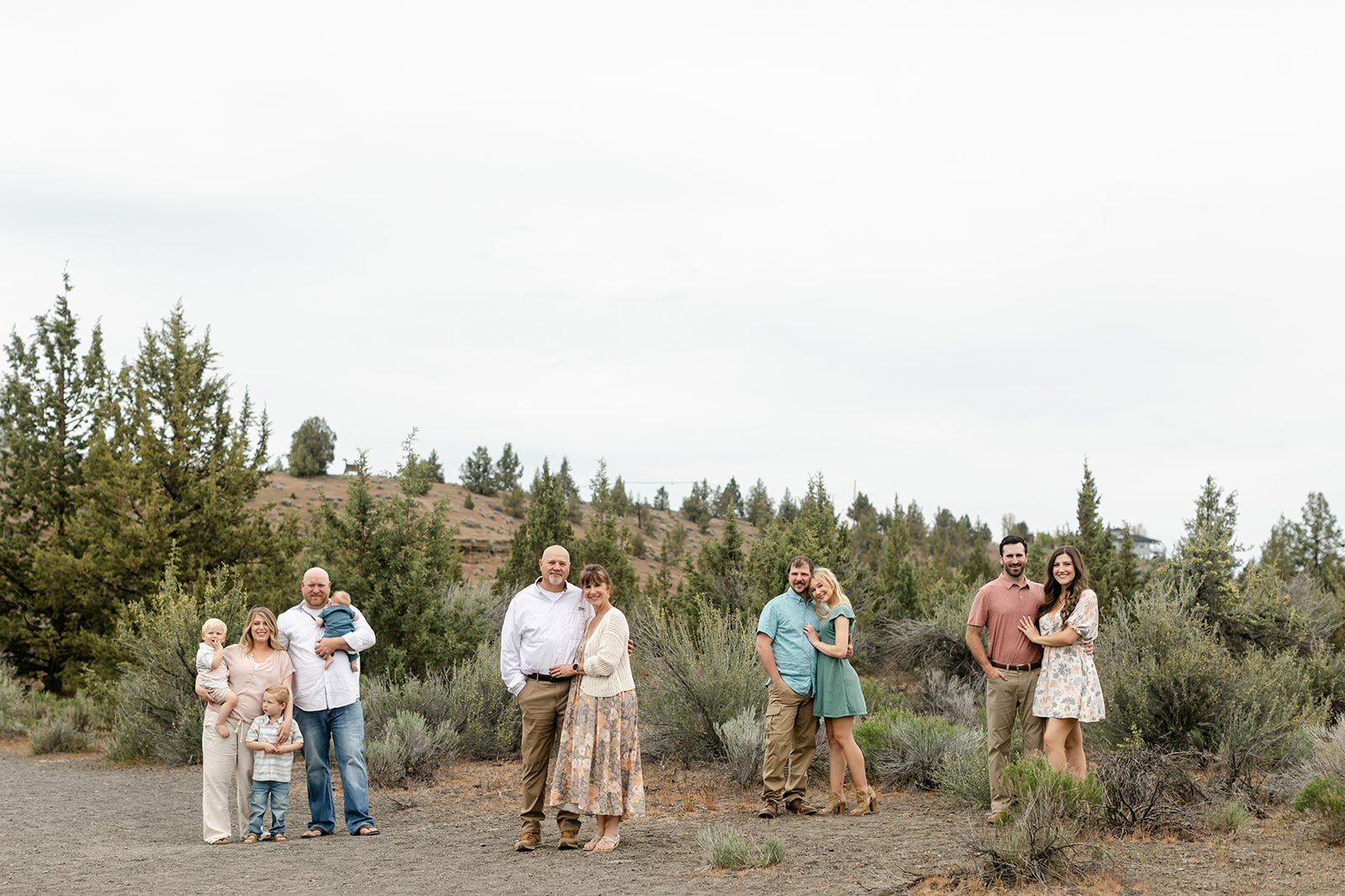 This time it was all about the Coopers — Sami's side of the family. Her parents stood at the center of it all, surrounded by their adult children, partners, and grandkids ranging from babies in arms to toddlers doing exactly what toddlers do during photo sessions. The setting was quintessential Central Oregon: wide open high desert sky, ponderosa pines, sagebrush, and those warm ochre hillsides in the distance that remind you exactly where you are. It is one of those locations that does a lot of the work for you.