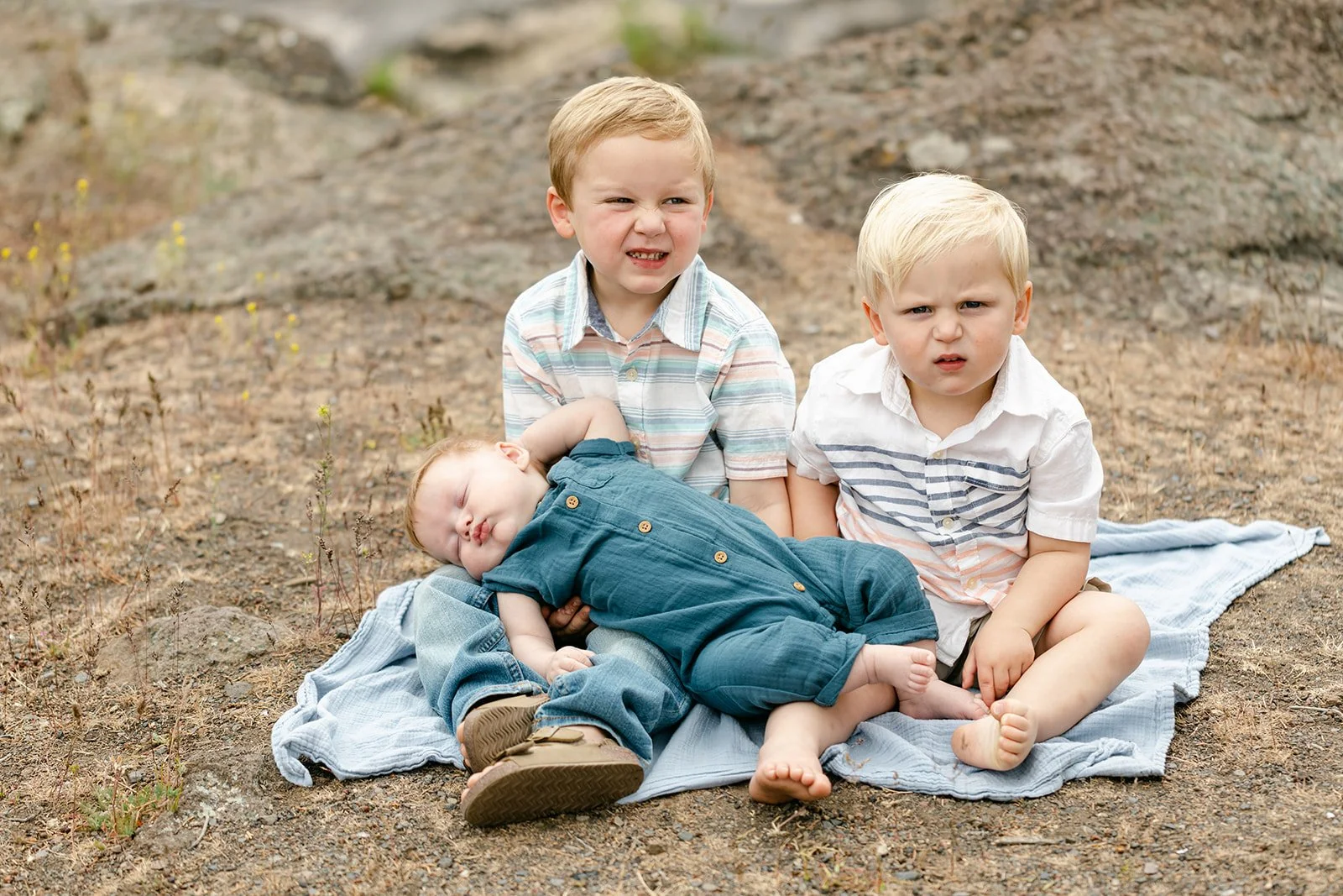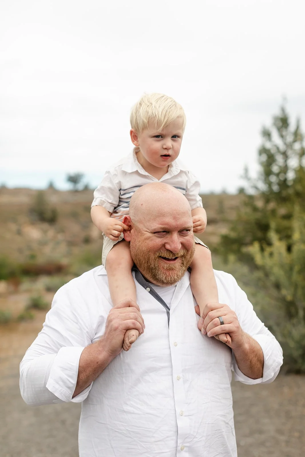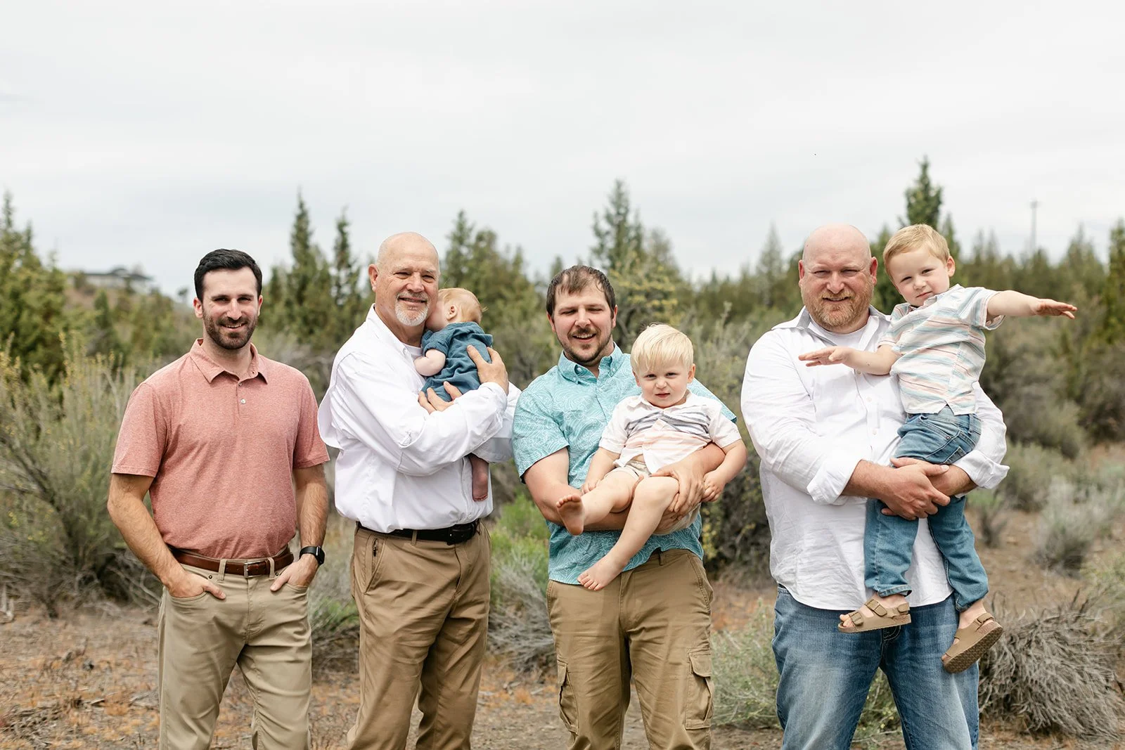 This time it was all about the Coopers — Sami's side of the family. Her parents stood at the center of it all, surrounded by their adult children, partners, and grandkids ranging from babies in arms to toddlers doing exactly what toddlers do during photo sessions. The setting was quintessential Central Oregon: wide open high desert sky, ponderosa pines, sagebrush, and those warm ochre hillsides in the distance that remind you exactly where you are. It is one of those locations that does a lot of the work for you.