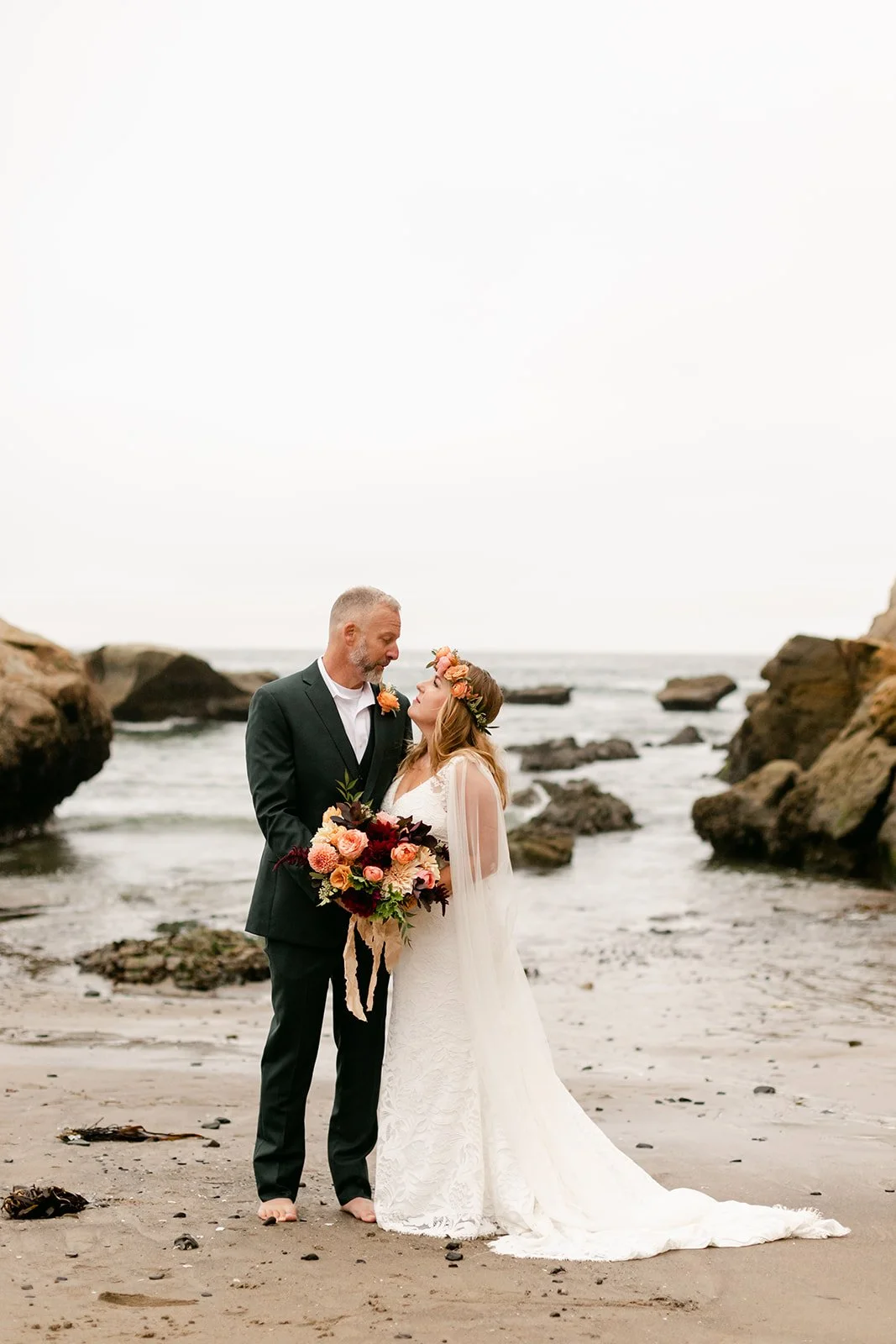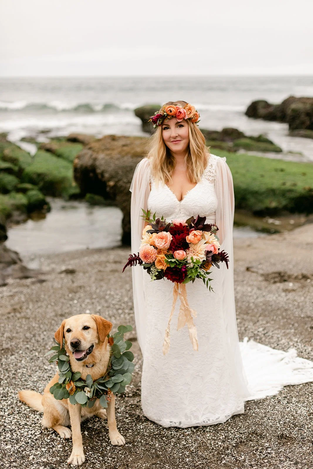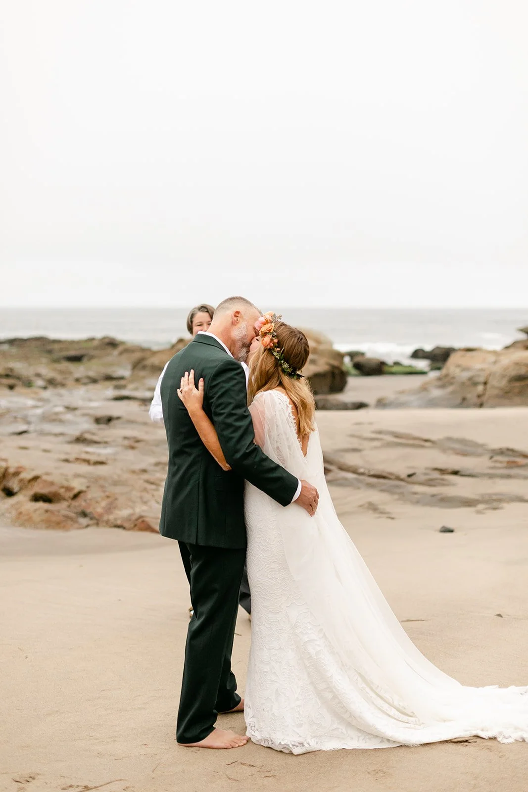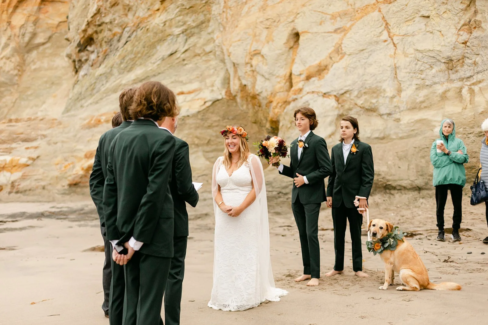 The ceremony happened at the water's edge, barefoot, with the Pacific stretching out behind them. No shoes, no stage, no fuss — just the two of them, their four sons standing close, a small circle of the people they love most, and the sound of the ocean doing what it always does. Their dog was there too, wearing a flower crown and taking the whole thing very seriously. It was perfect.