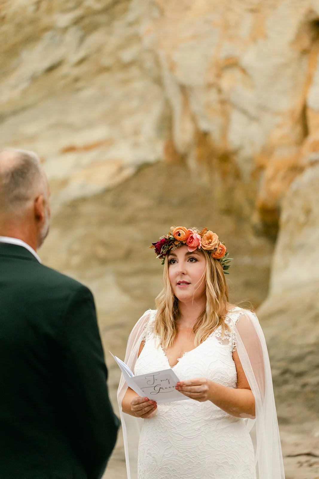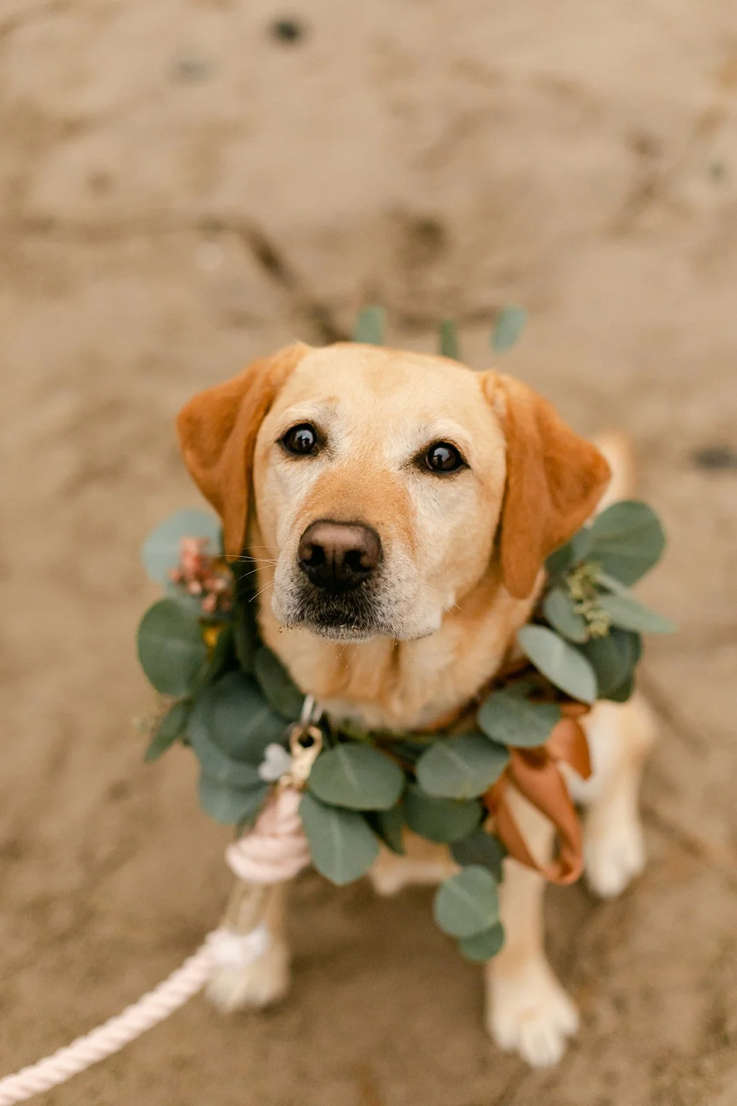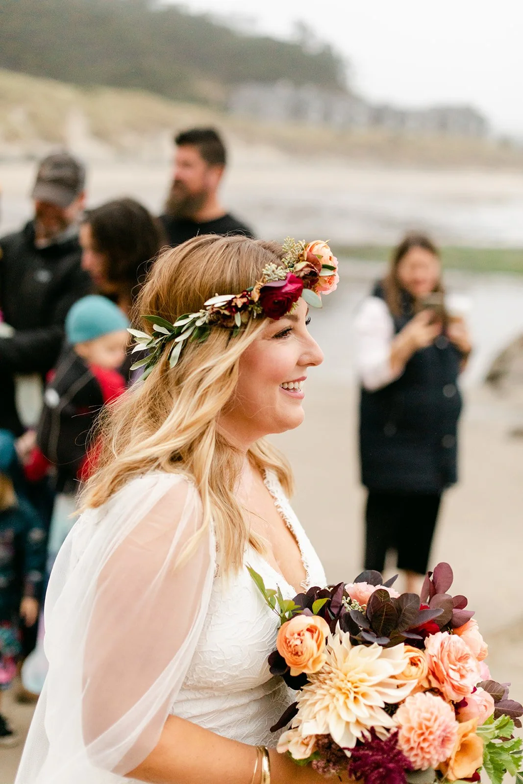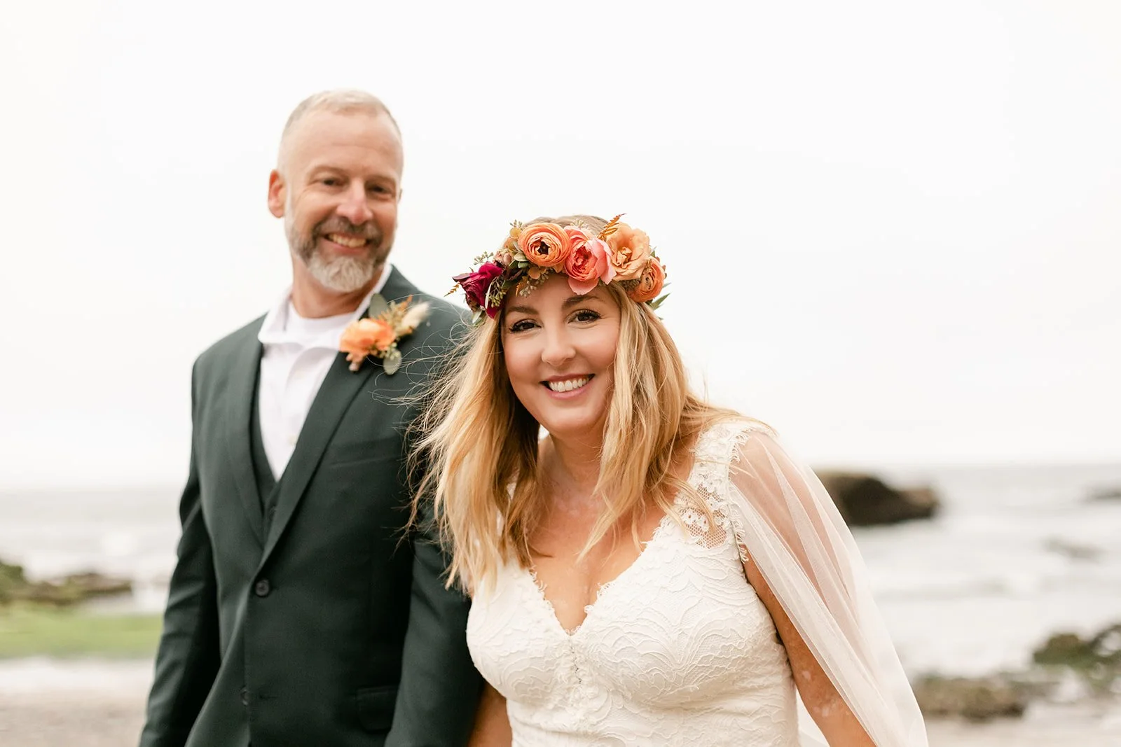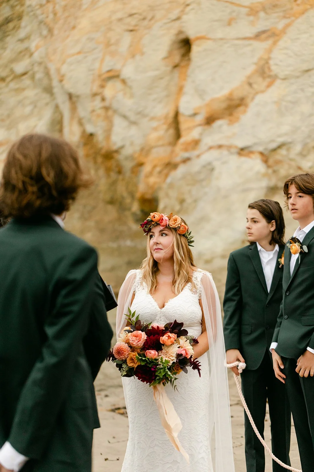The ceremony happened at the water's edge, barefoot, with the Pacific stretching out behind them. No shoes, no stage, no fuss — just the two of them, their four sons standing close, a small circle of the people they love most, and the sound of the ocean doing what it always does. Their dog was there too, wearing a flower crown and taking the whole thing very seriously. It was perfect.