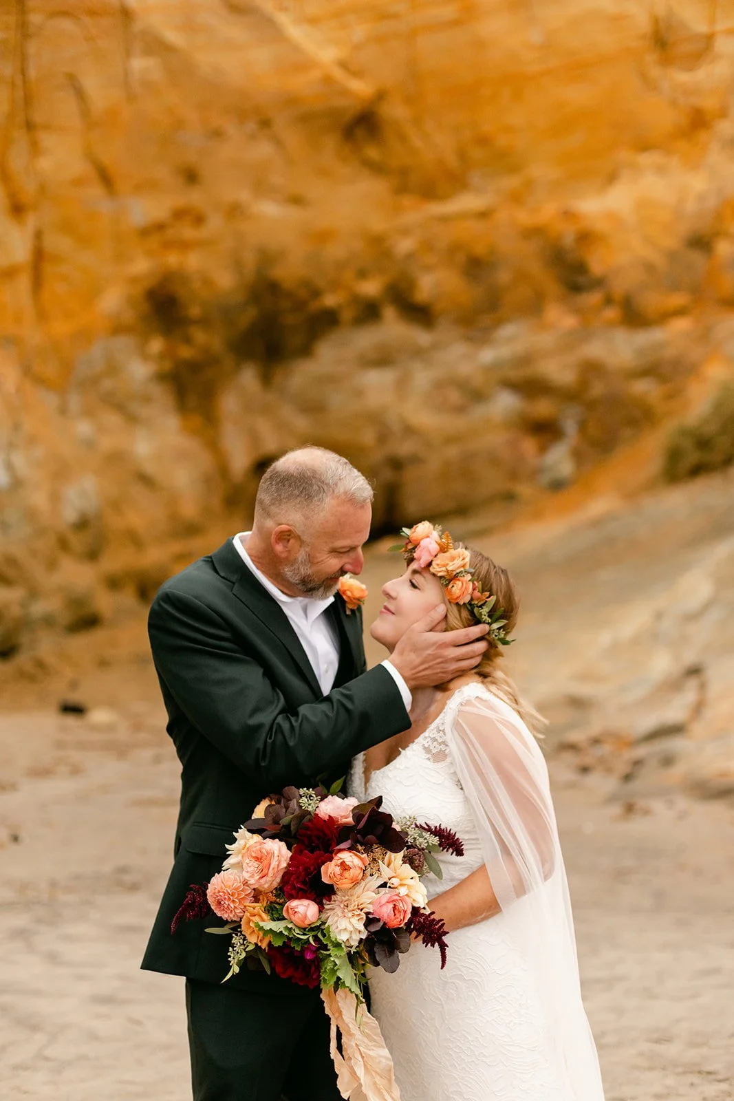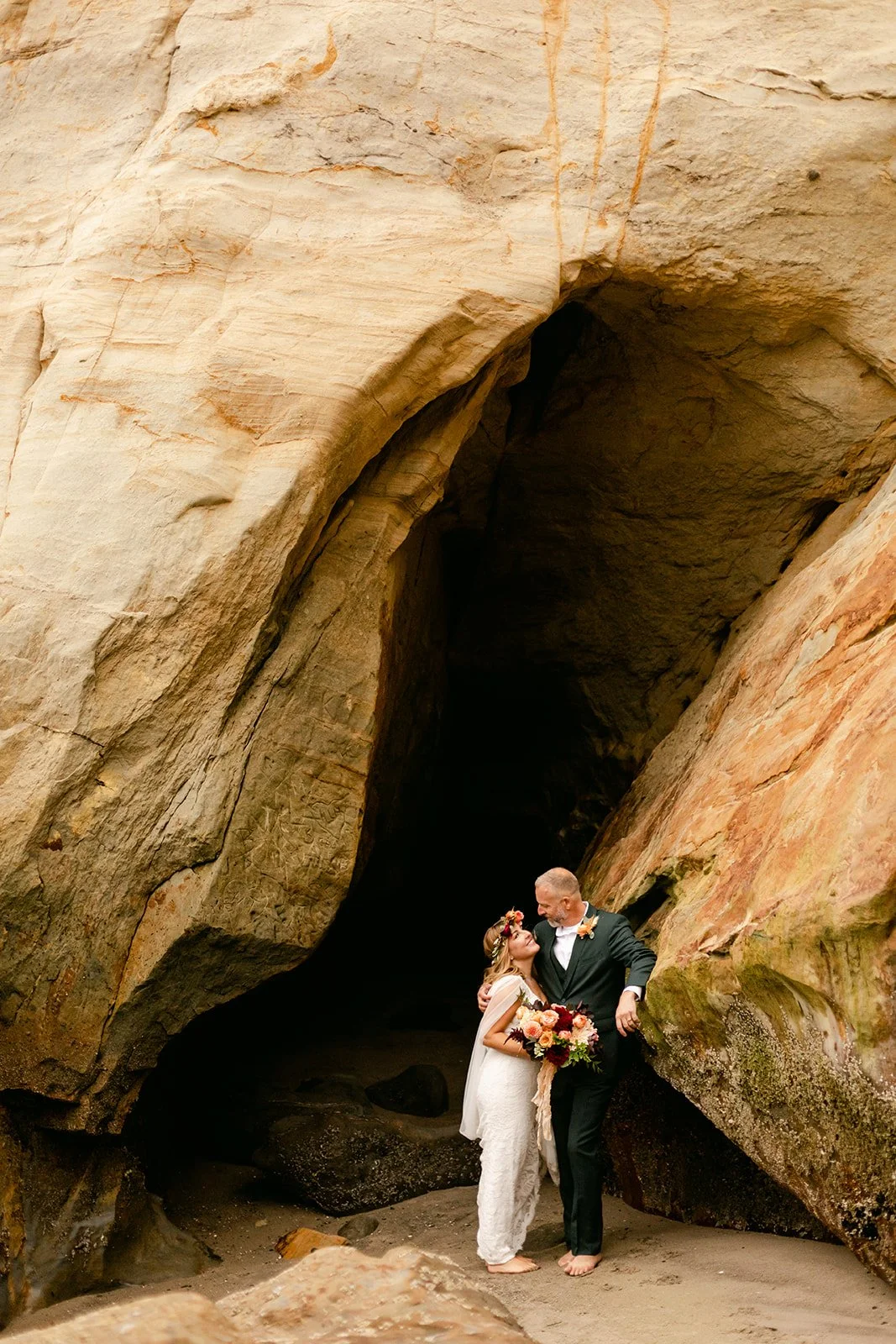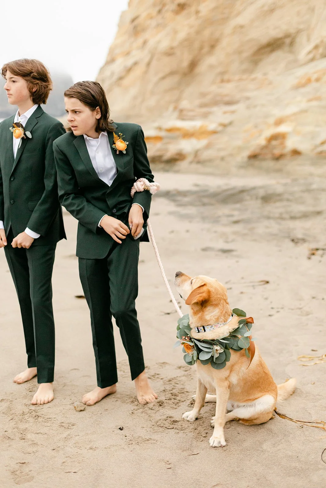 After the ceremony we wandered — across the sand, up into the dunes, through the sea caves carved into the rock face along the shore. The boys were game for everything, and there's something genuinely wonderful about doing portraits with a family that's already comfortable together. The dog was also game for everything, for the record, and arguably the most photogenic member of the group.