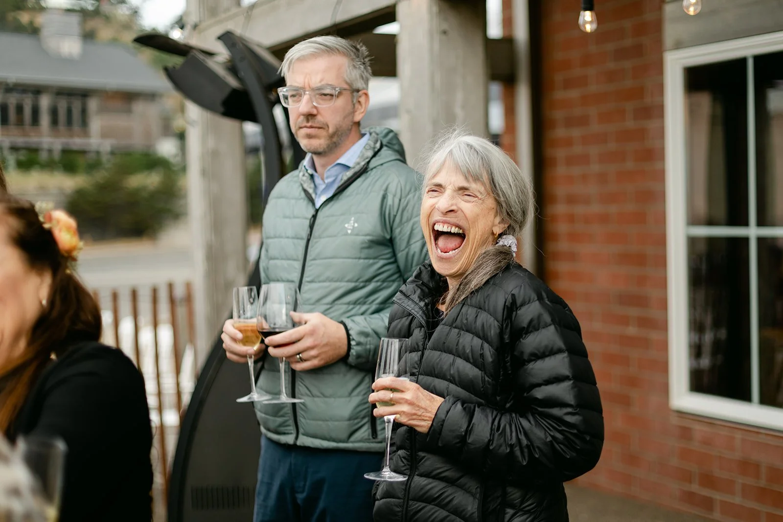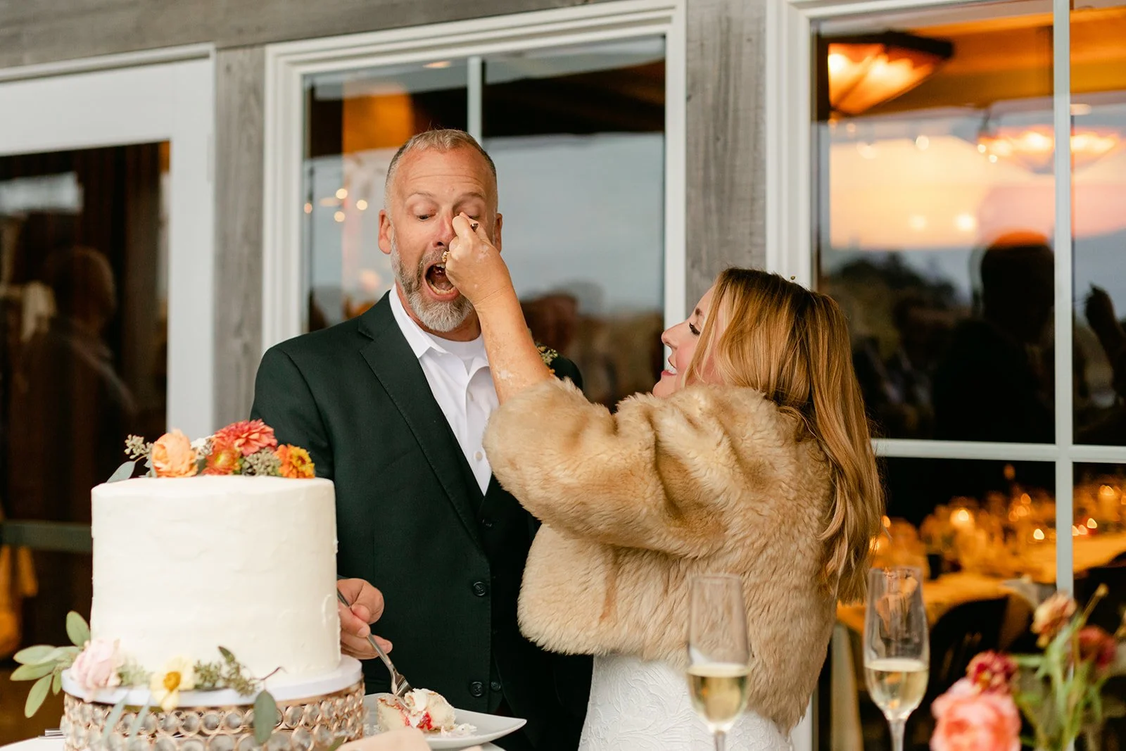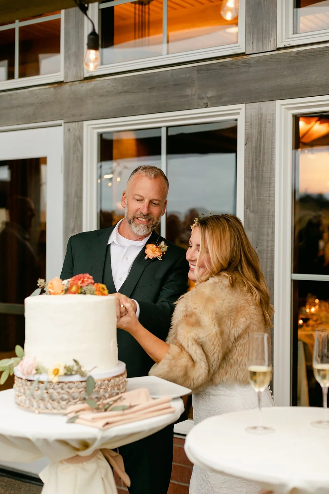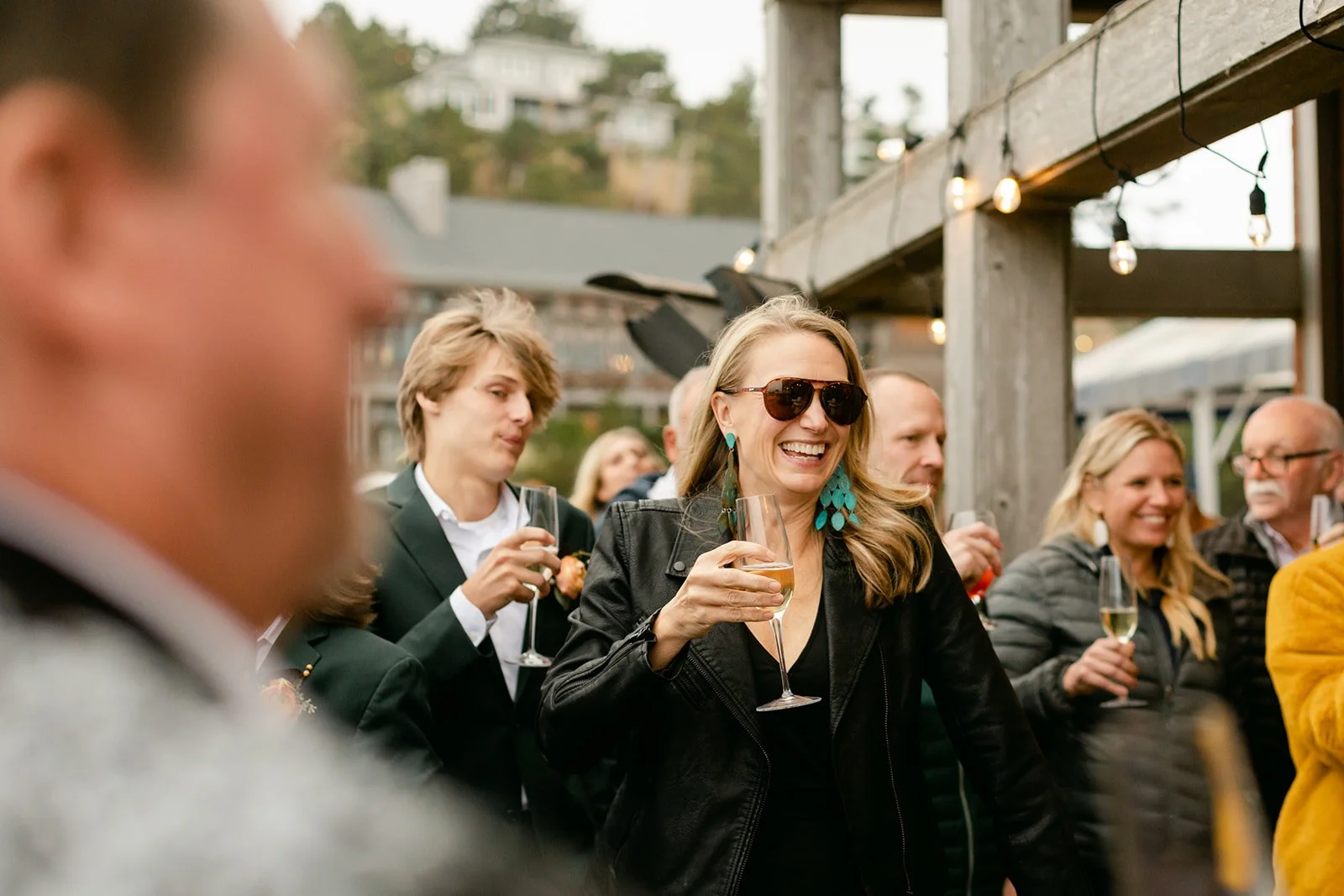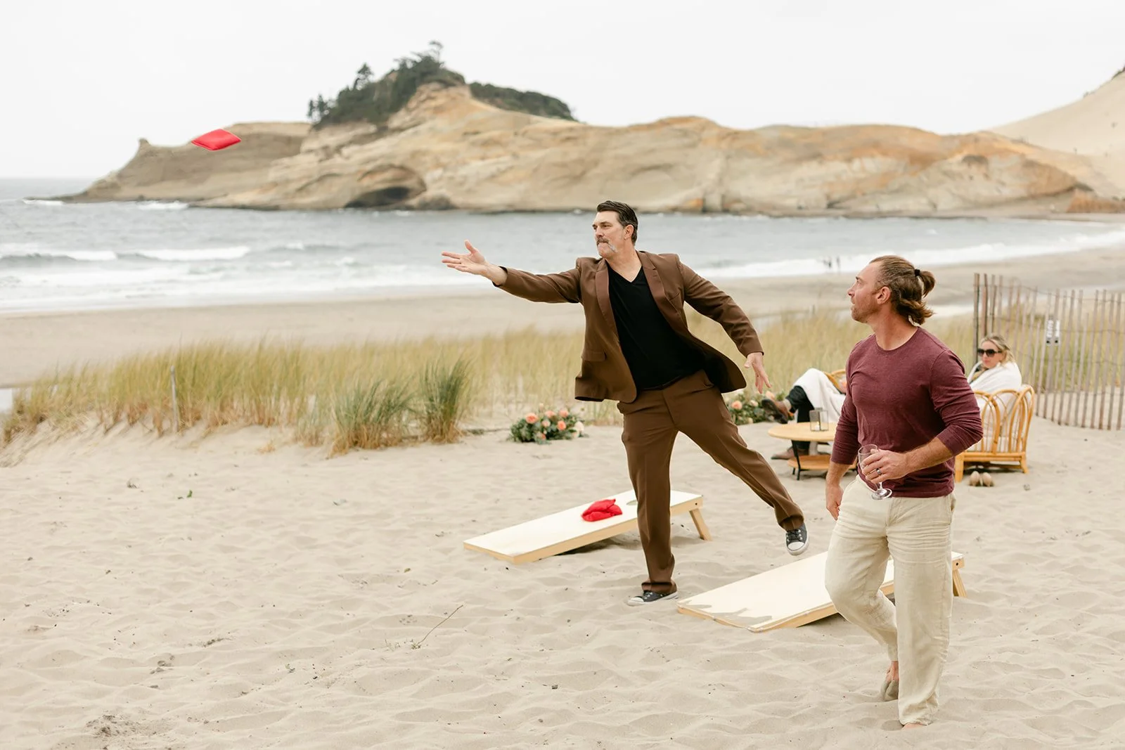 The reception moved inside to Pelican Brewing's beautiful dining room, which manages to feel warm and intimate even with the full expanse of the Pacific visible through the windows. The menu was a proper surf and turf — the kind of meal that makes you slow down and actually pay attention to what you're eating. Between courses, guests spilled out onto the patio overlooking the ocean for cornhole and conversation, champagne in hand, the afternoon light going golden over the water.