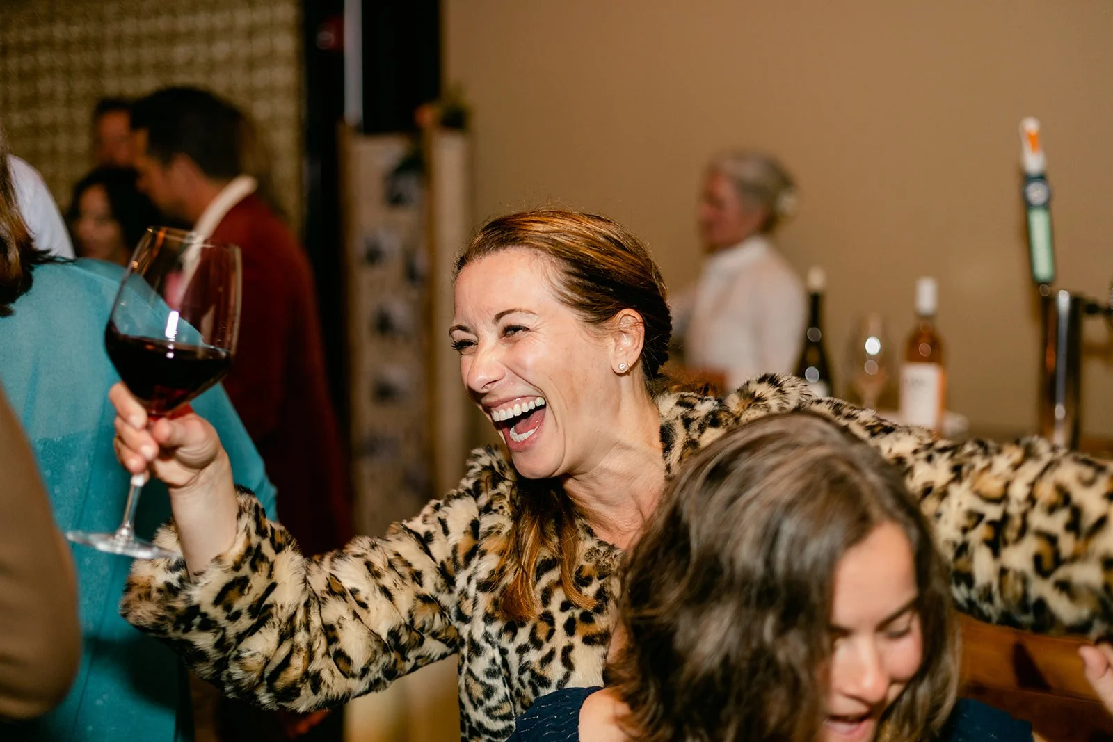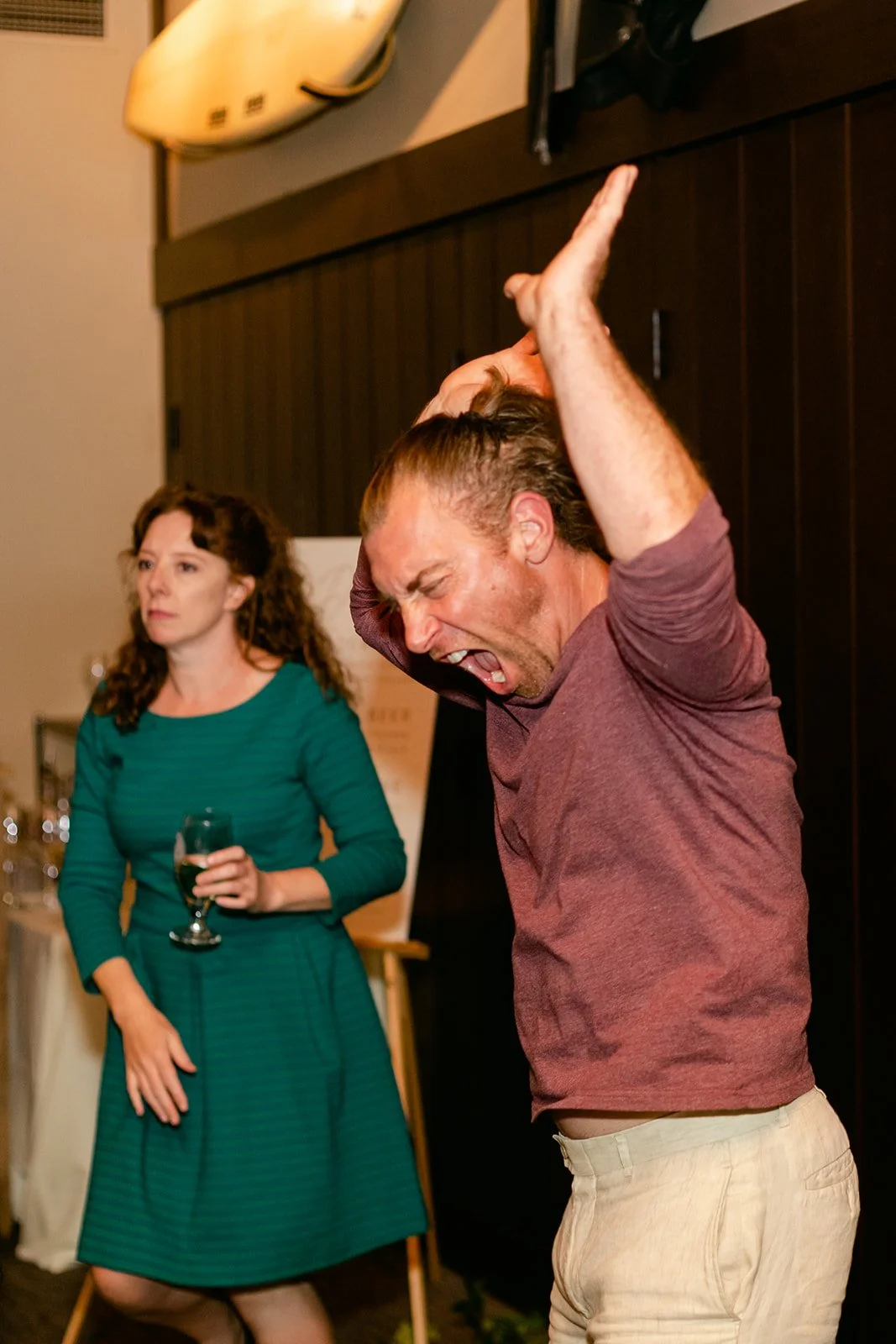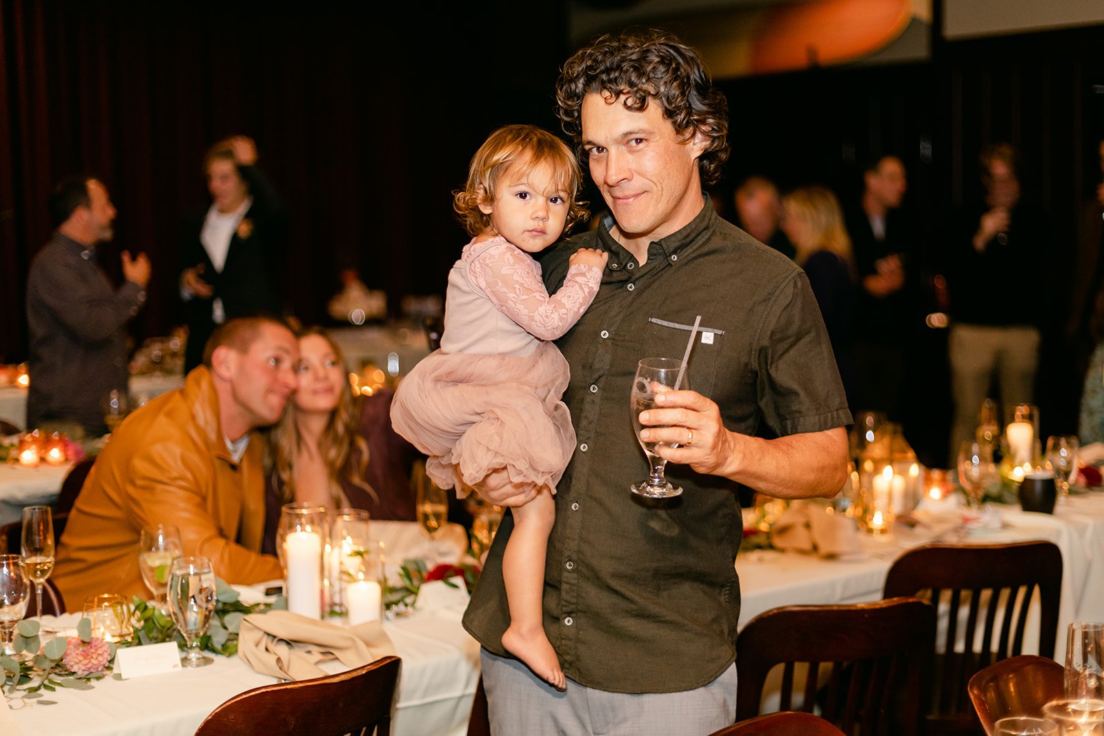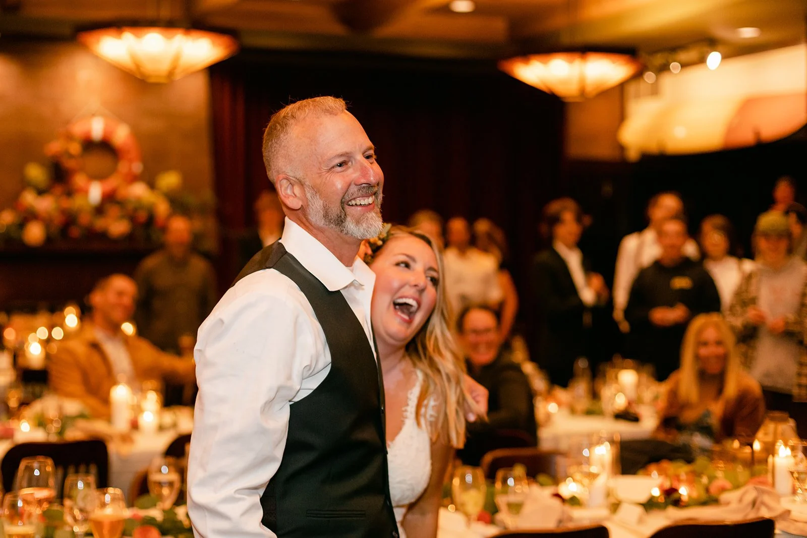 The reception moved inside to Pelican Brewing's beautiful dining room, which manages to feel warm and intimate even with the full expanse of the Pacific visible through the windows. The menu was a proper surf and turf — the kind of meal that makes you slow down and actually pay attention to what you're eating. Between courses, guests spilled out onto the patio overlooking the ocean for cornhole and conversation, champagne in hand, the afternoon light going golden over the water.