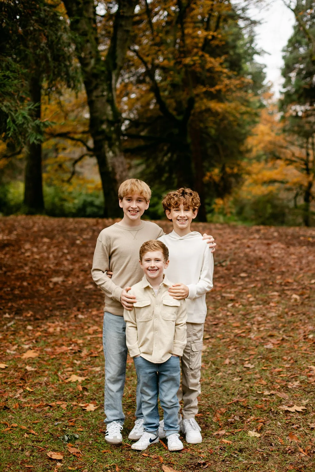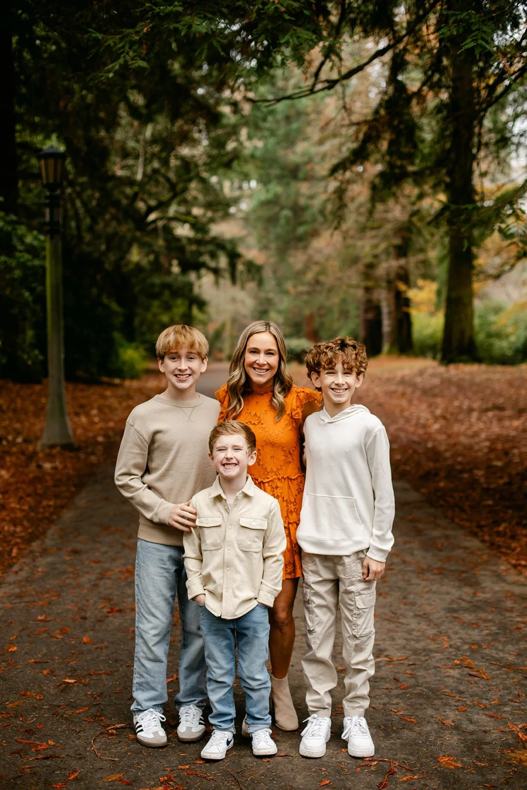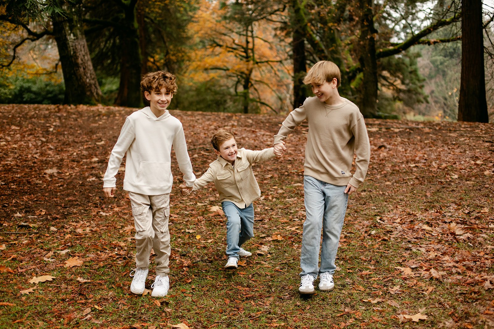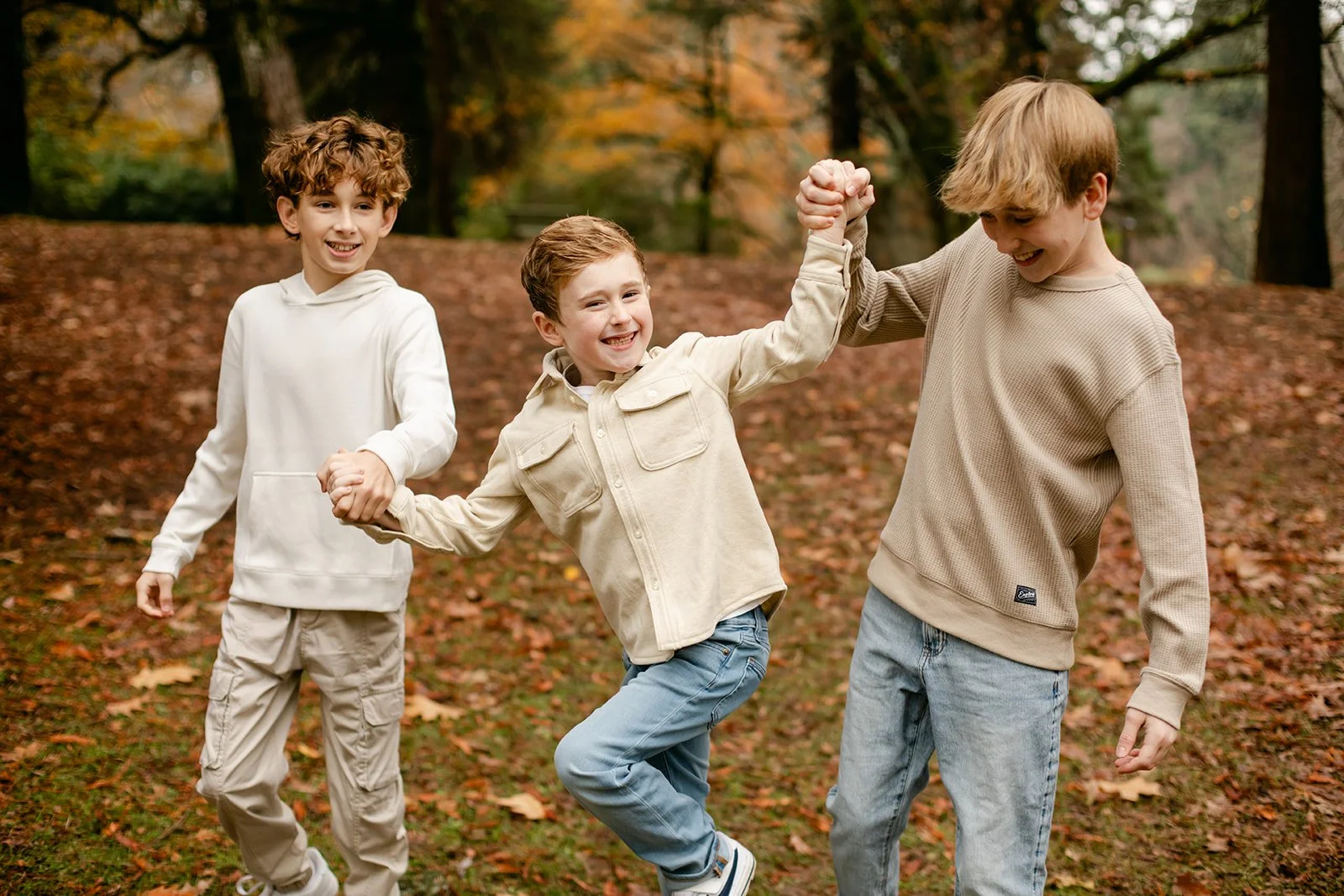 Laurelhurst is one of those Portland gems that earns its reputation every fall. Towering trees, open lawns blanketed in rust and amber, winding paths that beg to be walked — it's a natural studio that does half the work for you. On an overcast afternoon, the muted light wraps everything in this soft, even glow that's almost impossible to replicate any other way. The boys didn't care about any of that, of course. They were too busy seeing who could jump the highest.