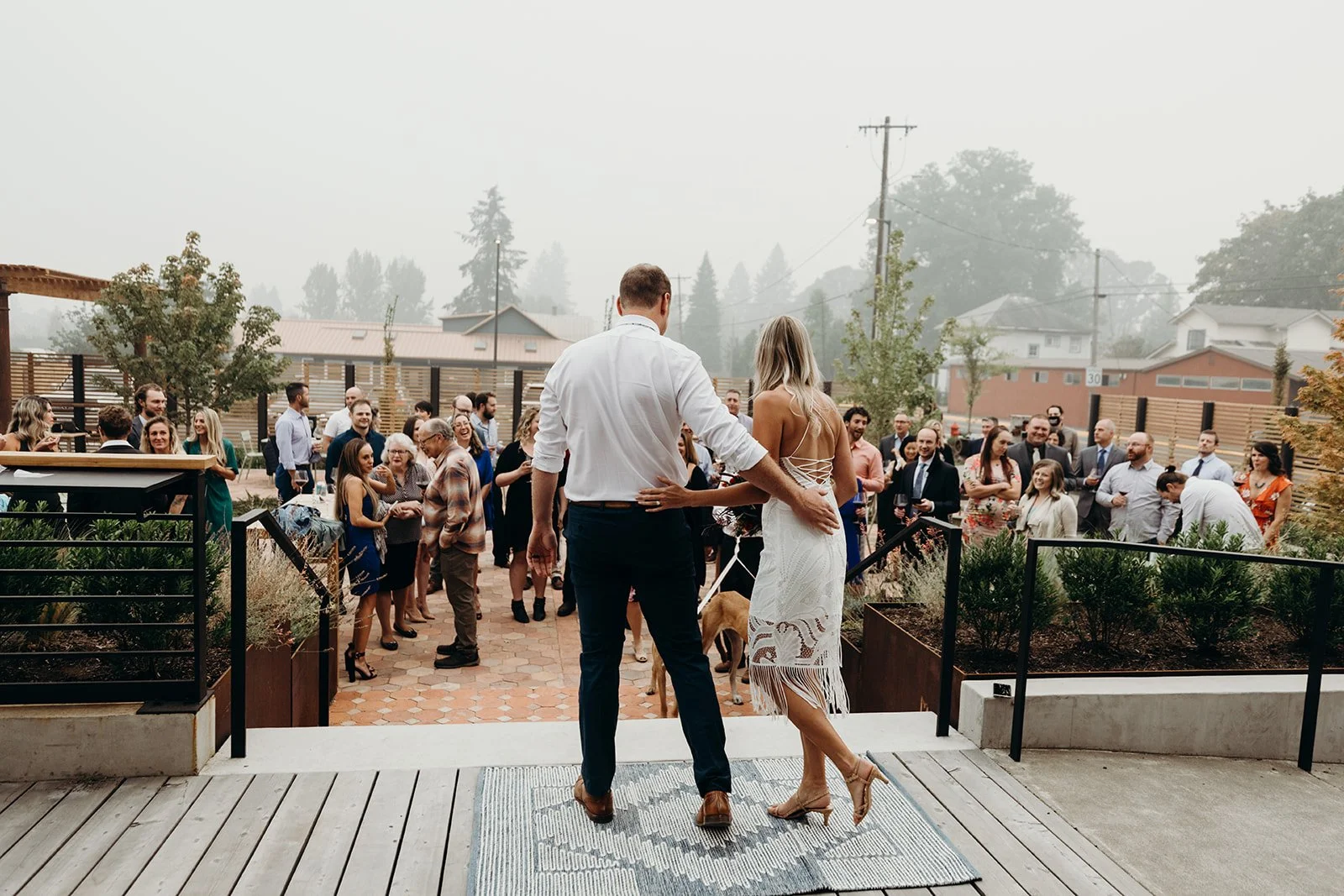 From there, the day moved to Carlton Grain Elevator for the ceremony and reception. Their great danes were there. There was a charcuterie spread so long it practically needed its own zip code: prosciutto, cheese, olives, roasted peppers, cured meats layered over reclaimed wood boards end to end. The inside of the venue glowed navy and warm wood and Edison bulbs and bottles of Pinot lined up like little soldiers. It was the kind of place that felt like it had been waiting its whole life to host exactly this kind of night.