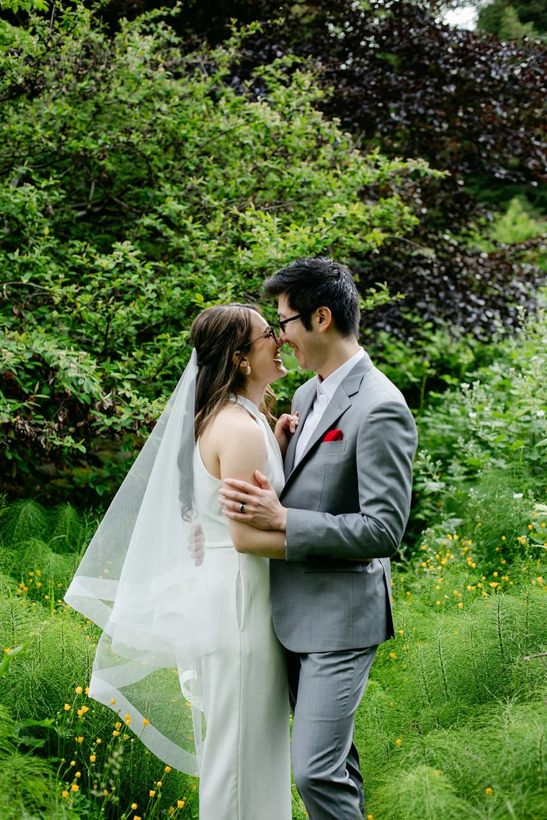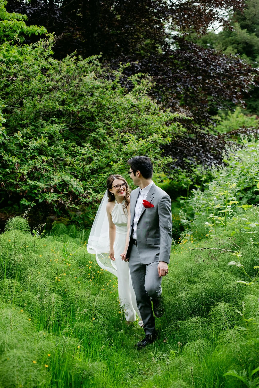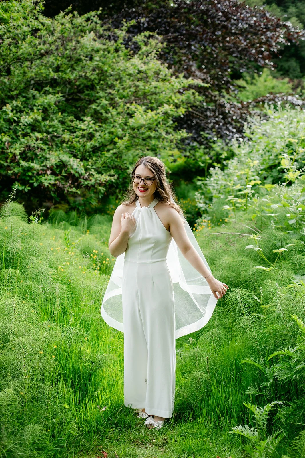 Rachel showed up in a stunning white halter bridal jumpsuit — sleek, modern, completely confident, and honestly one of the most refreshing bridal looks I've ever photographed. Red lips, glasses, a flowing veil, and the biggest smile. Andrew was sharp in a grey suit with a red pocket square.