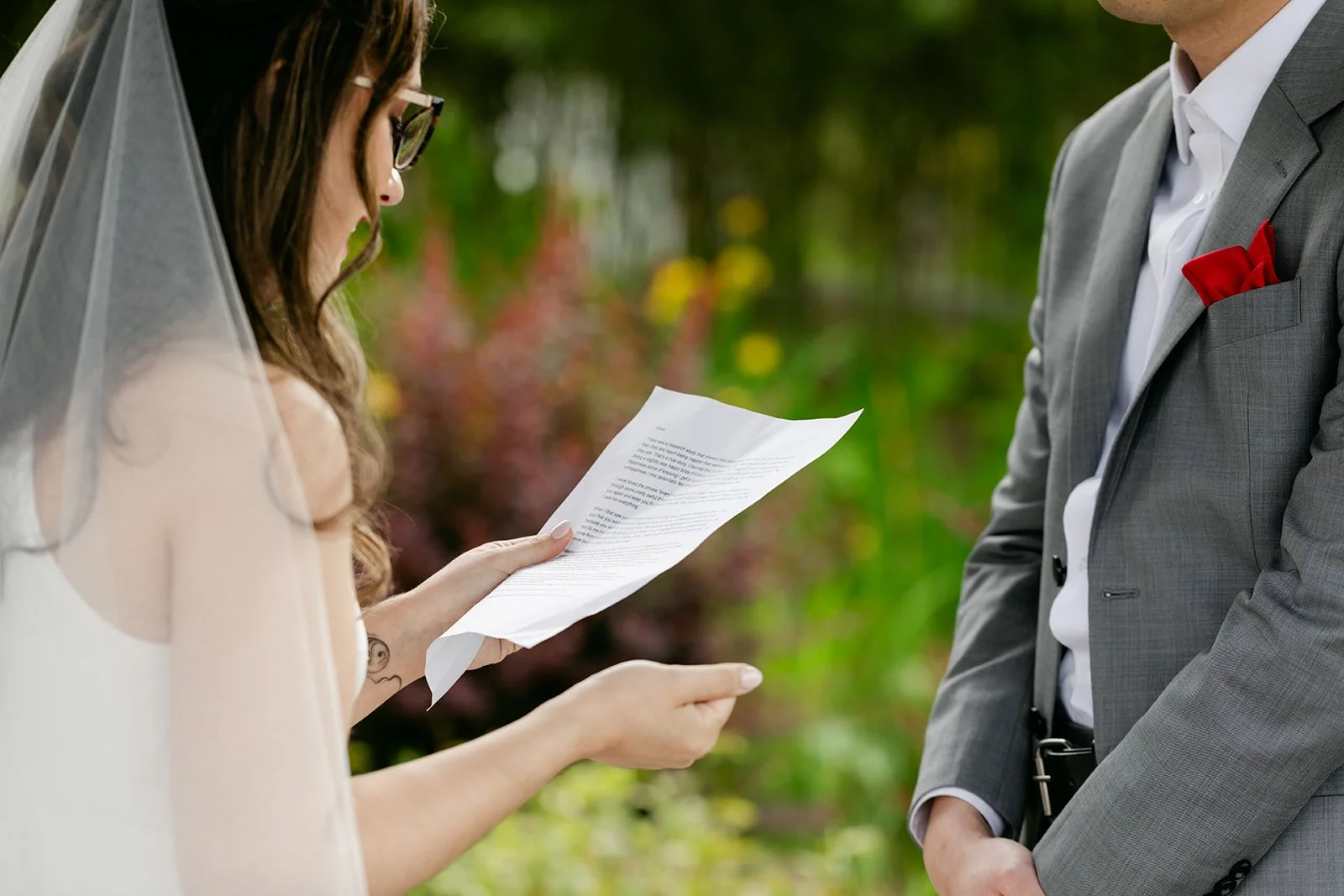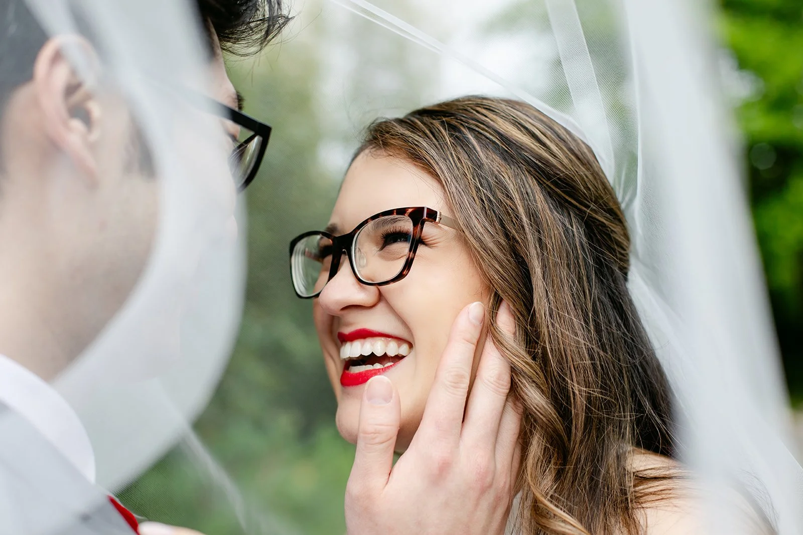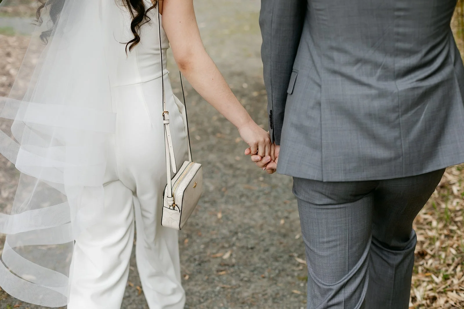 Rachel showed up in a stunning white halter bridal jumpsuit — sleek, modern, completely confident, and honestly one of the most refreshing bridal looks I've ever photographed. Red lips, glasses, a flowing veil, and the biggest smile. Andrew was sharp in a grey suit with a red pocket square.