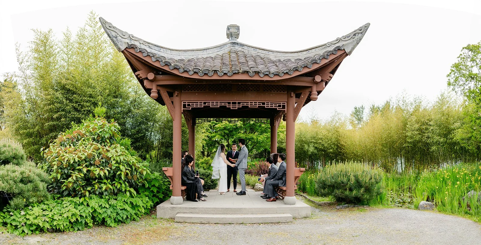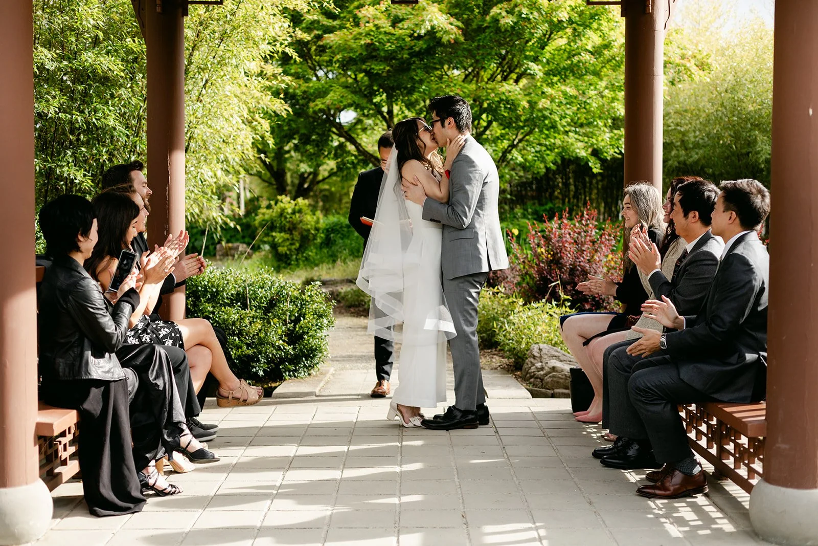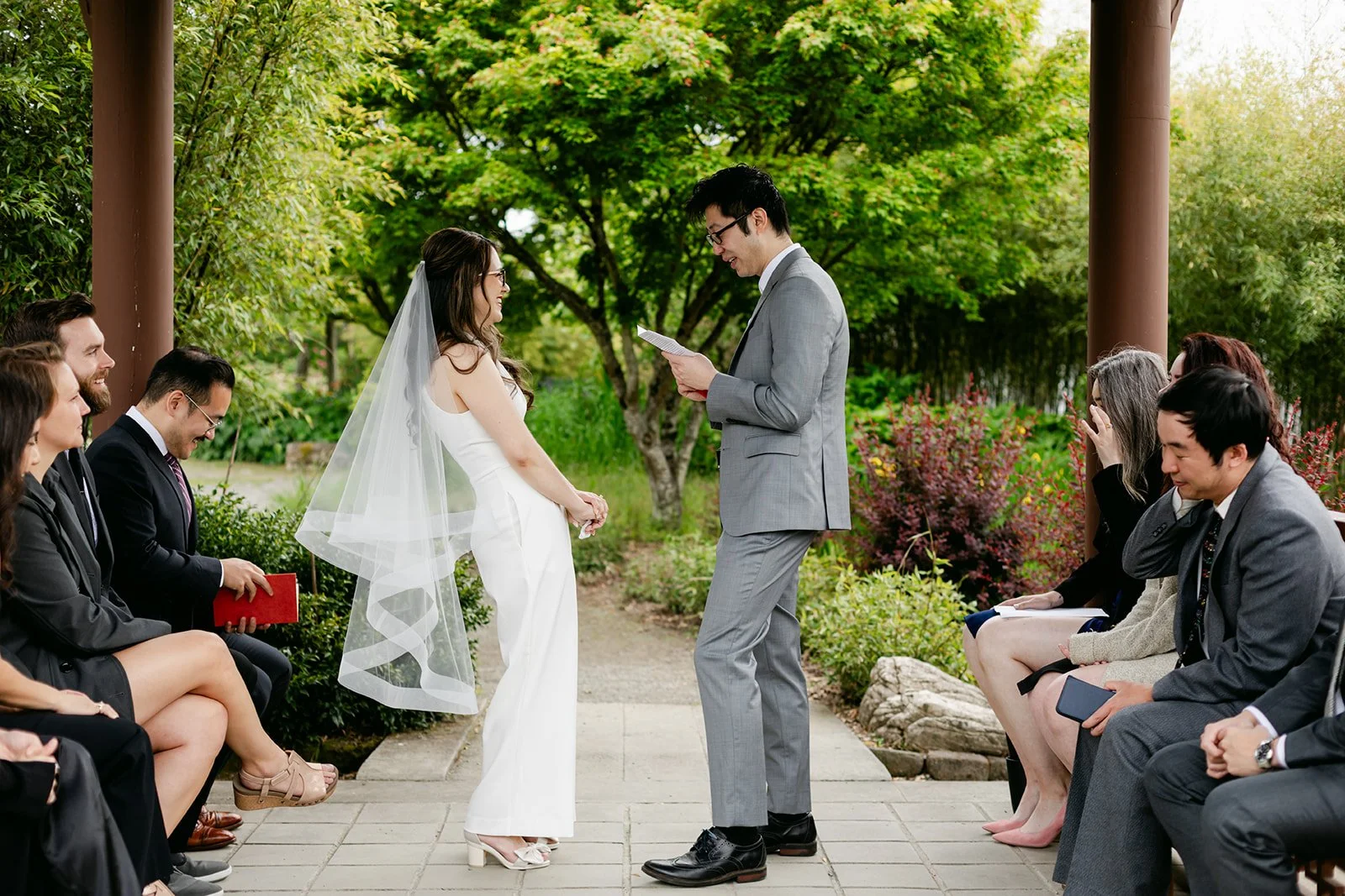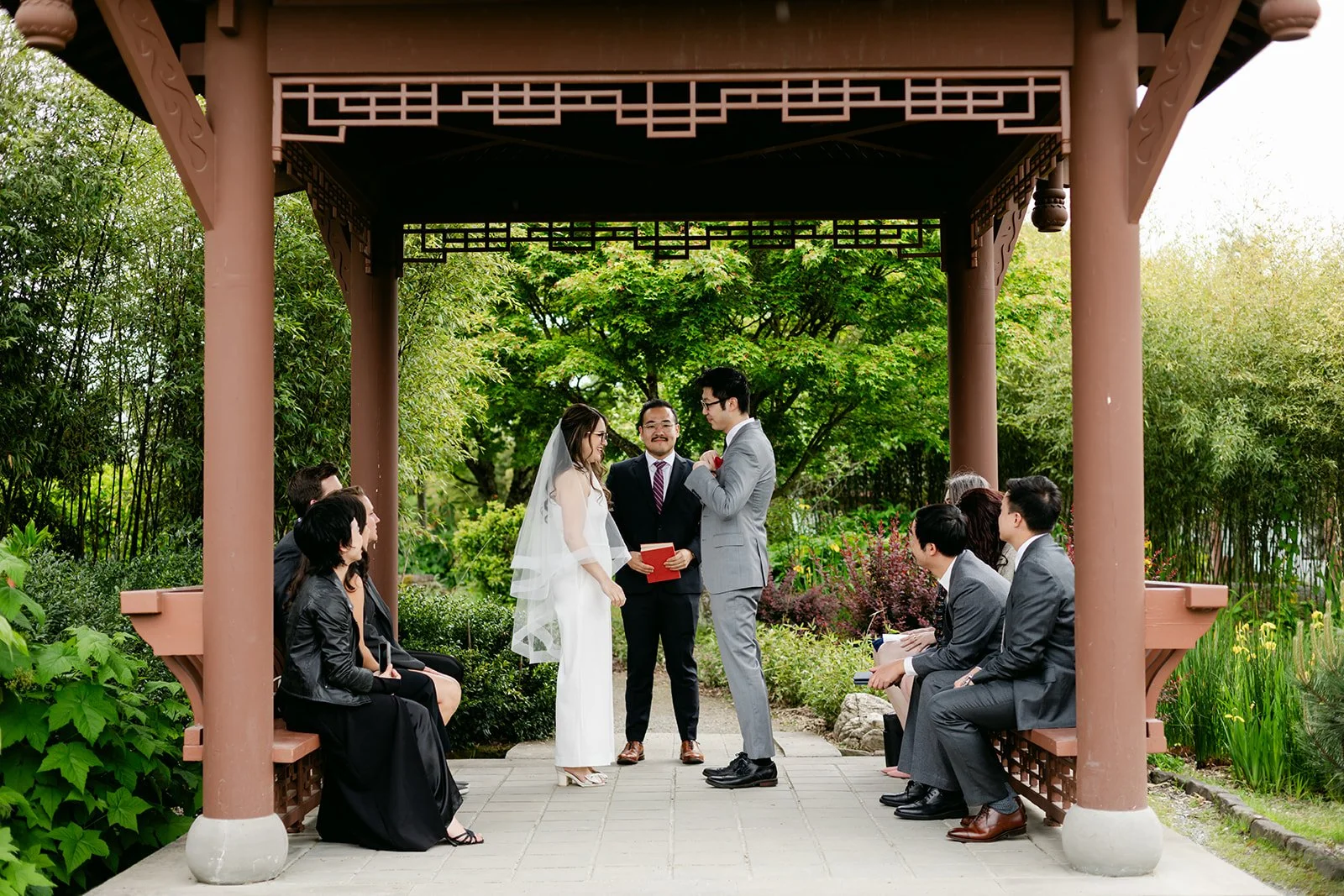 The vows were exchanged under the traditional Chinese pavilion at the Seattle Chinese Garden — a breathtaking, serene space that feels like a Chinese landscape painting come to life. Stone pathways, lush bamboo groves, water features, classical architecture — quiet and intentional and unlike anywhere else in Seattle. The pavilion framed them perfectly, a small circle of their closest friends seated on either side, the garden blooming green all around them.