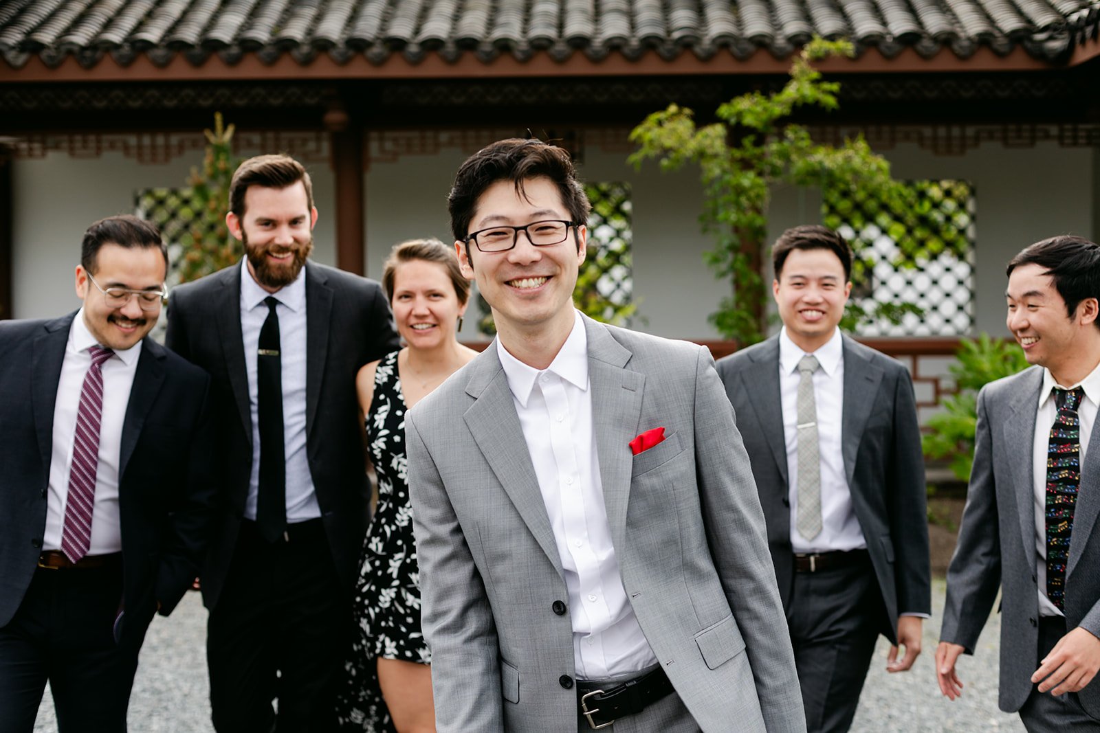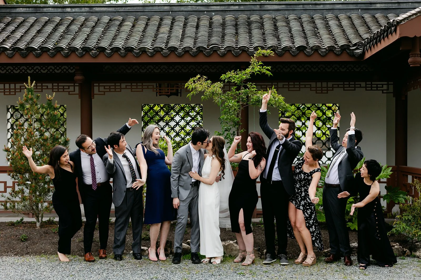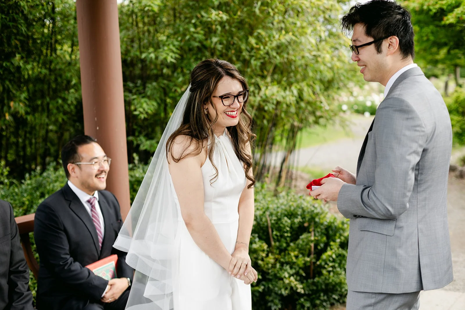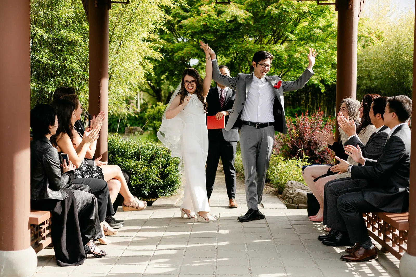 The vows were exchanged under the traditional Chinese pavilion at the Seattle Chinese Garden — a breathtaking, serene space that feels like a Chinese landscape painting come to life. Stone pathways, lush bamboo groves, water features, classical architecture — quiet and intentional and unlike anywhere else in Seattle. The pavilion framed them perfectly, a small circle of their closest friends seated on either side, the garden blooming green all around them.