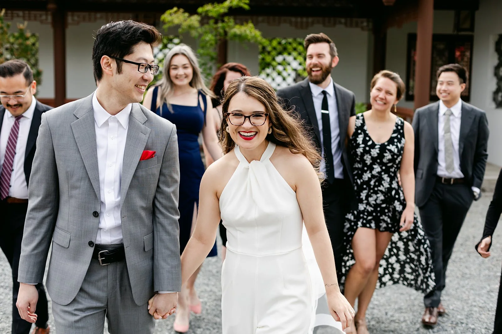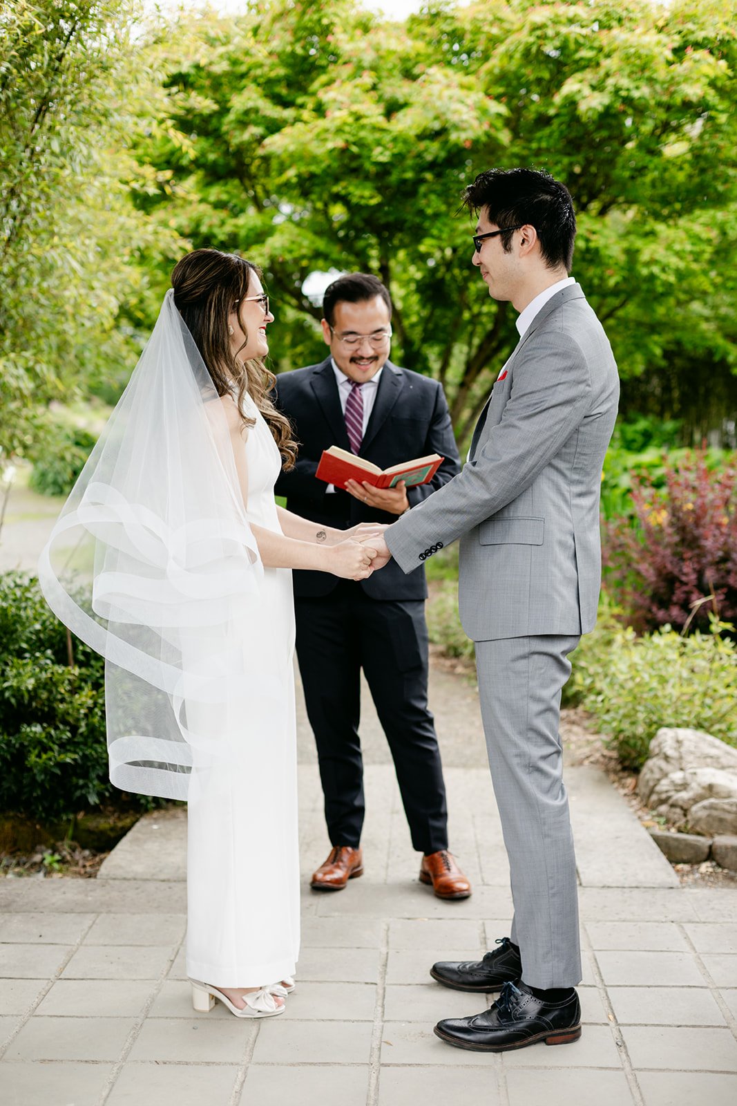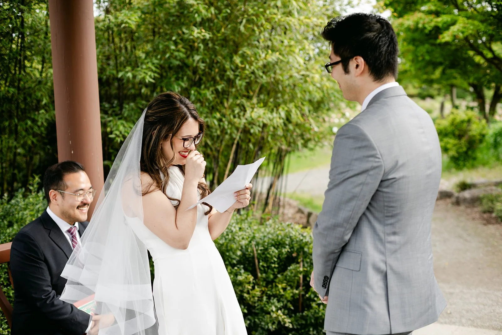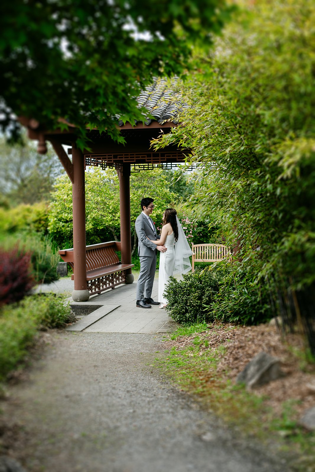 The vows were exchanged under the traditional Chinese pavilion at the Seattle Chinese Garden — a breathtaking, serene space that feels like a Chinese landscape painting come to life. Stone pathways, lush bamboo groves, water features, classical architecture — quiet and intentional and unlike anywhere else in Seattle. The pavilion framed them perfectly, a small circle of their closest friends seated on either side, the garden blooming green all around them.