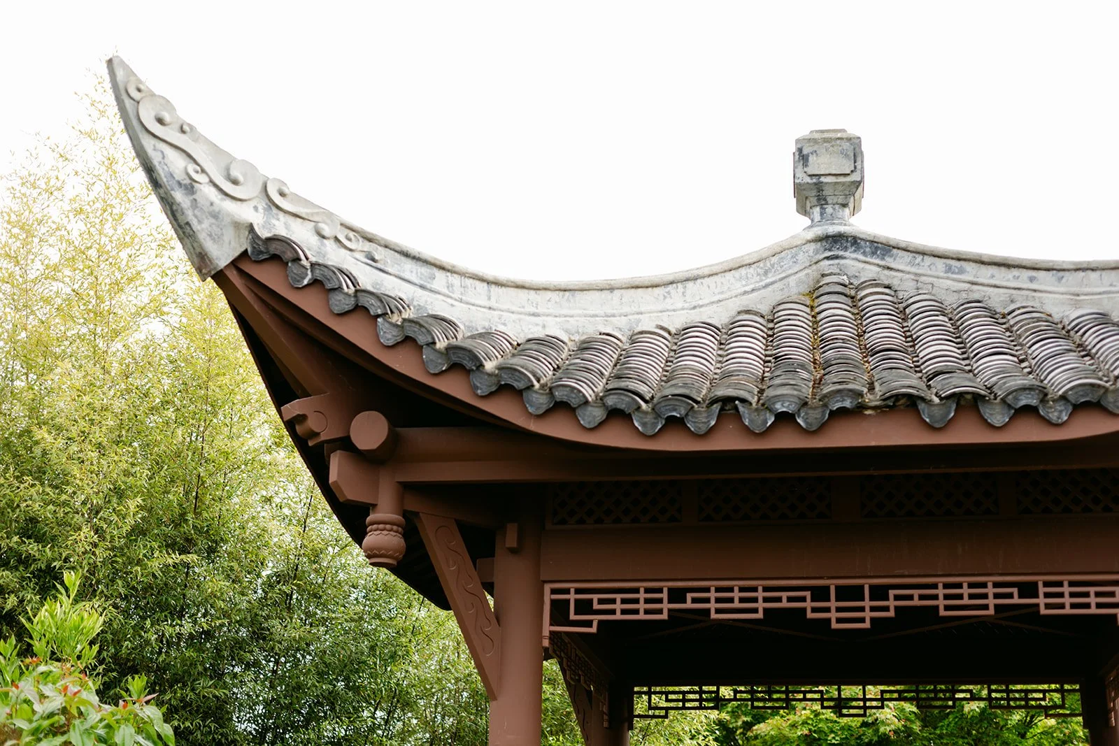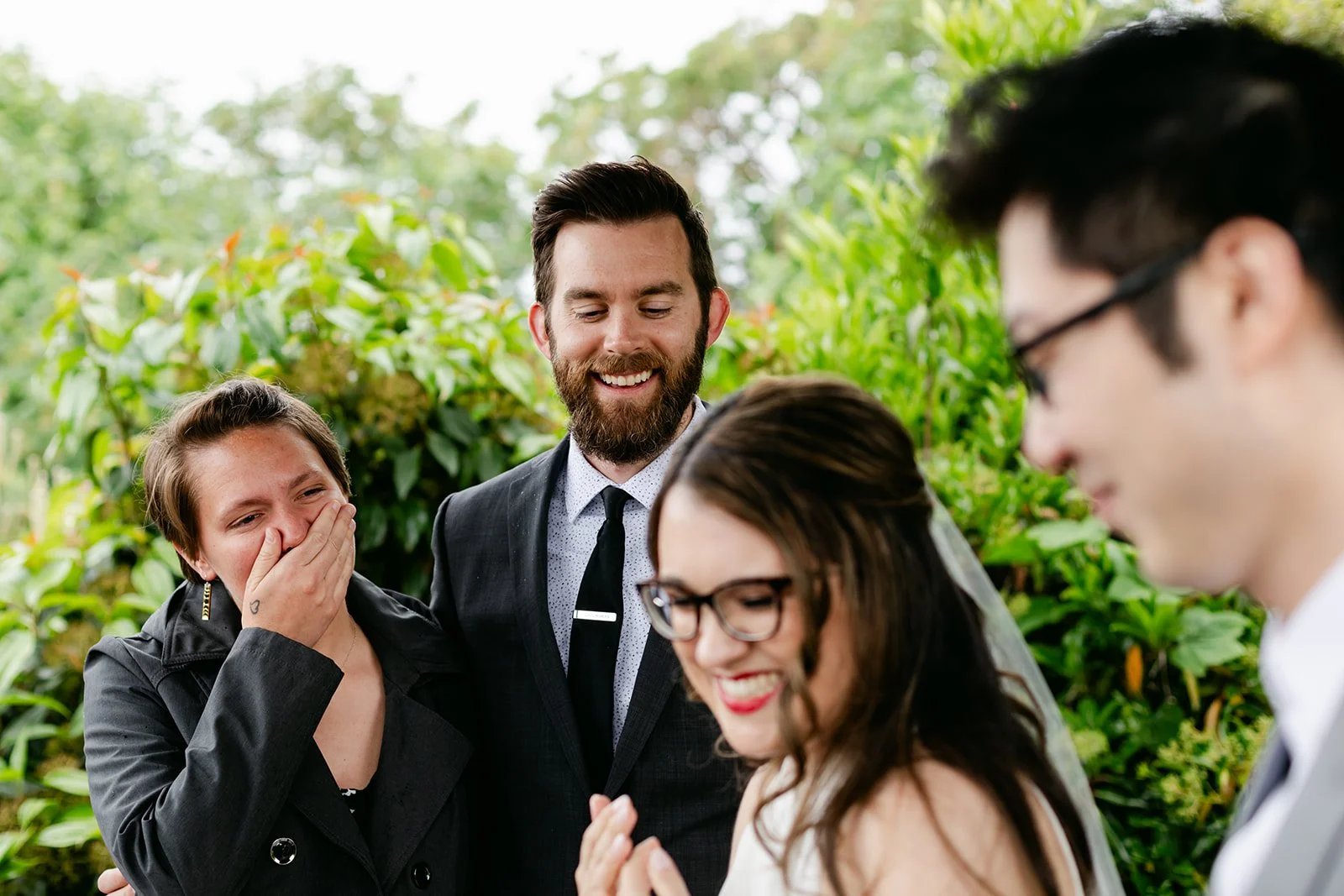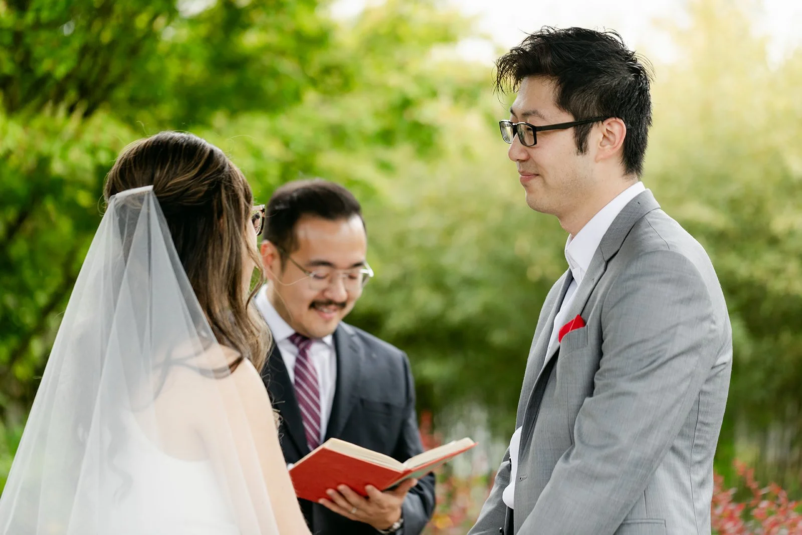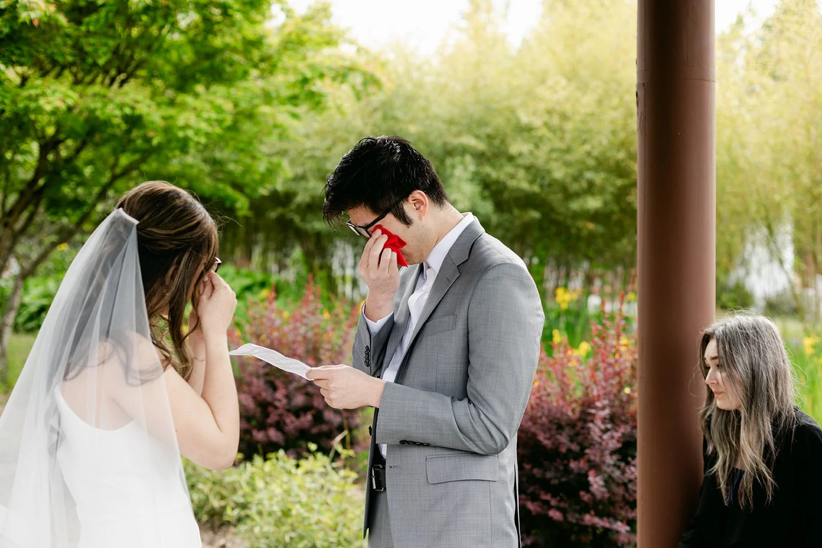 The vows were exchanged under the traditional Chinese pavilion at the Seattle Chinese Garden — a breathtaking, serene space that feels like a Chinese landscape painting come to life. Stone pathways, lush bamboo groves, water features, classical architecture — quiet and intentional and unlike anywhere else in Seattle. The pavilion framed them perfectly, a small circle of their closest friends seated on either side, the garden blooming green all around them.