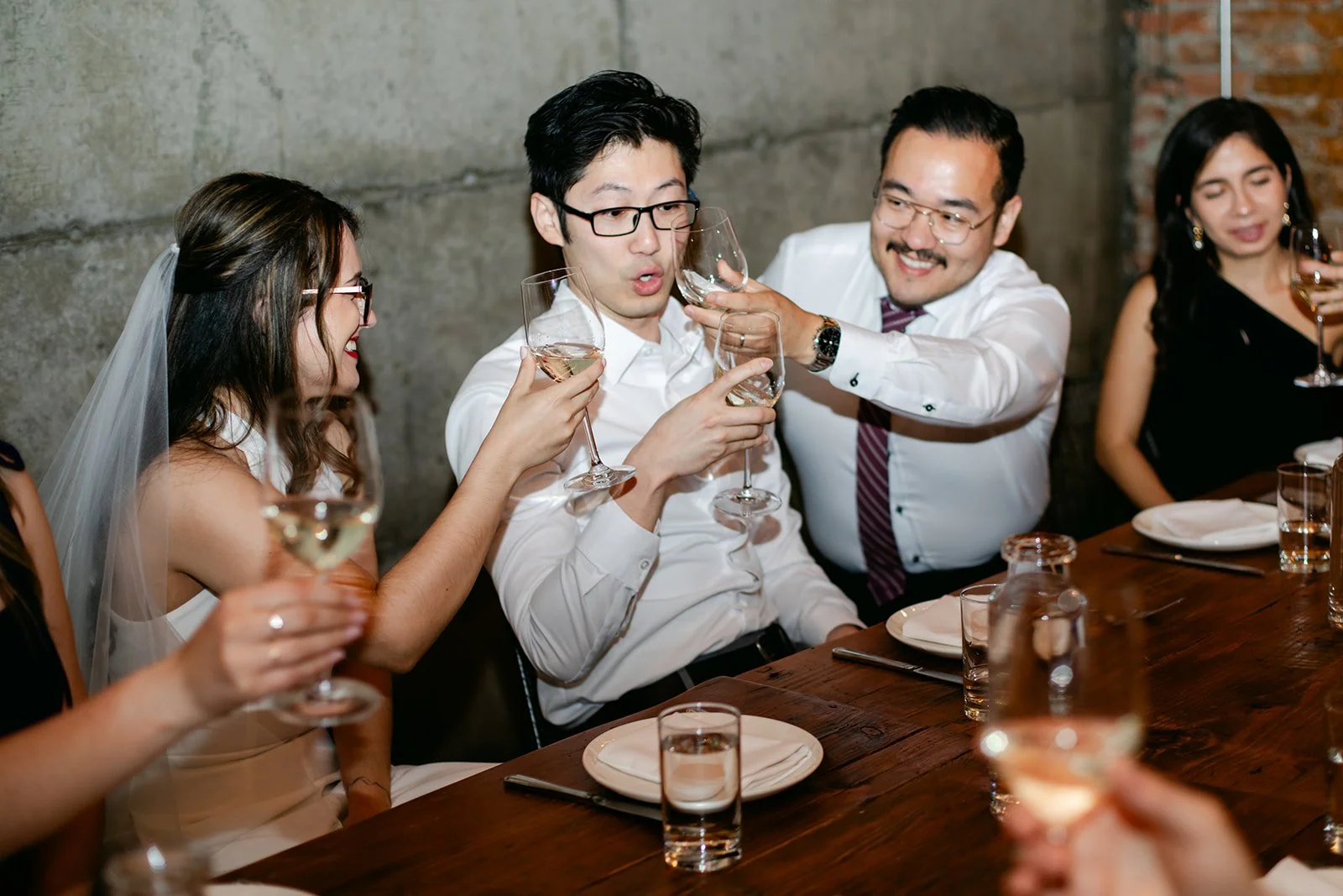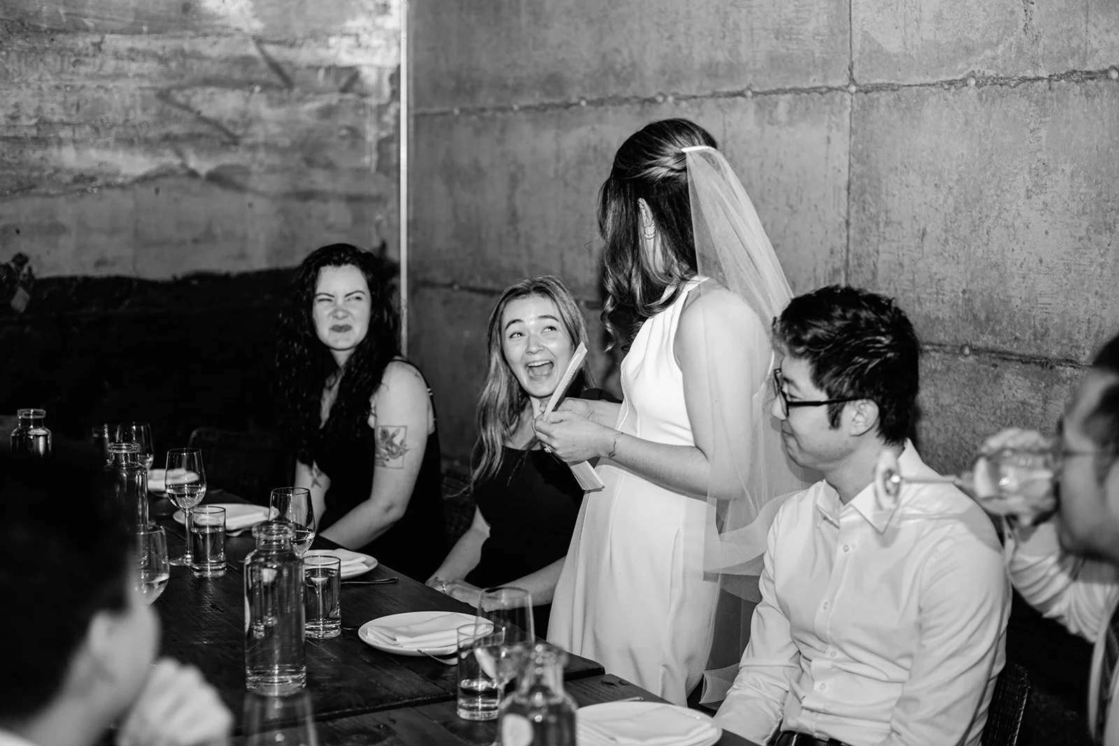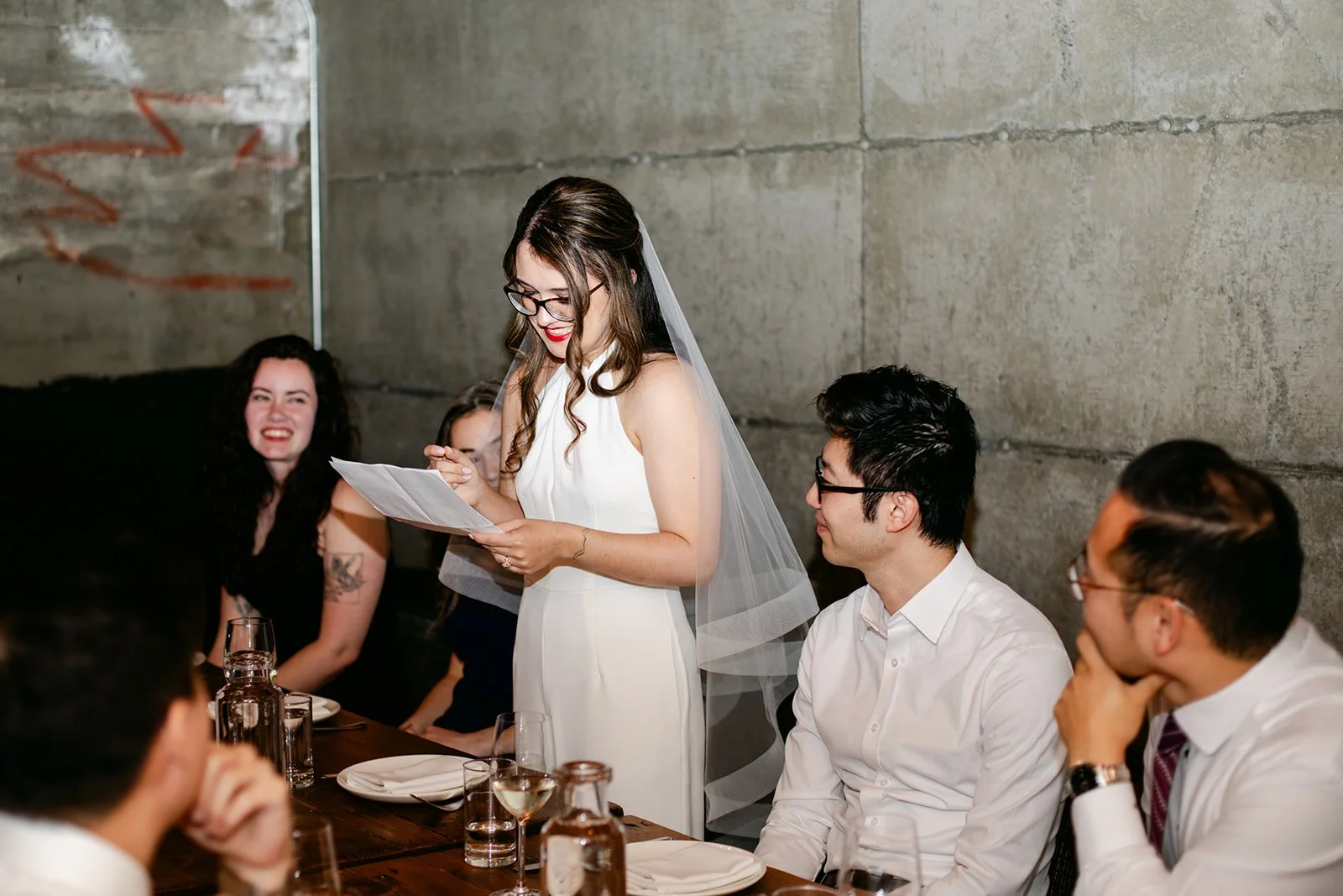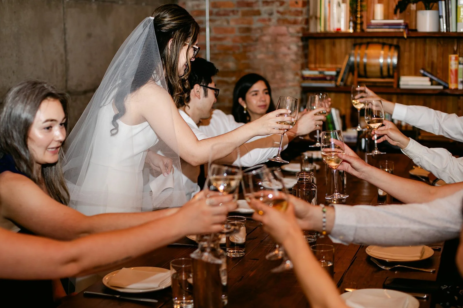 Staple & Fancy in Ballard is one of those restaurants that earns its reputation every single night. Exposed brick walls, long wooden tables, the warmth of a room that knows what it's doing. A tasting menu built around whatever is best and freshest, course after course of the kind of food that makes you slow down and pay attention. Rachel stood at the head of the table in her jumpsuit and veil, still fully bridal, toasting with her people — glasses raised across the whole table, everyone leaning in, everyone exactly where they were supposed to be.