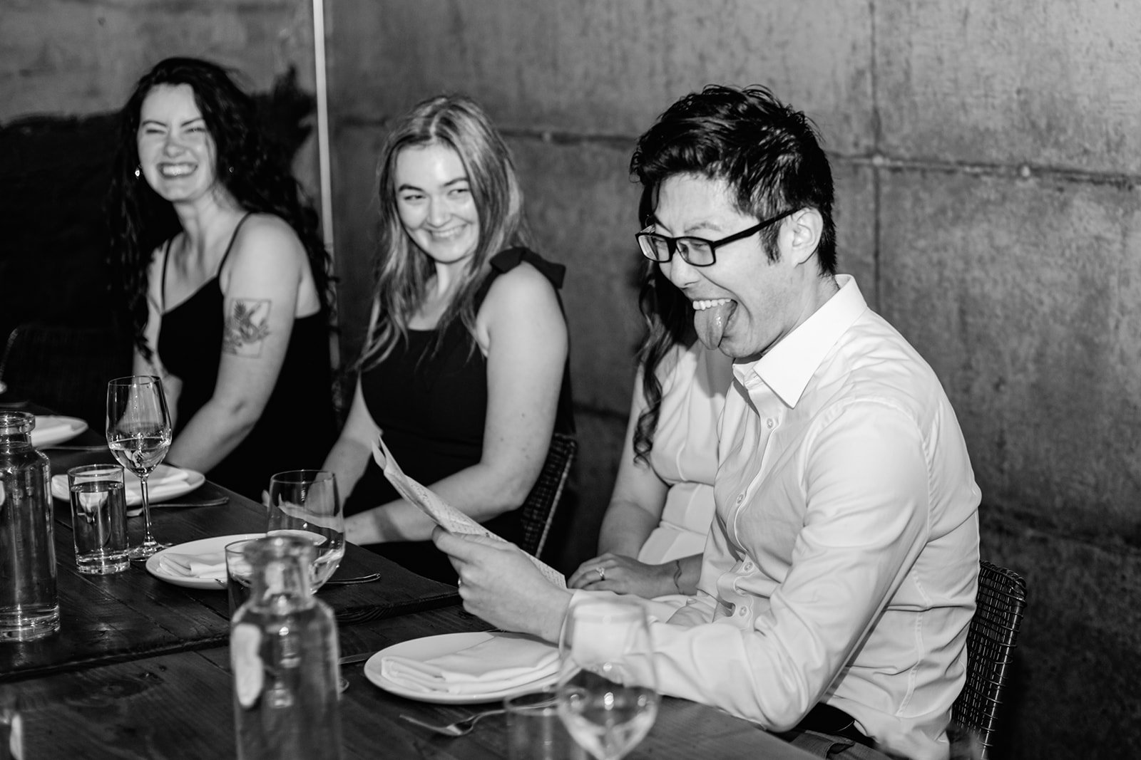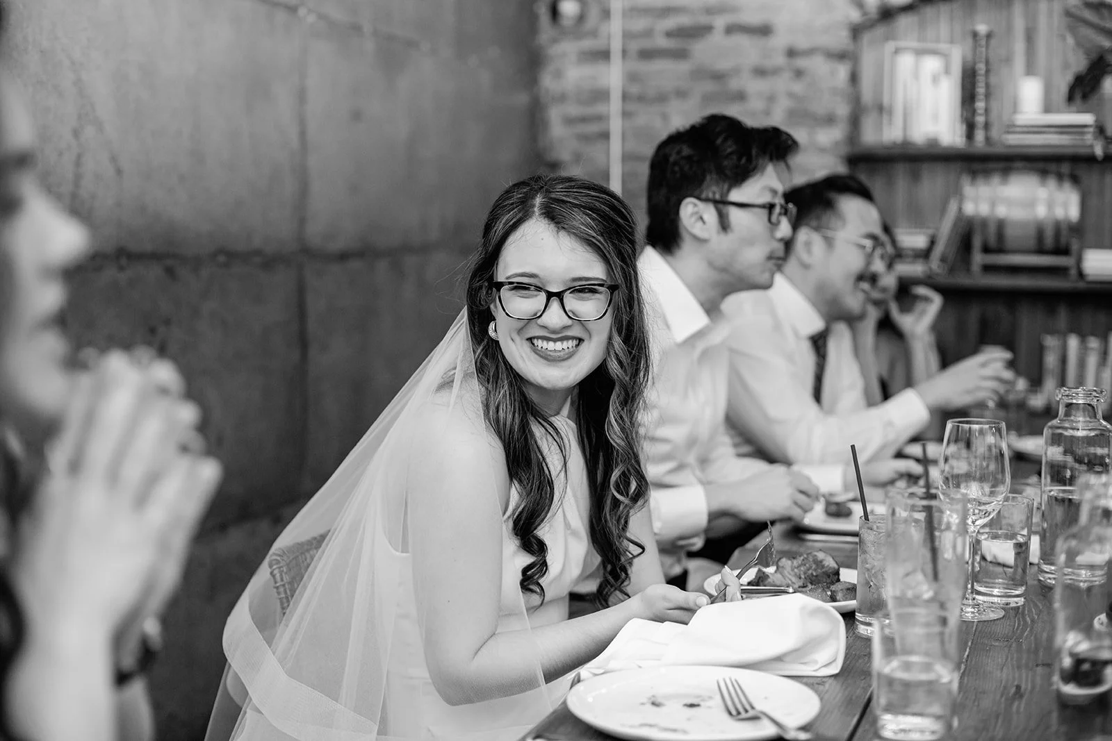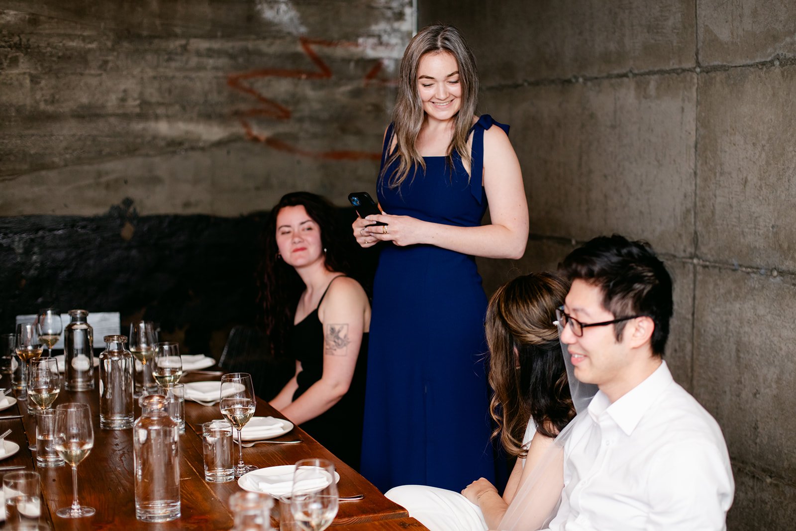 Staple & Fancy in Ballard is one of those restaurants that earns its reputation every single night. Exposed brick walls, long wooden tables, the warmth of a room that knows what it's doing. A tasting menu built around whatever is best and freshest, course after course of the kind of food that makes you slow down and pay attention. Rachel stood at the head of the table in her jumpsuit and veil, still fully bridal, toasting with her people — glasses raised across the whole table, everyone leaning in, everyone exactly where they were supposed to be.