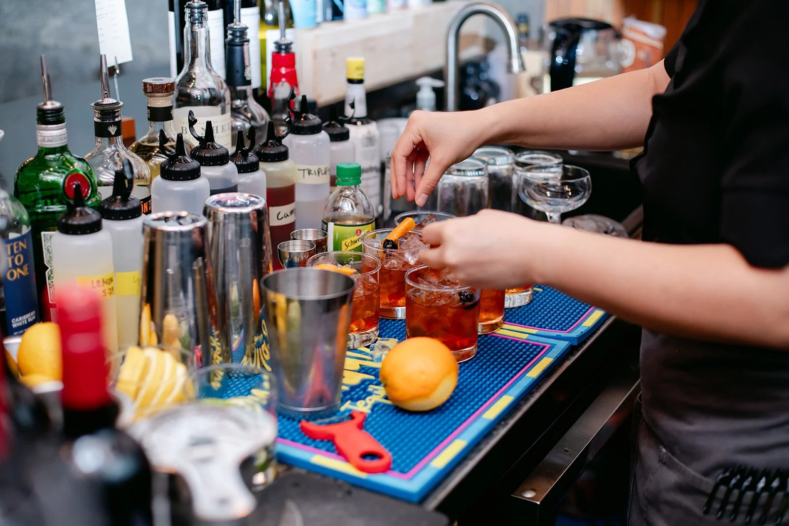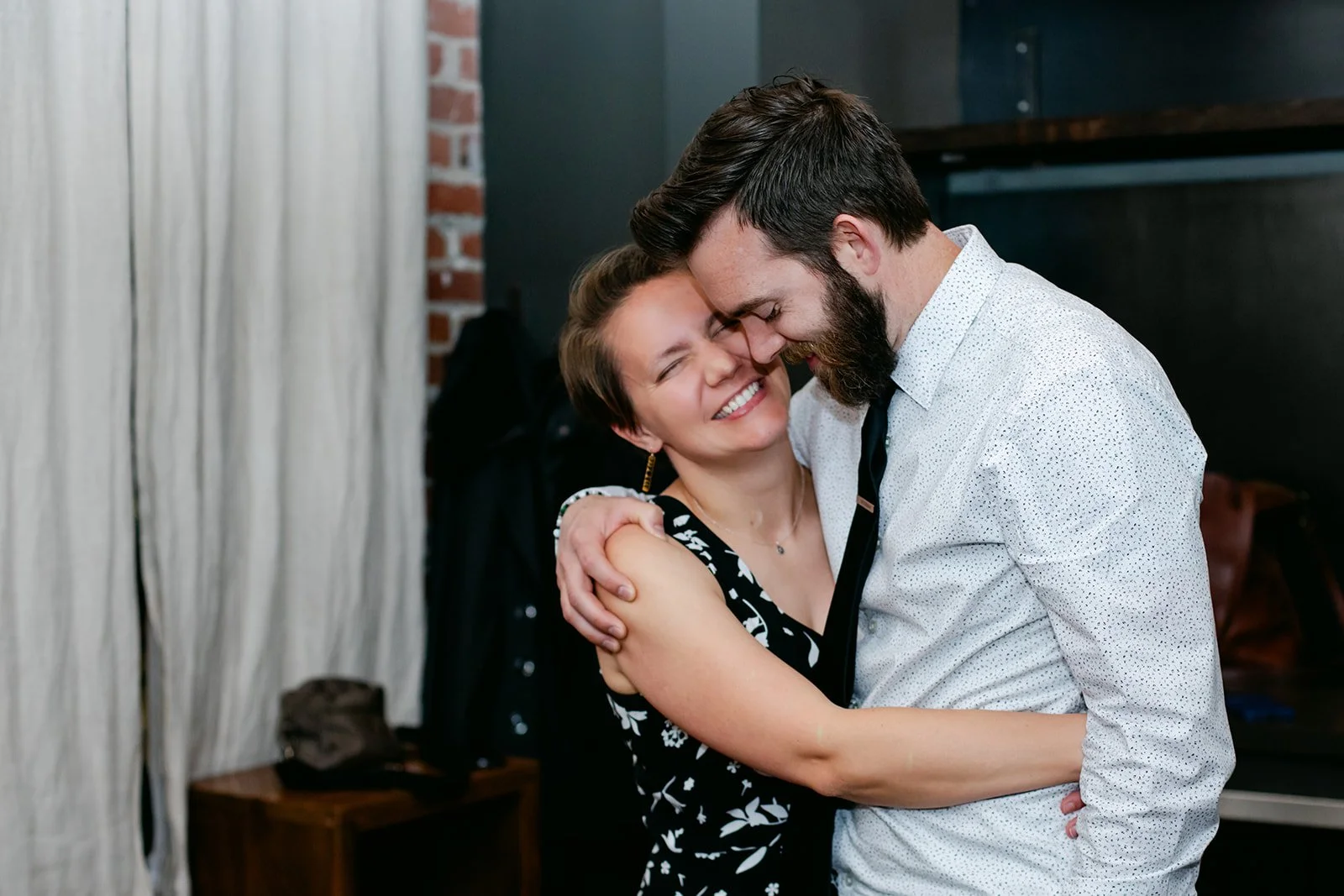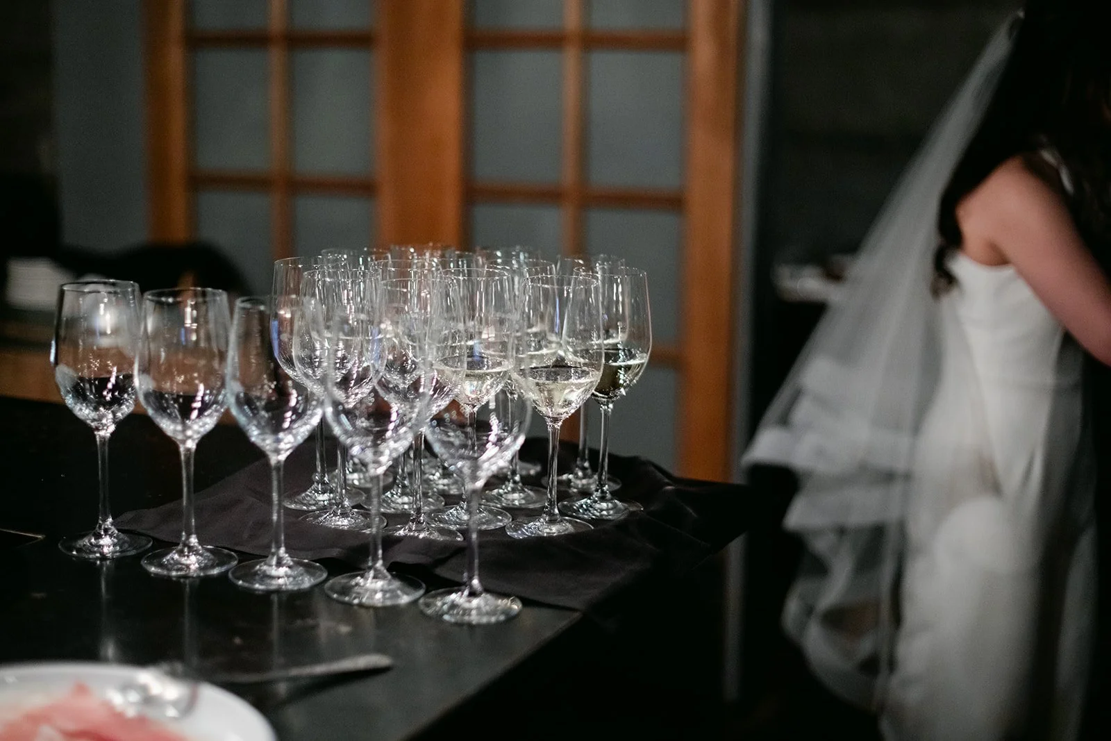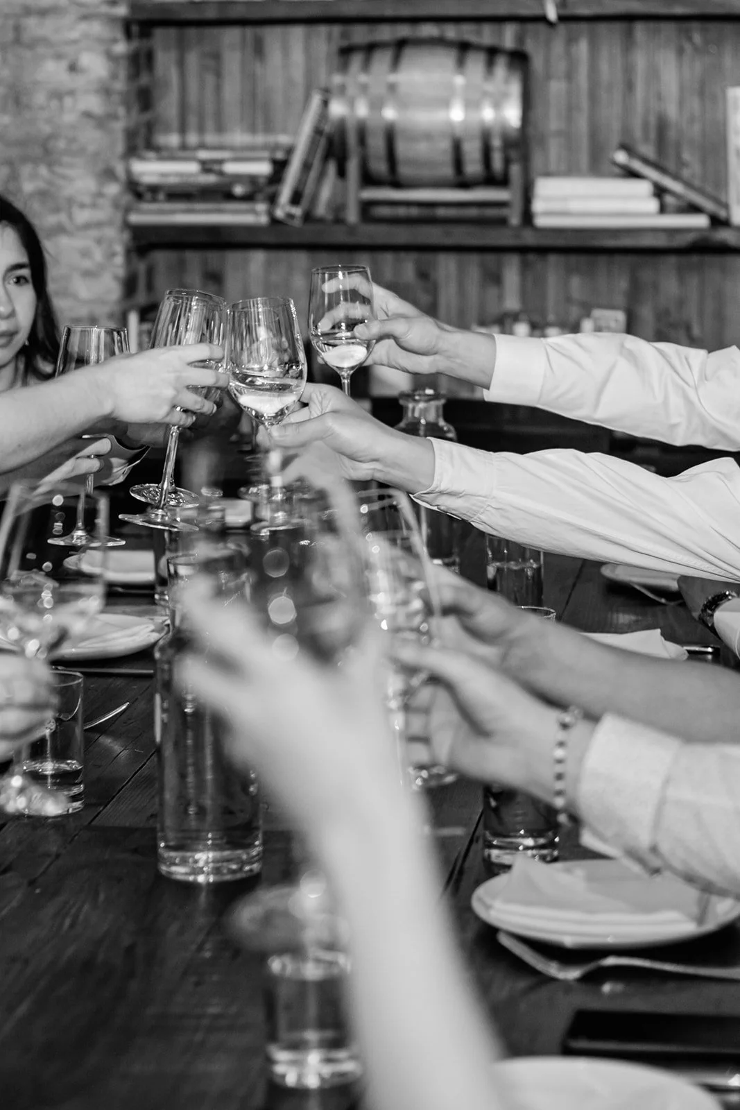 Staple & Fancy in Ballard is one of those restaurants that earns its reputation every single night. Exposed brick walls, long wooden tables, the warmth of a room that knows what it's doing. A tasting menu built around whatever is best and freshest, course after course of the kind of food that makes you slow down and pay attention. Rachel stood at the head of the table in her jumpsuit and veil, still fully bridal, toasting with her people — glasses raised across the whole table, everyone leaning in, everyone exactly where they were supposed to be.