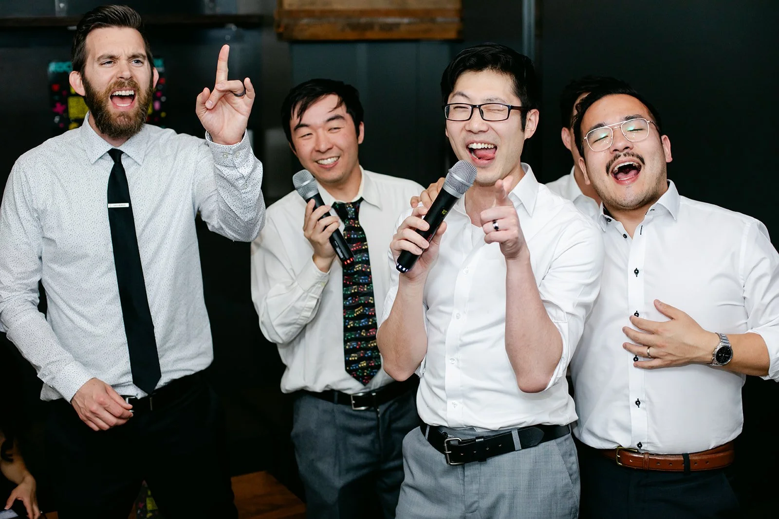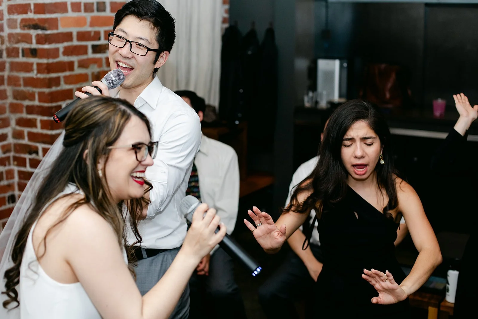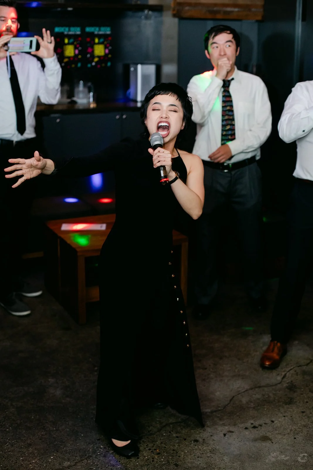 I need to let the images speak here. Andrew, microphone in hand, glasses slightly askew, was singing with everything he had. Rachel, arm raised, red lips, veil still on, absolutely killing it. Their friends crowded around them in that dark little room, all of them completely uninhibited and completely joyful. The contrast between the serene stillness of the Chinese garden and the glorious chaos of late-night karaoke is one of my favorite things I've ever documented.