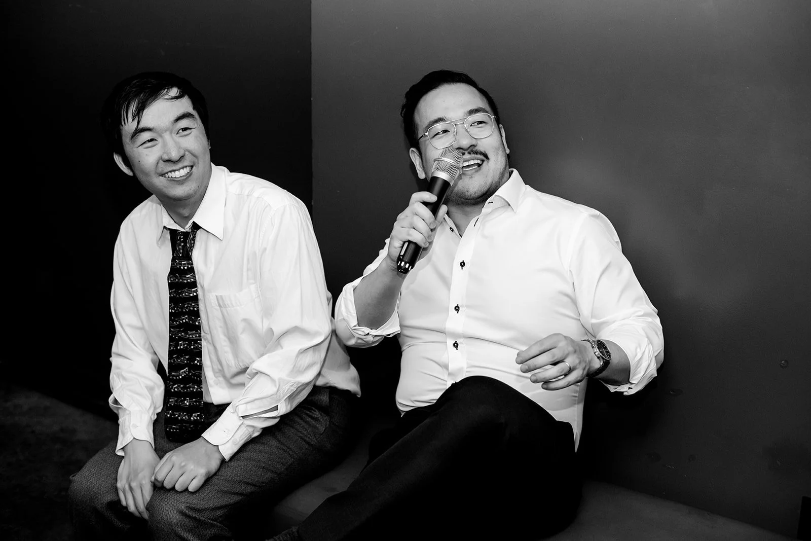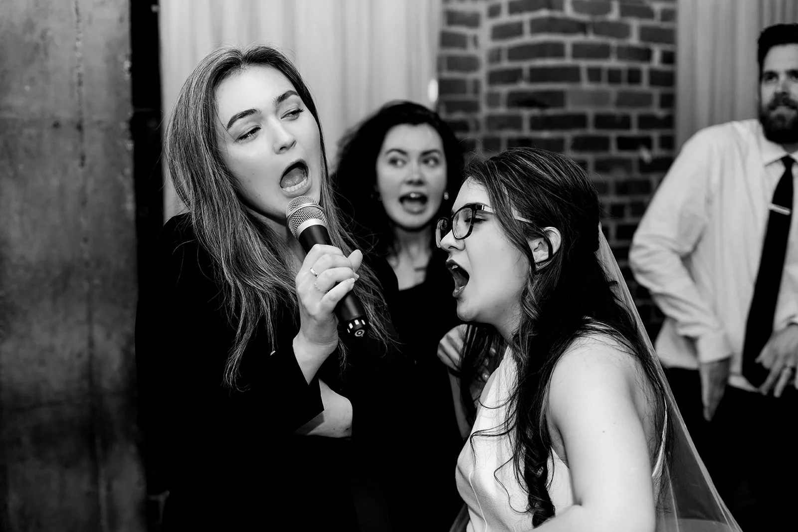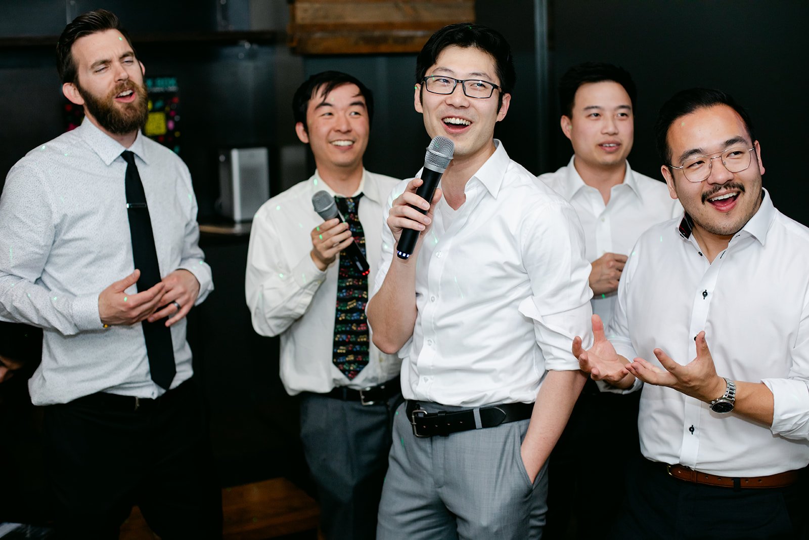 I need to let the images speak here. Andrew, microphone in hand, glasses slightly askew, was singing with everything he had. Rachel, arm raised, red lips, veil still on, absolutely killing it. Their friends crowded around them in that dark little room, all of them completely uninhibited and completely joyful. The contrast between the serene stillness of the Chinese garden and the glorious chaos of late-night karaoke is one of my favorite things I've ever documented.