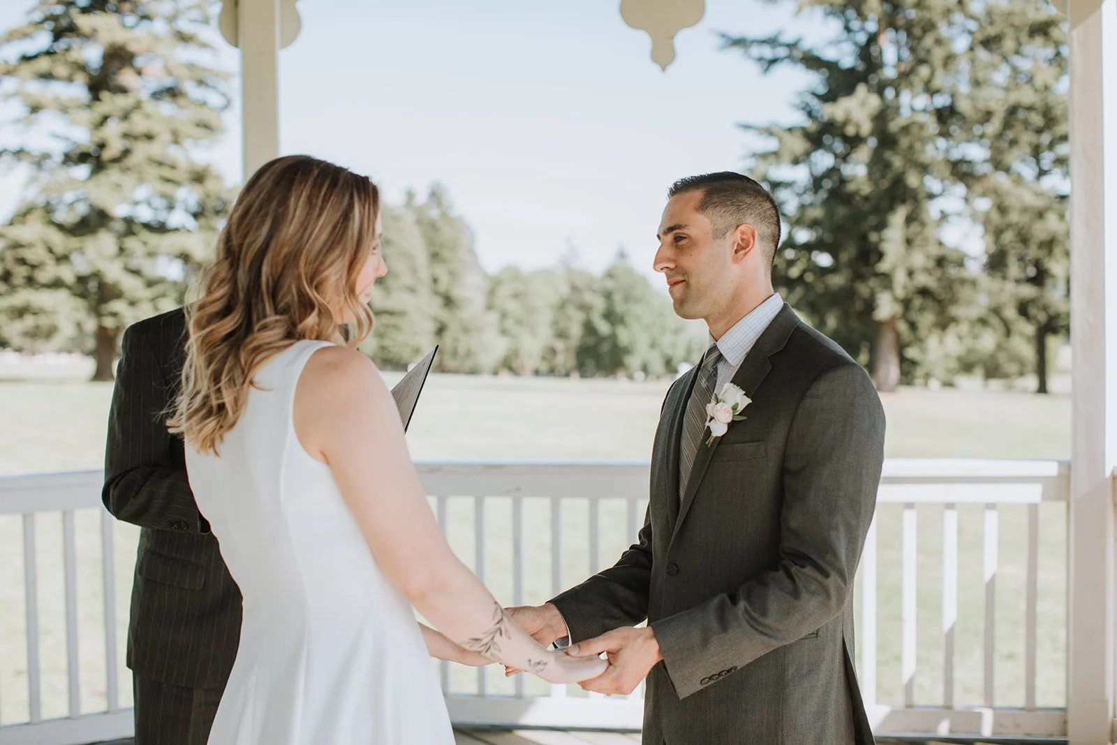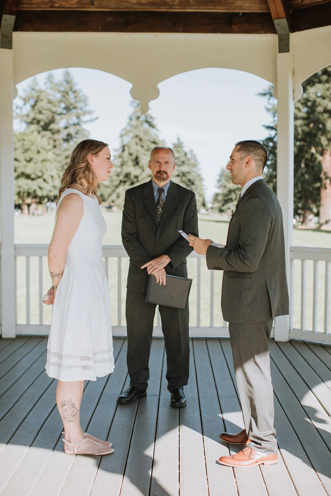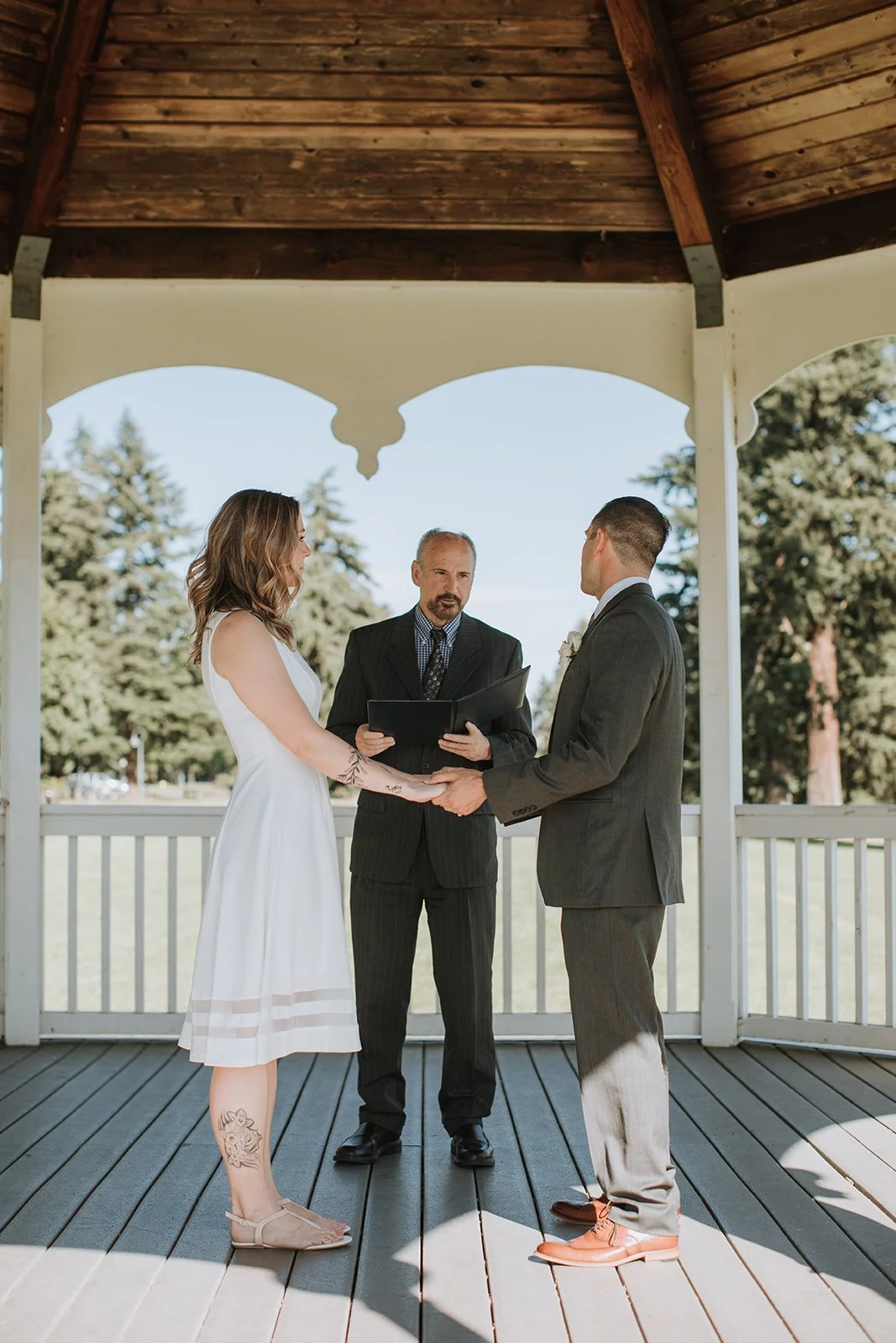 The ceremony took place in the bandstand gazebo at Fort Vancouver, one of those quietly perfect spots that somehow manages to feel both historic and completely intimate at the same time. White painted columns, arched openings, a blue summer sky framing it all from every angle. Stephanie in a simple, clean white dress with her waves down and her tattoos showing. Michael in a charcoal suit with those warm tan shoes that caught the light in every photo. The two of them held hands and said their vows in front of the people they loved most, and the whole thing was over in the best possible way: quietly, genuinely, without any fuss.