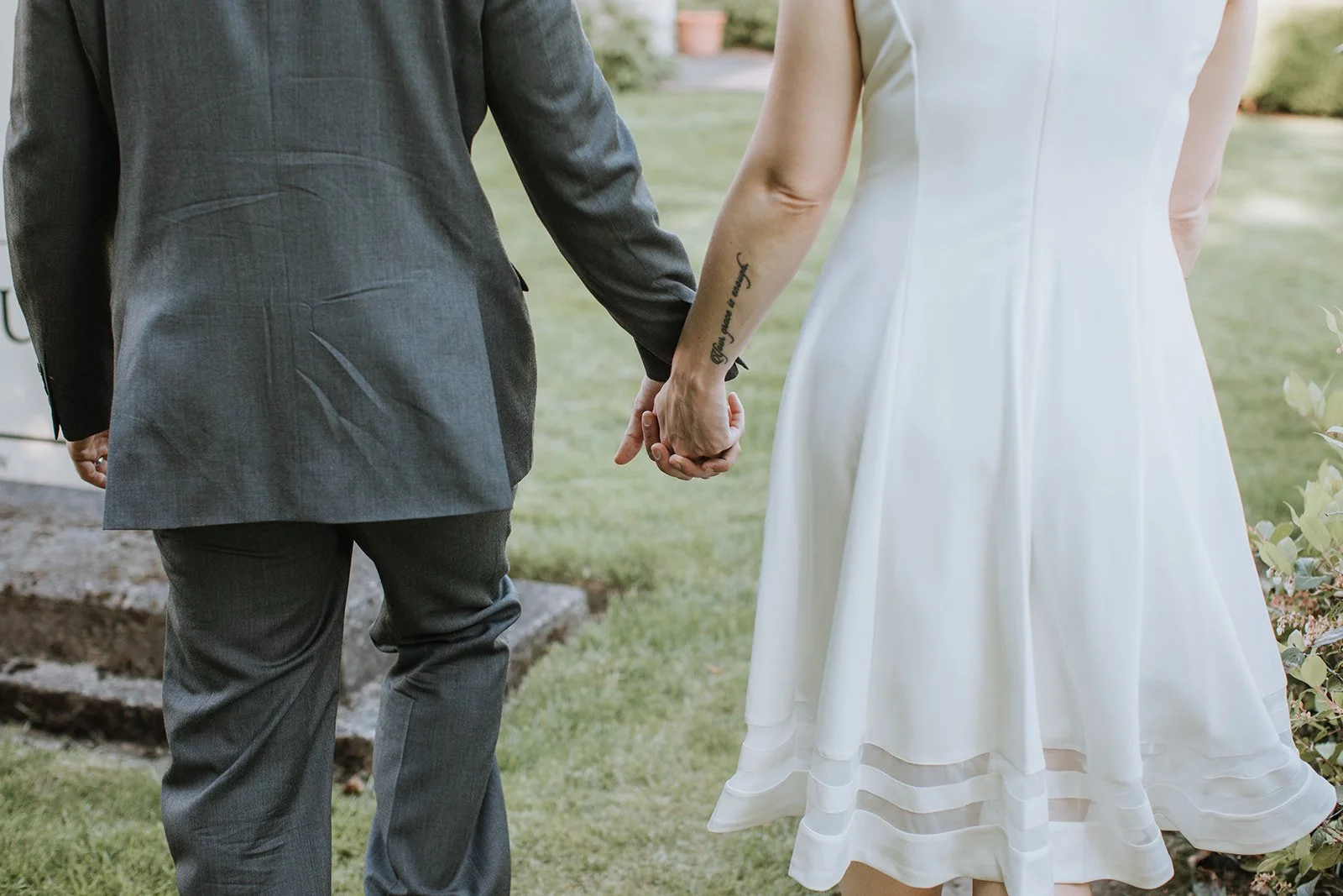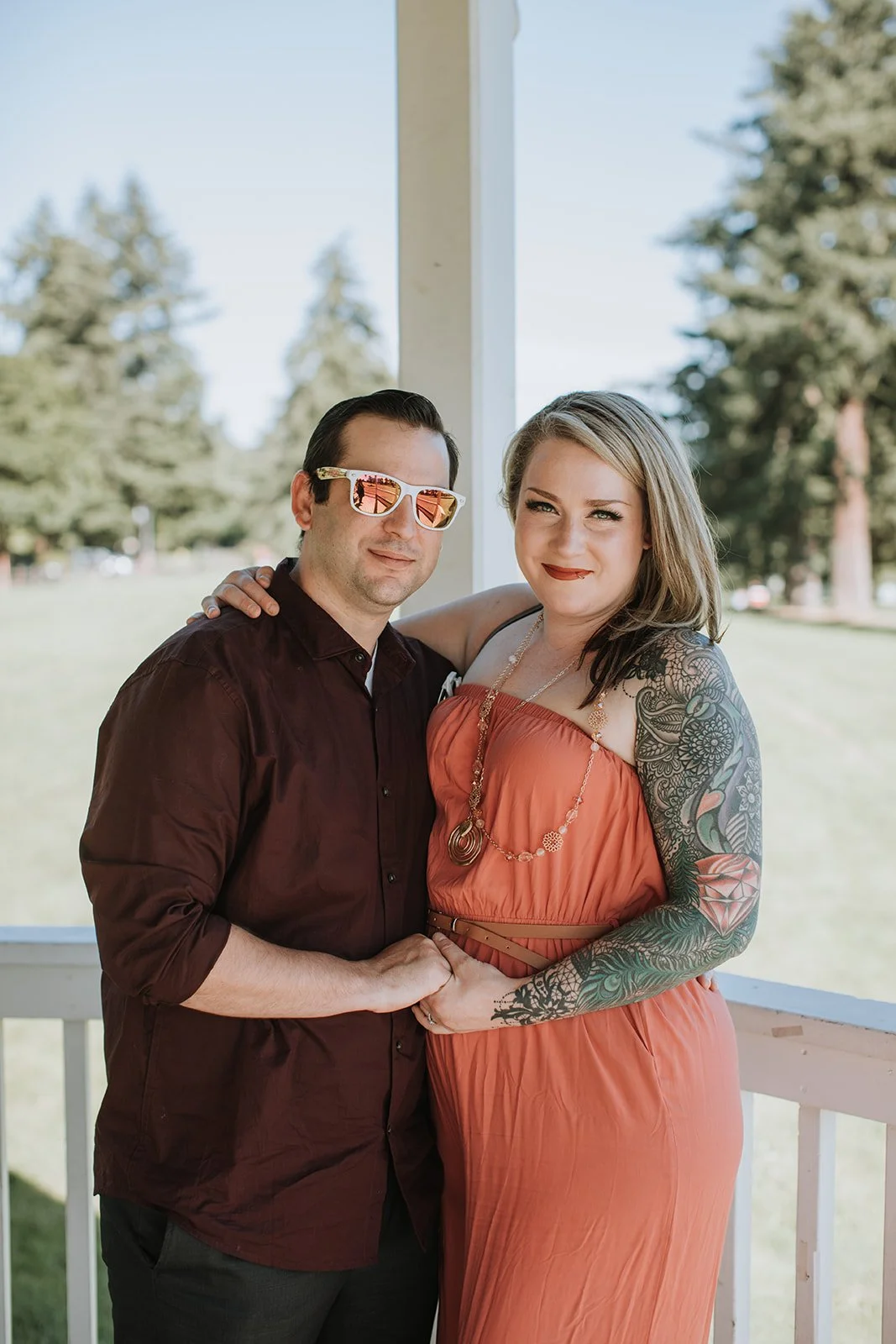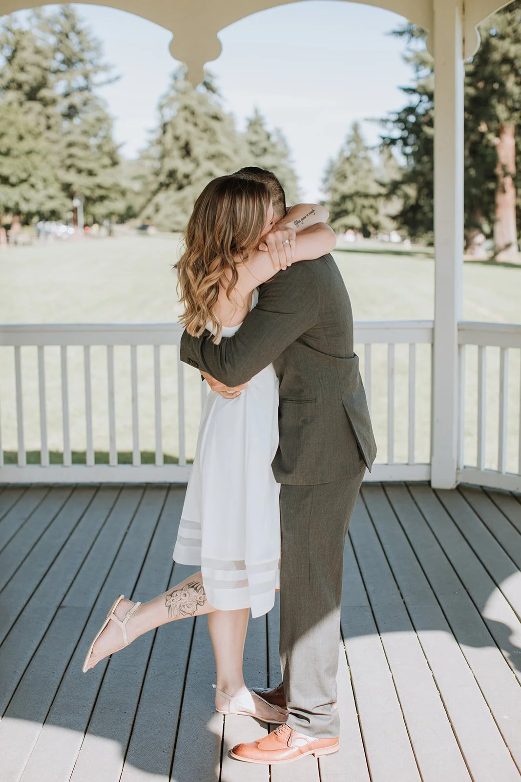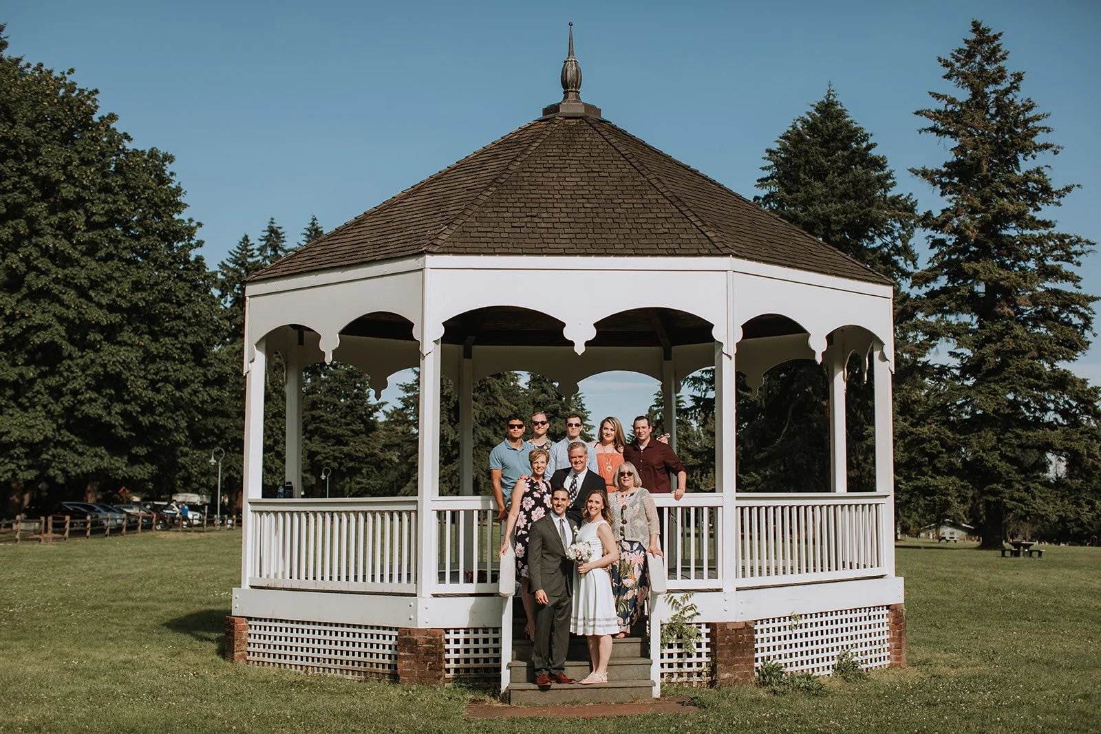 The ceremony took place in the bandstand gazebo at Fort Vancouver, one of those quietly perfect spots that somehow manages to feel both historic and completely intimate at the same time. White painted columns, arched openings, a blue summer sky framing it all from every angle. Stephanie in a simple, clean white dress with her waves down and her tattoos showing. Michael in a charcoal suit with those warm tan shoes that caught the light in every photo. The two of them held hands and said their vows in front of the people they loved most, and the whole thing was over in the best possible way: quietly, genuinely, without any fuss.