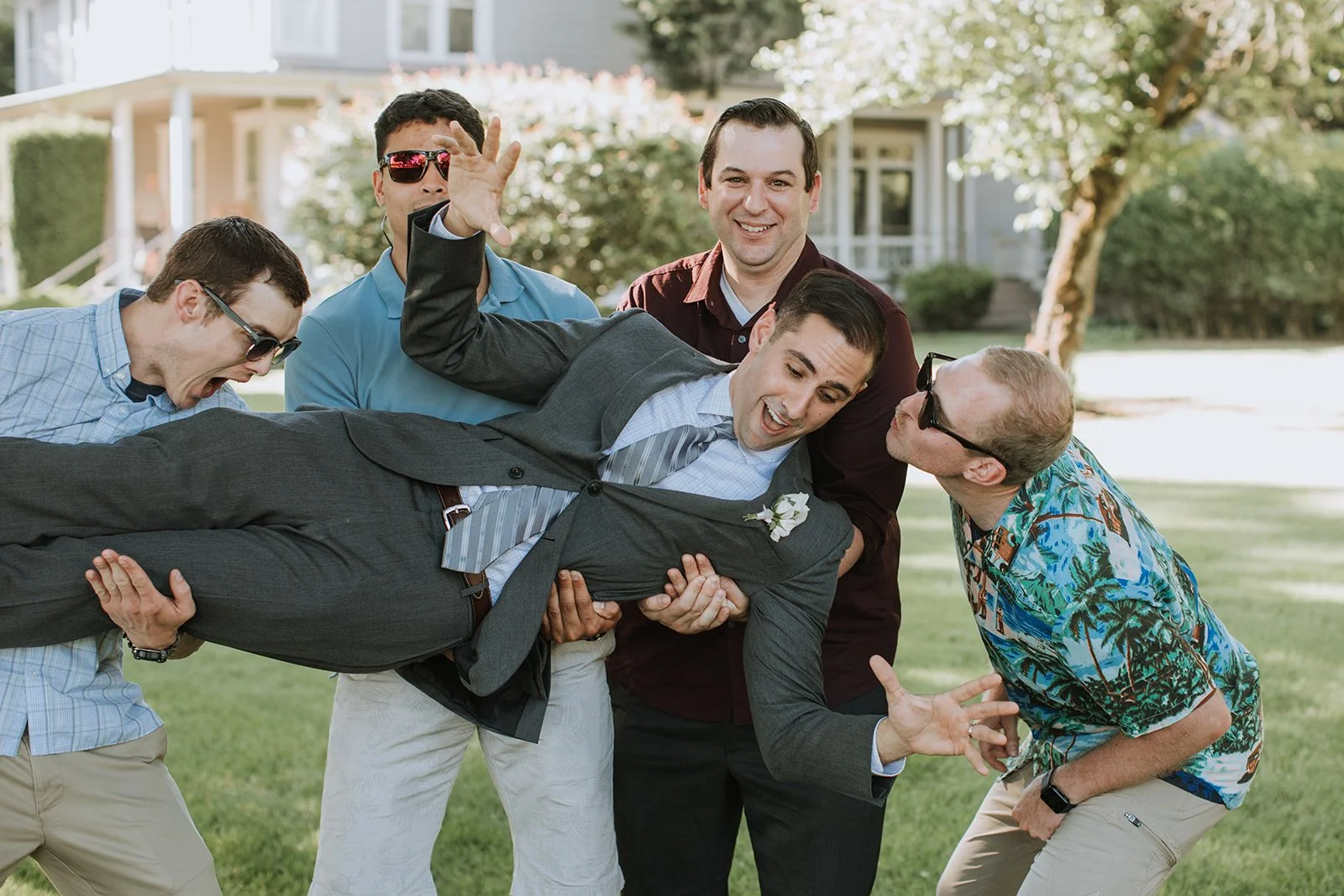 And then, instead of a wedding cake, they brought out Voodoo Doughnuts. A full spread of them: bacon maple bars, Portland cream, sprinkles, a lavender one, a chocolate glazed situation with candy on top. The two of them stood outside and each took a doughnut and just went for it, side by side in their wedding clothes, completely delighted with themselves. It was one of the most joyful frames of the day.