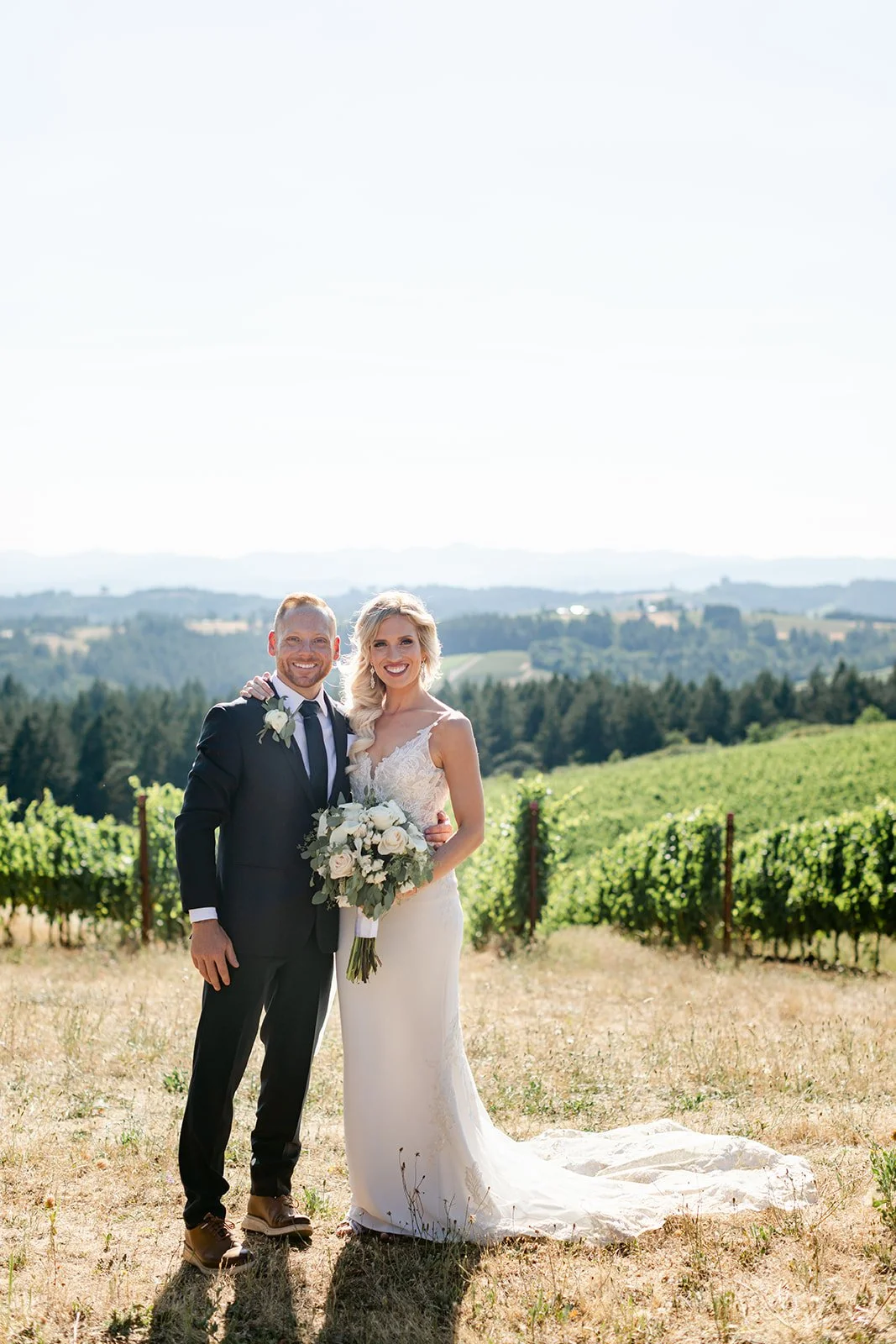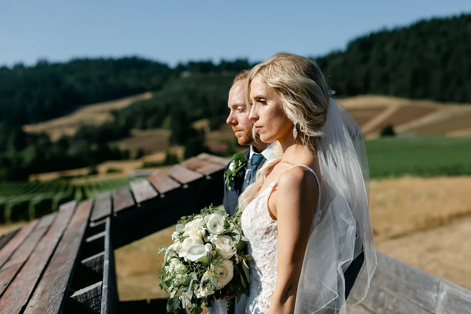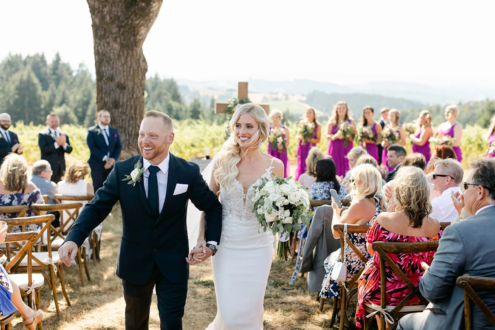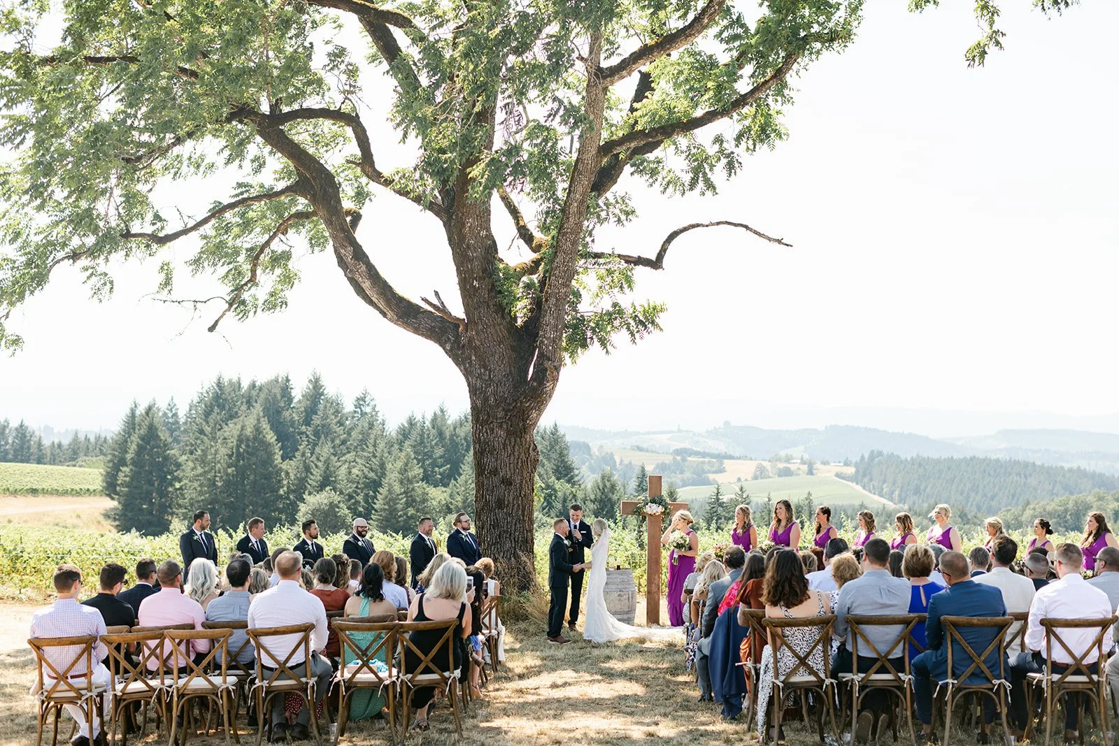 Heather was stunning in a fitted lace gown with an open back and a cathedral train, carrying a lush bouquet of white roses and eucalyptus. Tyson was locked in — the grin he had when she walked toward him didn't leave his face for the rest of the day. The bridesmaids were in deep magenta, bright against the golden vineyard hillside, and the whole scene looked like Oregon in peak summer had dressed itself up for the occasion.