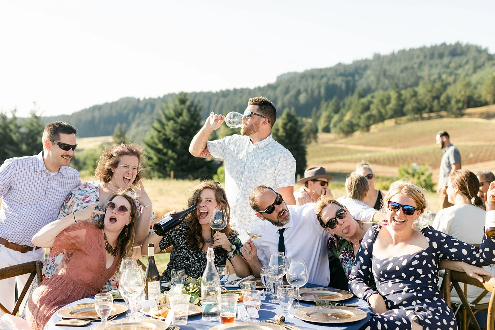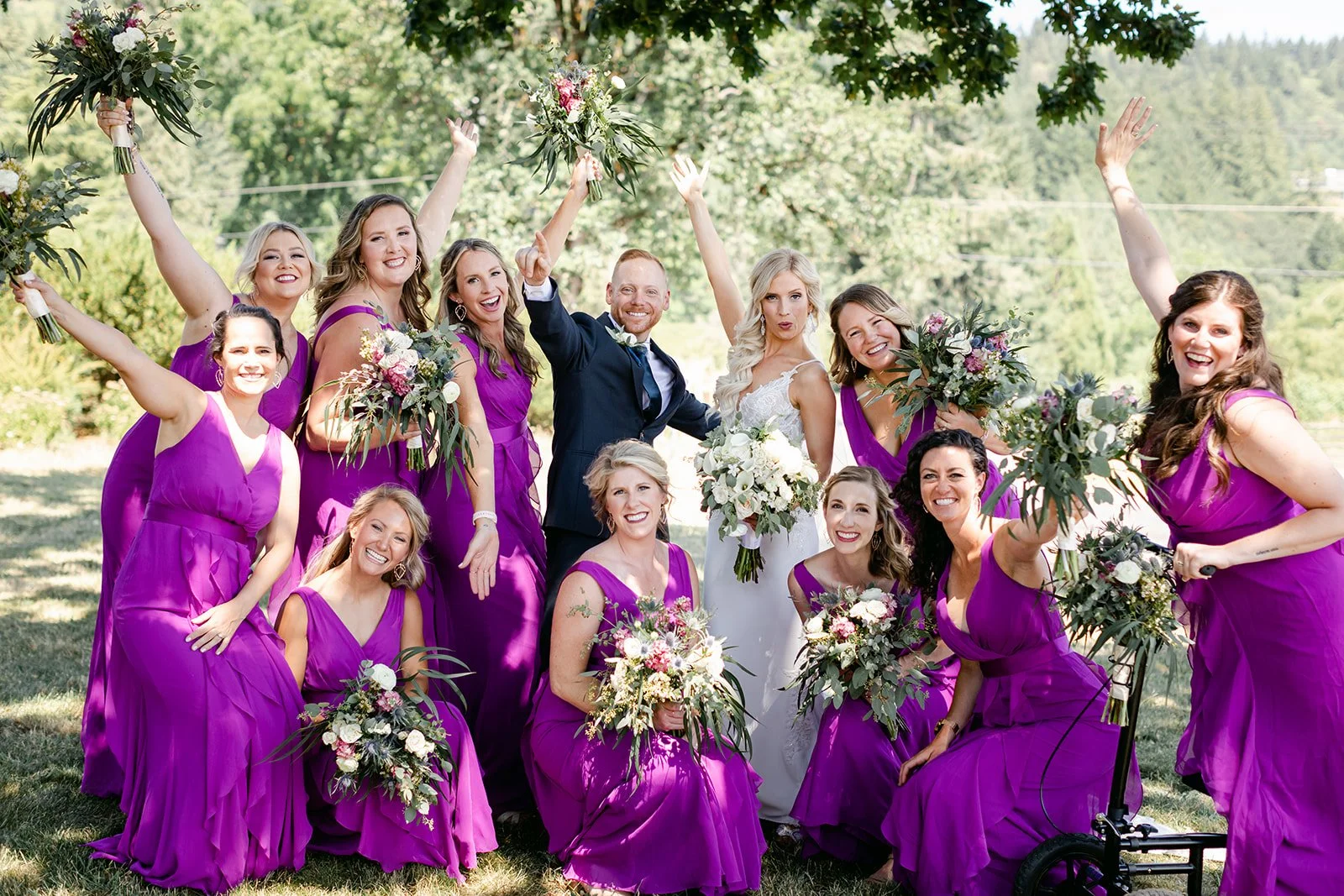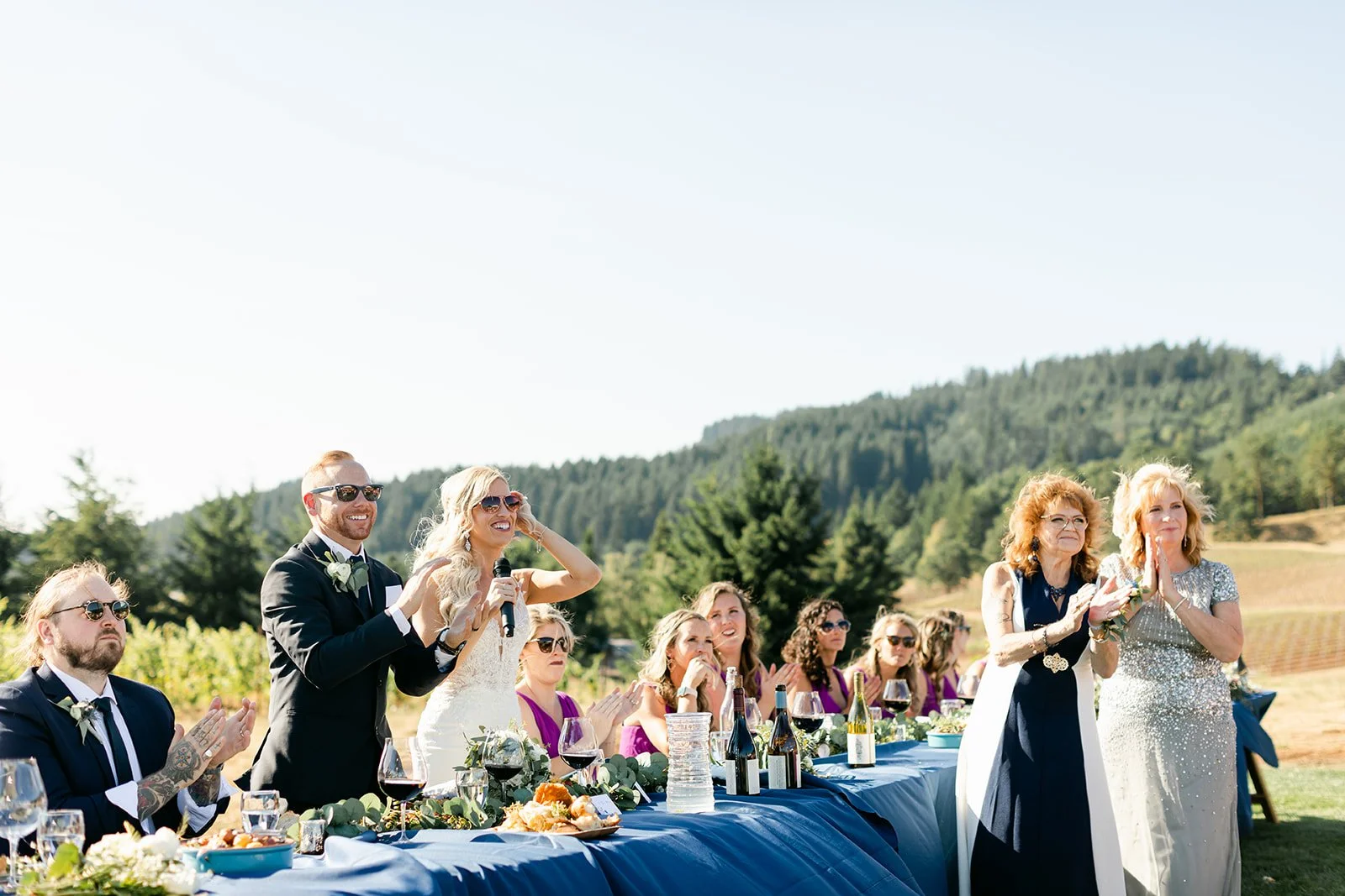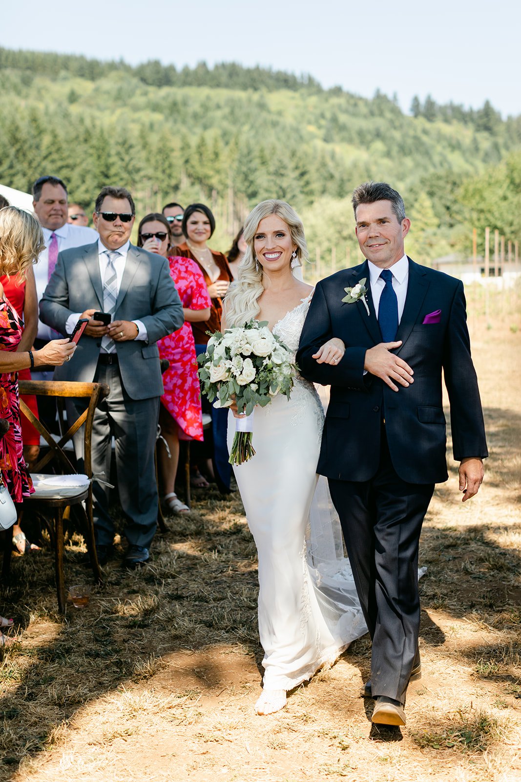 Heather was stunning in a fitted lace gown with an open back and a cathedral train, carrying a lush bouquet of white roses and eucalyptus. Tyson was locked in — the grin he had when she walked toward him didn't leave his face for the rest of the day. The bridesmaids were in deep magenta, bright against the golden vineyard hillside, and the whole scene looked like Oregon in peak summer had dressed itself up for the occasion.