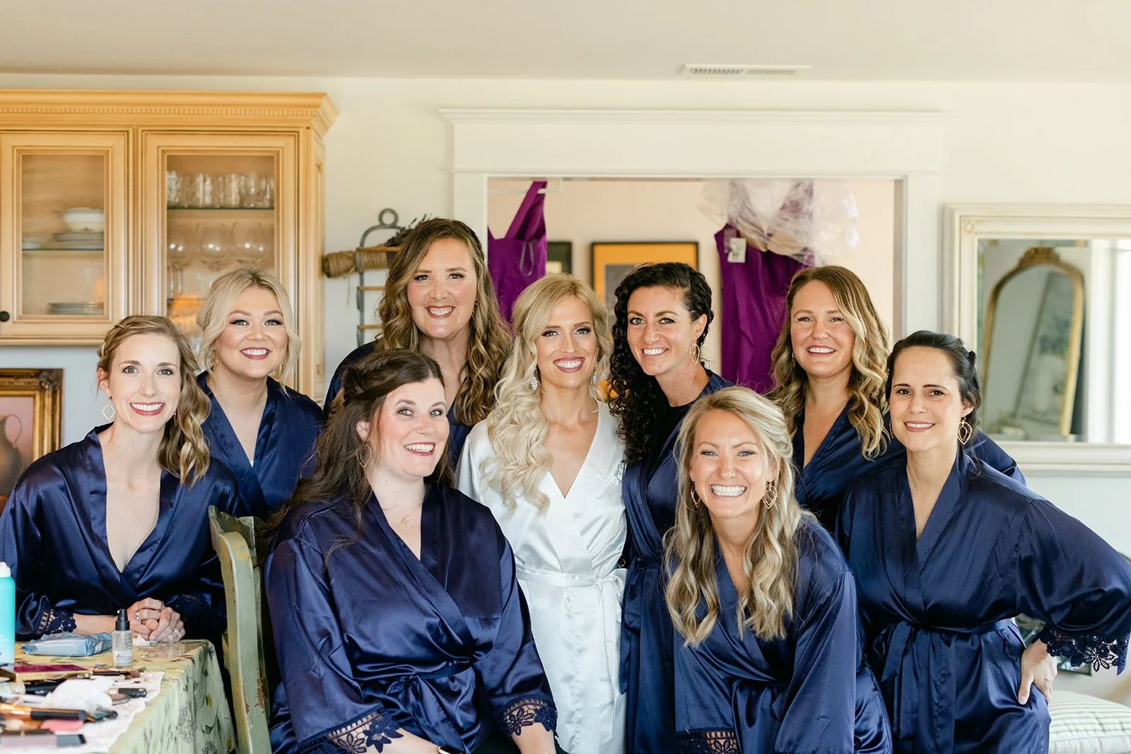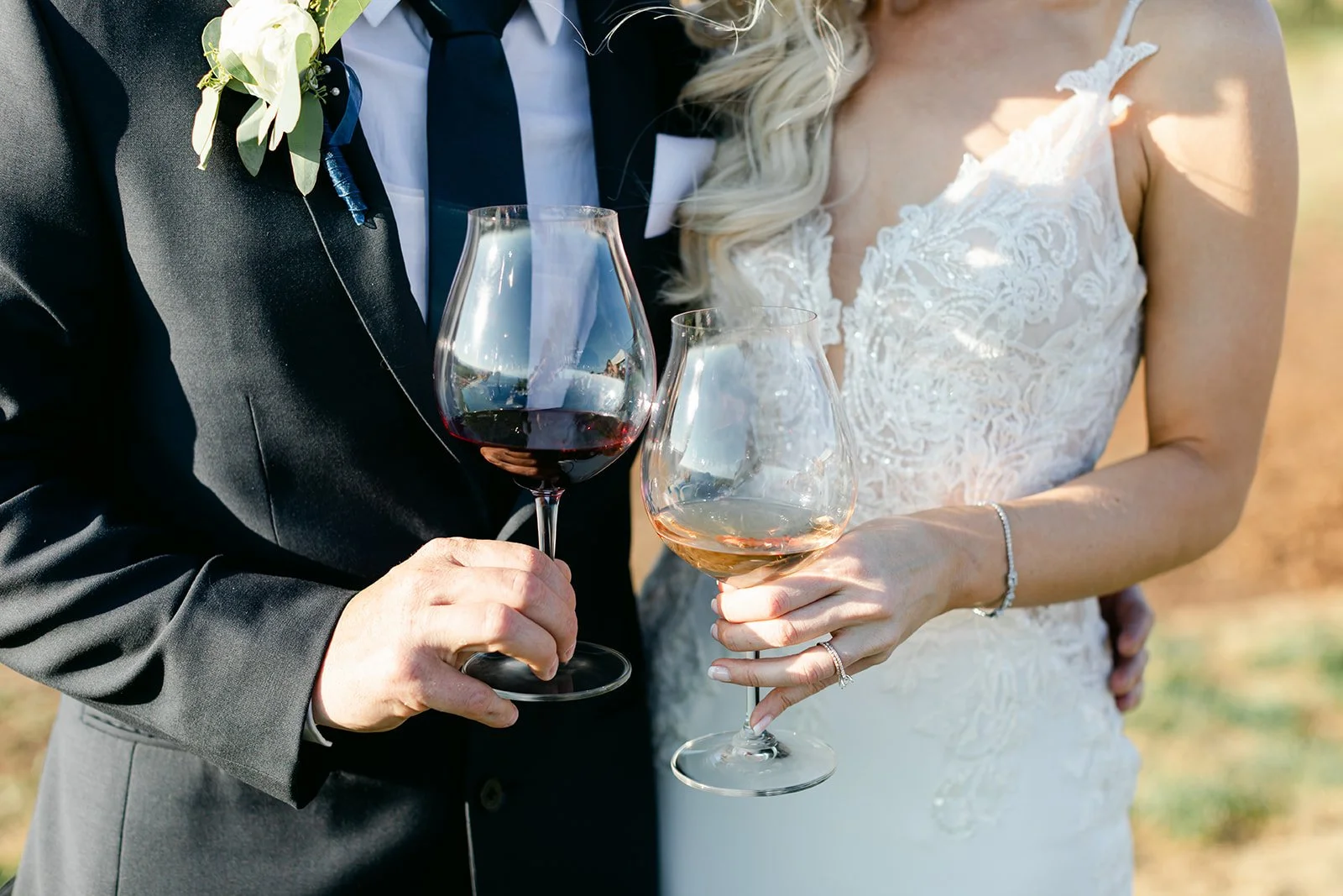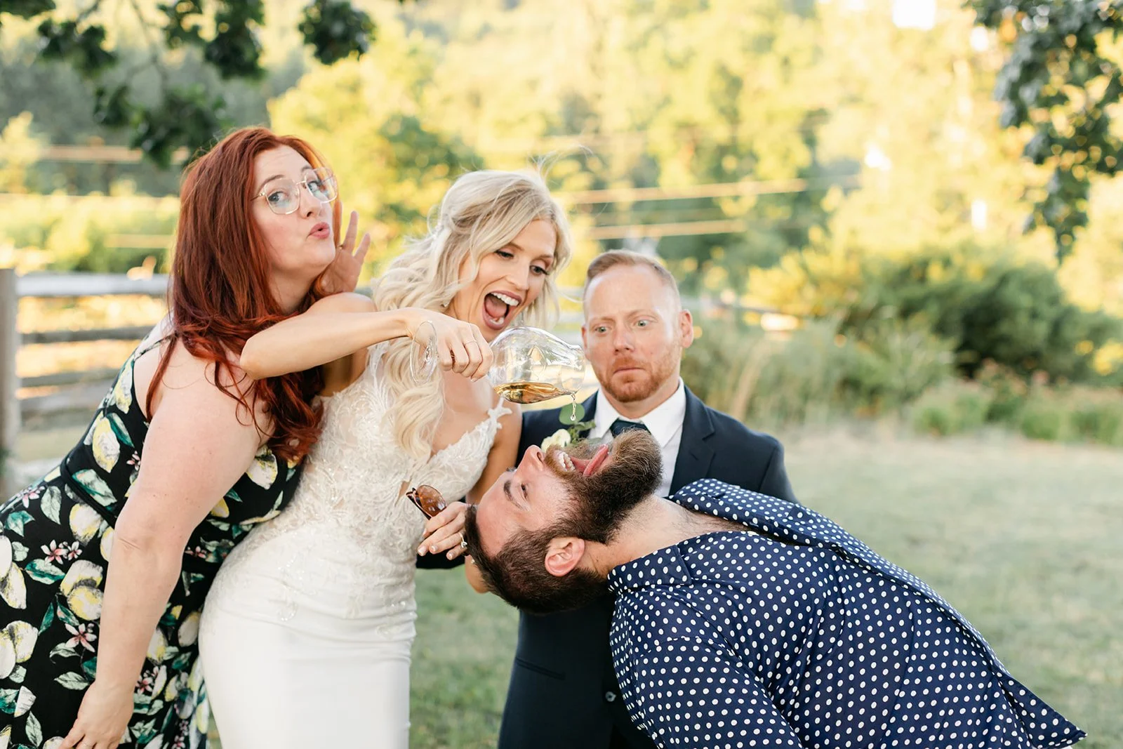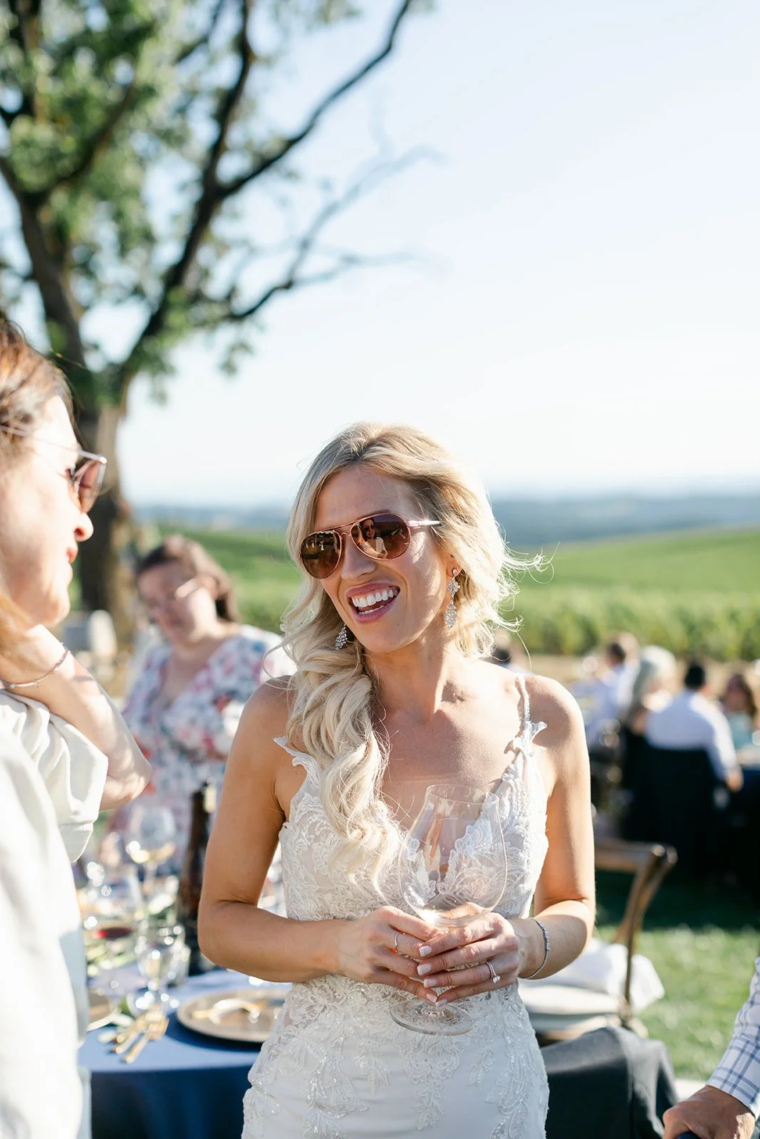 Heather was stunning in a fitted lace gown with an open back and a cathedral train, carrying a lush bouquet of white roses and eucalyptus. Tyson was locked in — the grin he had when she walked toward him didn't leave his face for the rest of the day. The bridesmaids were in deep magenta, bright against the golden vineyard hillside, and the whole scene looked like Oregon in peak summer had dressed itself up for the occasion.
