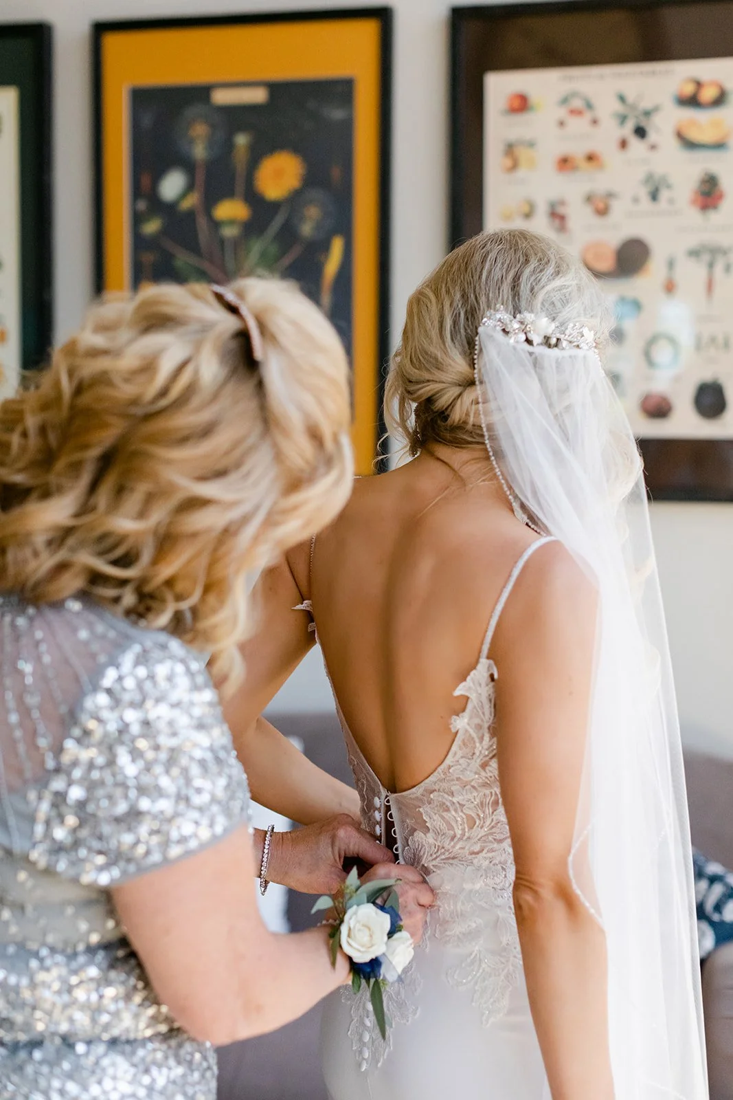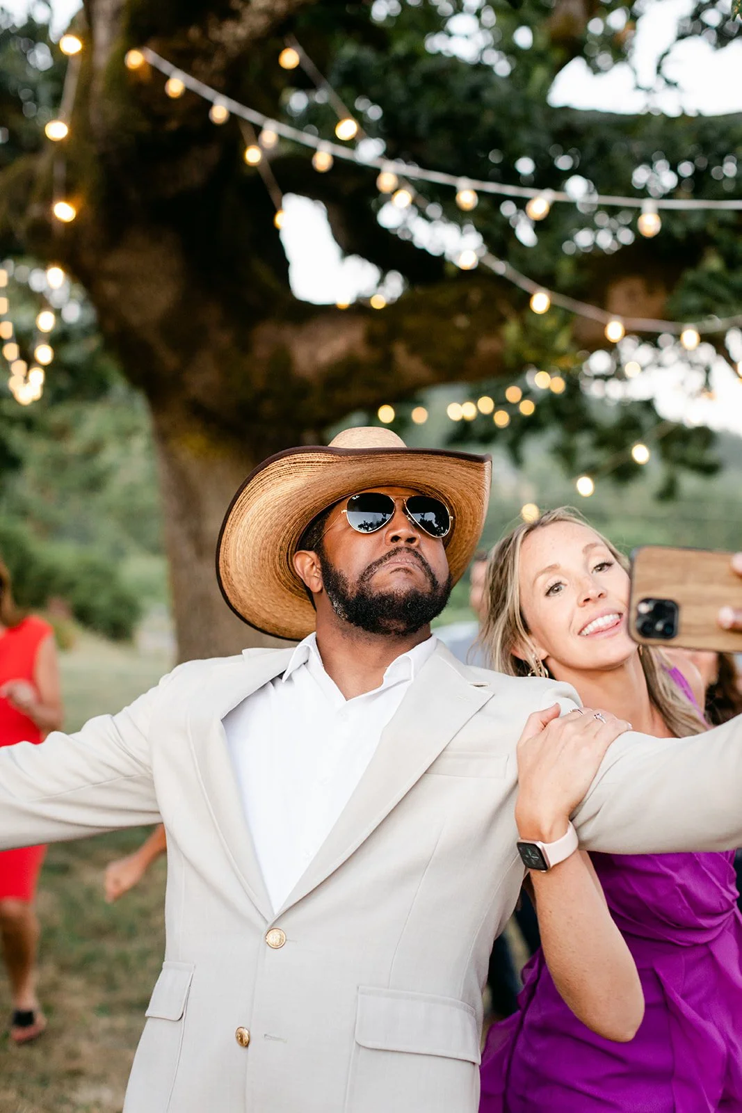 That oak tree is where it happened. Tyson and Heather stood beneath its canopy in the full warmth of a summer afternoon, and their family gathered around them — not just watching, but actively praying over them as they exchanged vows. It was one of those ceremony moments that makes the whole room go quiet in the best possible way. The veil caught the breeze. Everyone was present.