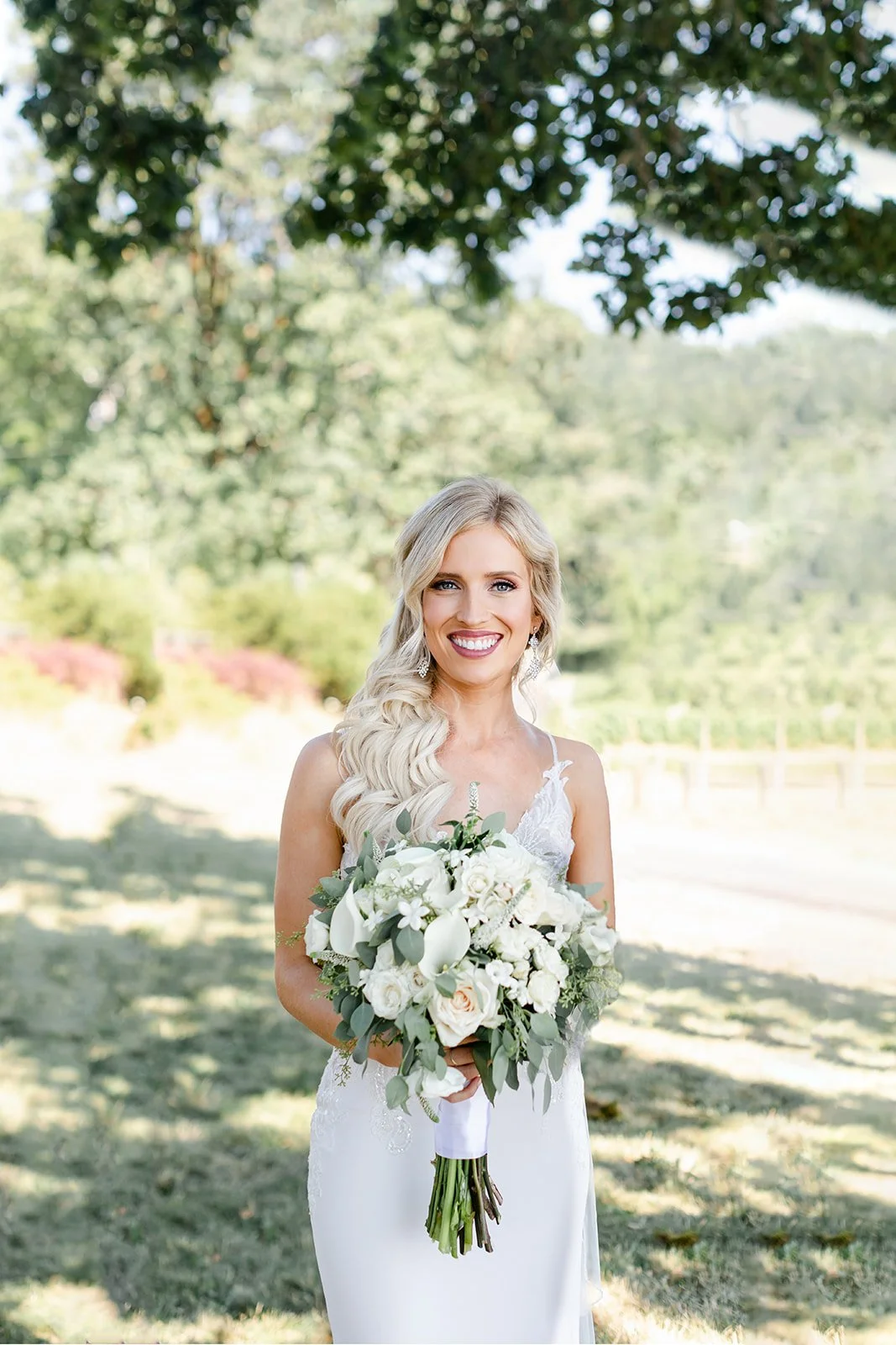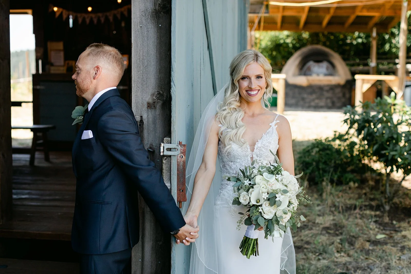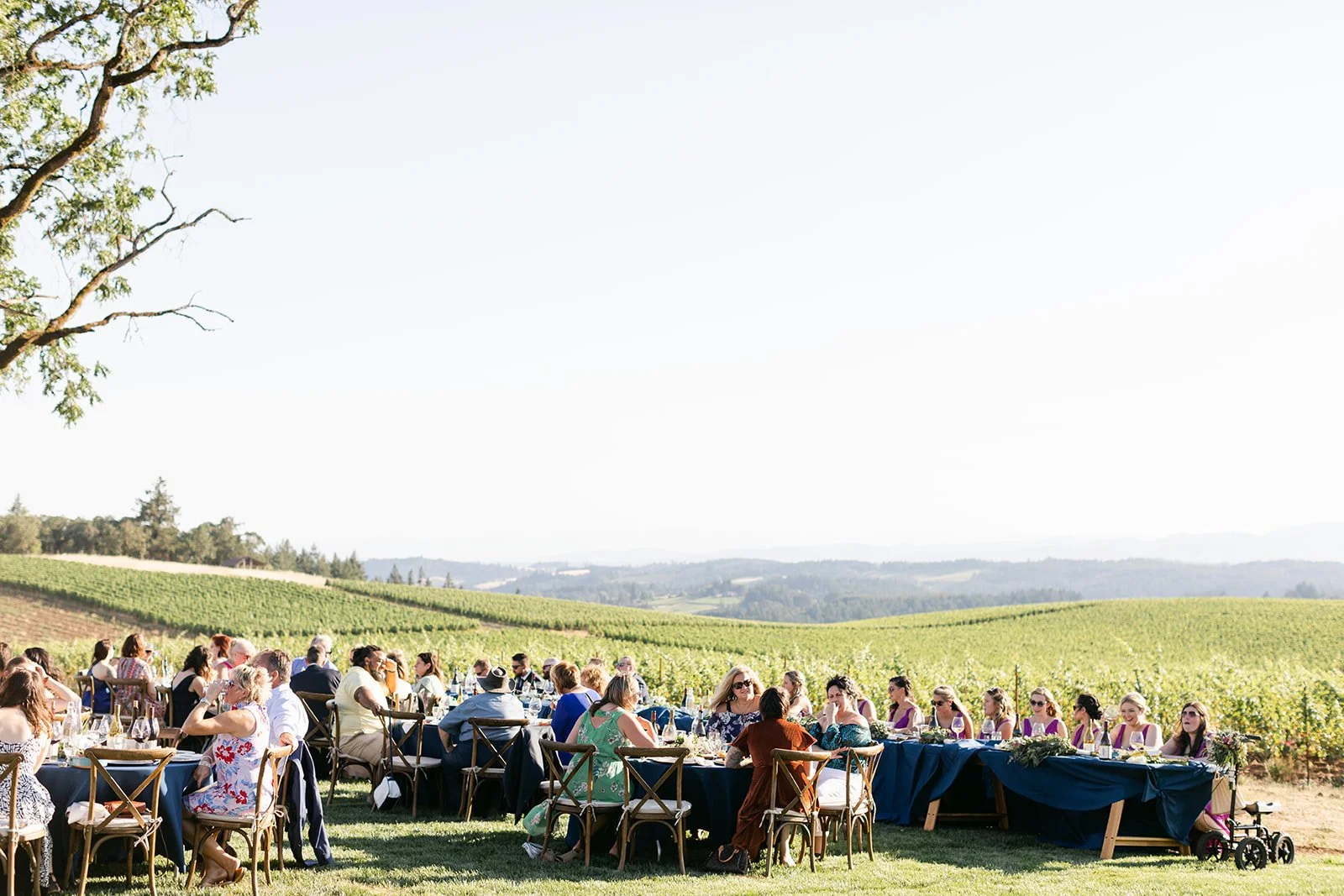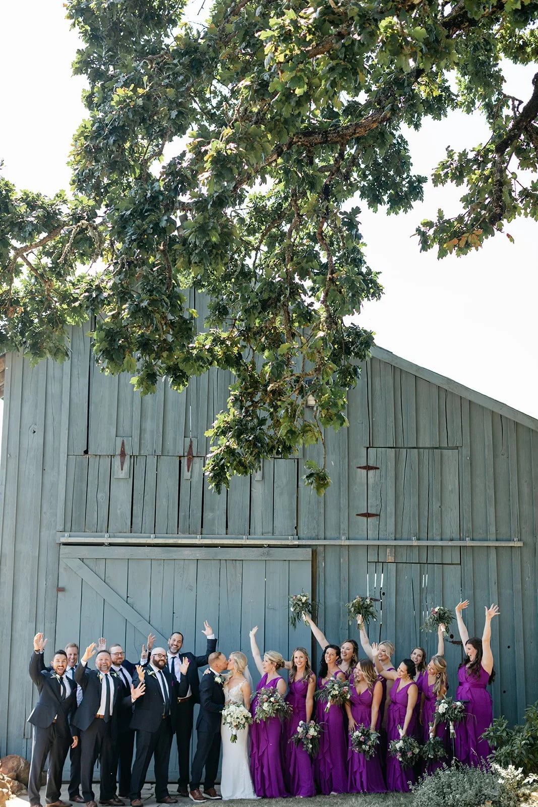 La Belle Promenade hosts just six weddings a year. Six. That number alone tells you everything about what kind of experience it is. The estate sits high in the hills above Newberg, rows of vines rolling out in every direction, the Willamette Valley spreading wide beneath a summer sky that on this particular day was doing absolutely everything right. There is a blue barn, a ghost barn, a garden kitchen, and one of the most magnificent oak trees I have ever photographed a wedding under.