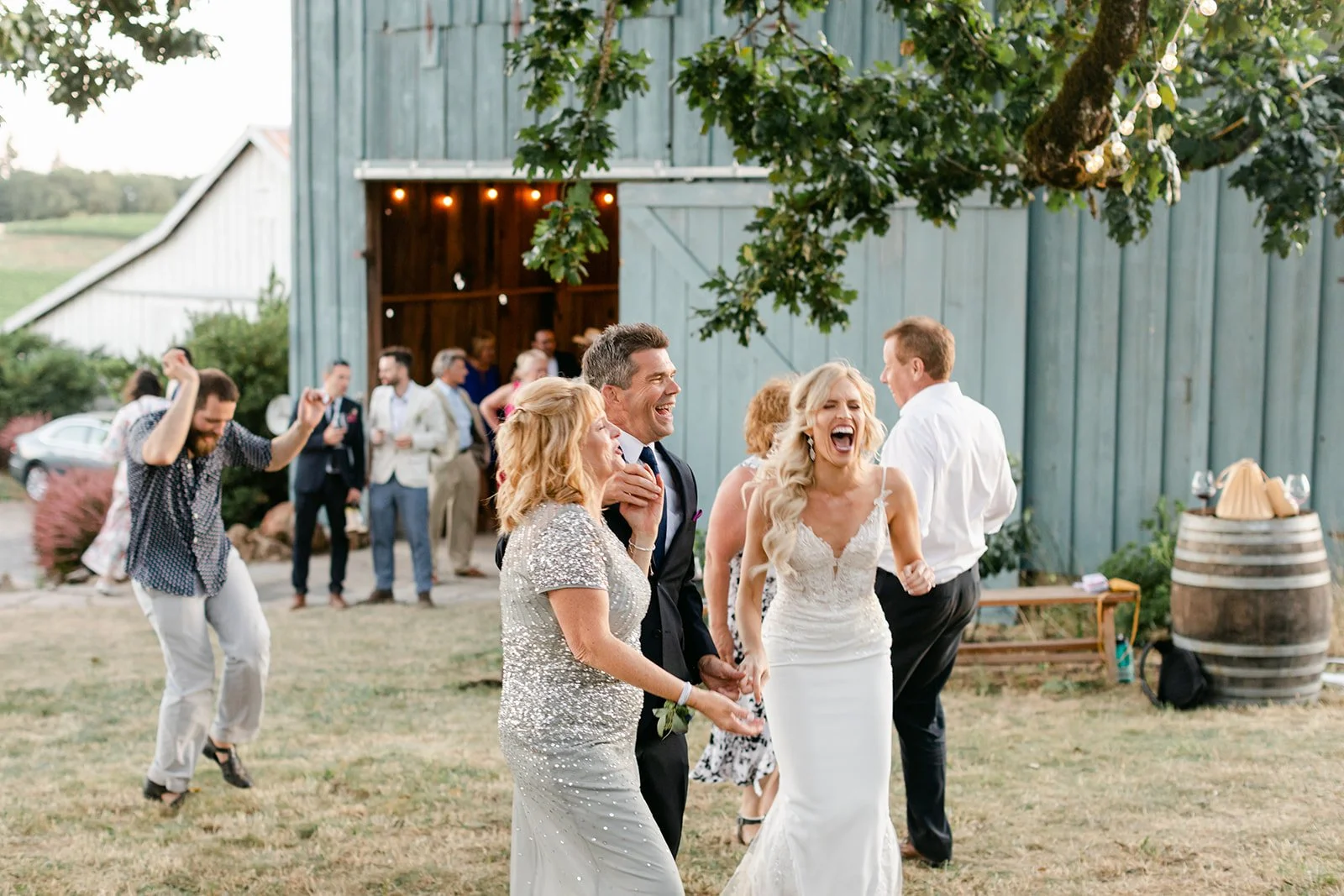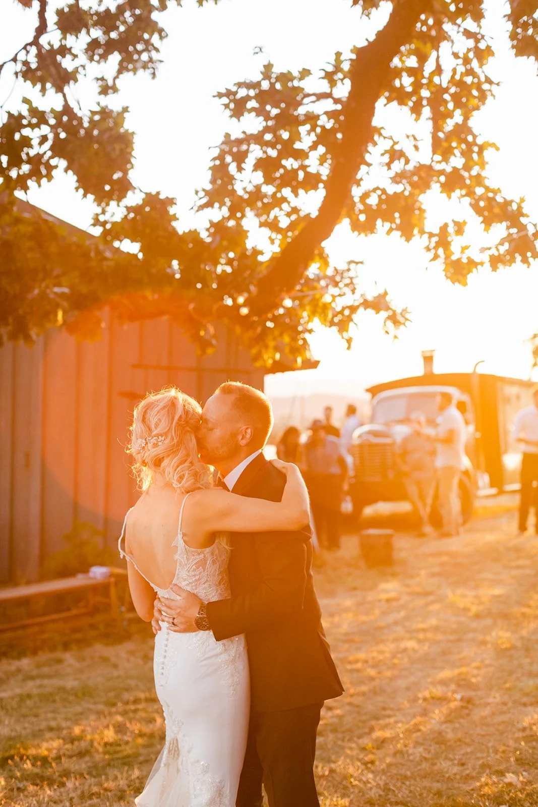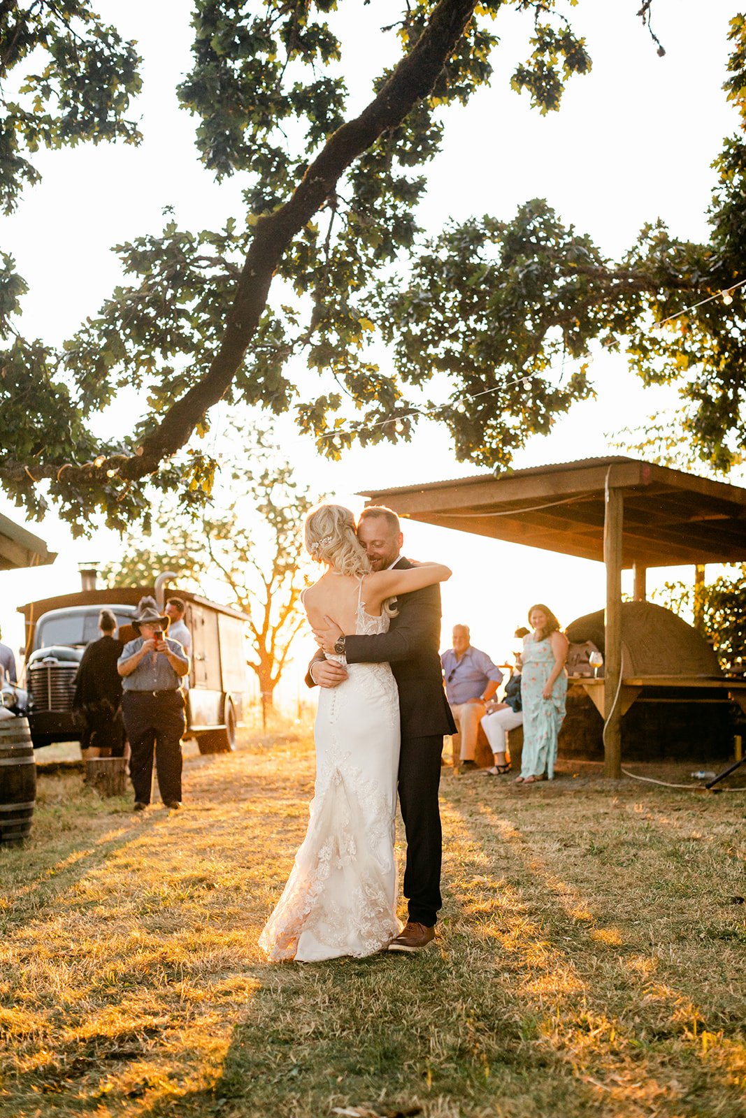 After the ceremony the reception moved into the blue barn, strung with warm globe lights, while dinner came out courtesy of Red Hills Market — the beloved Dundee institution that knows how to feed a crowd well. Beautiful individual ratatouille crocks garnished with microgreens arrived at long outdoor tables set against the vineyard view, with wine flowing freely and guests who clearly knew how to enjoy themselves. The golden hour first dance happened outside under the oak with the last light of the day pouring through the trees, an old truck in the background, and not a single thing that needed to be better than it already was.
