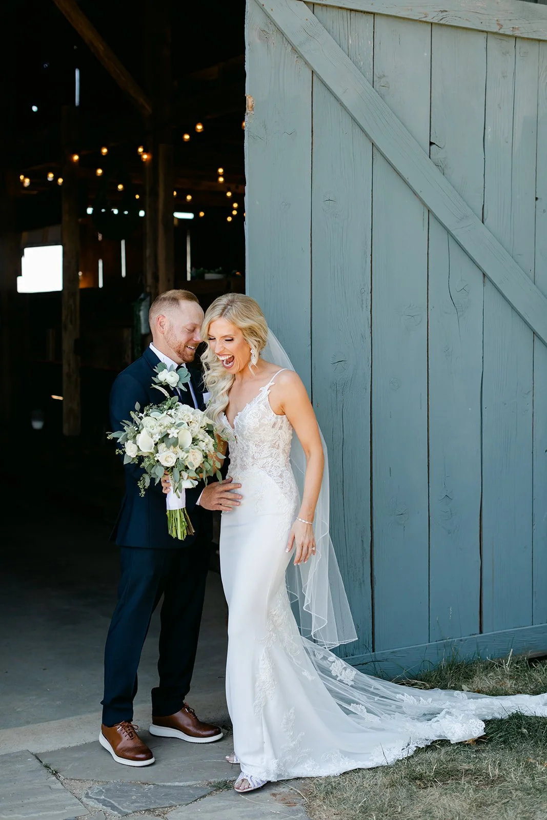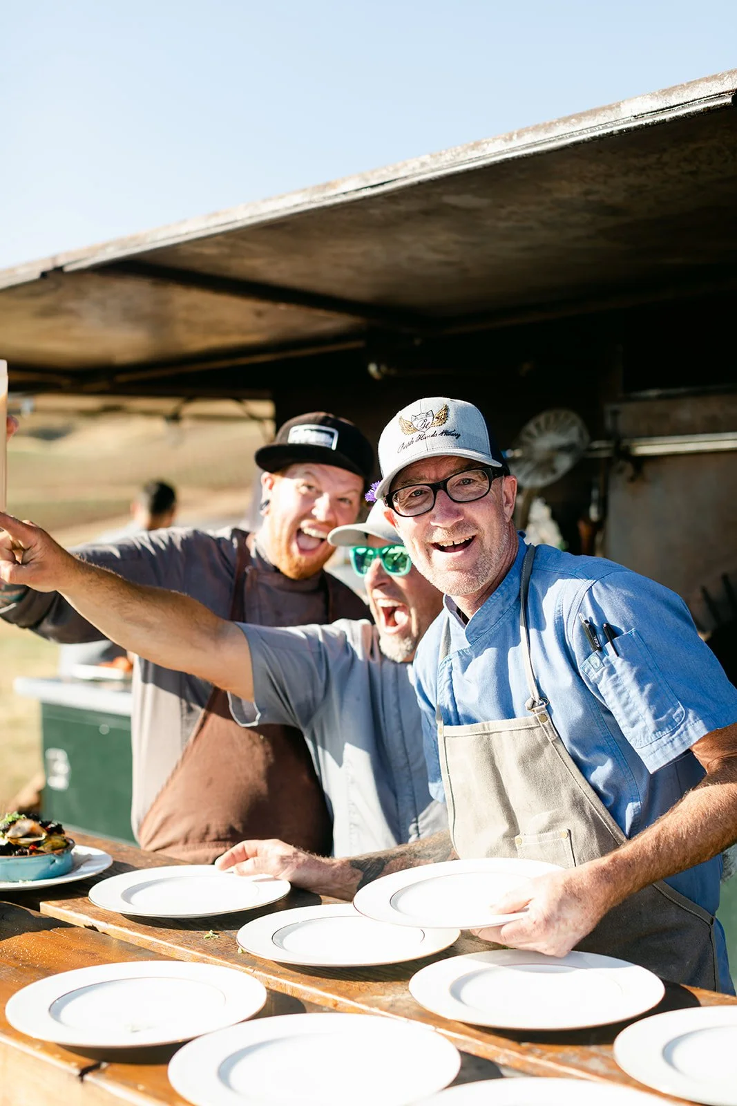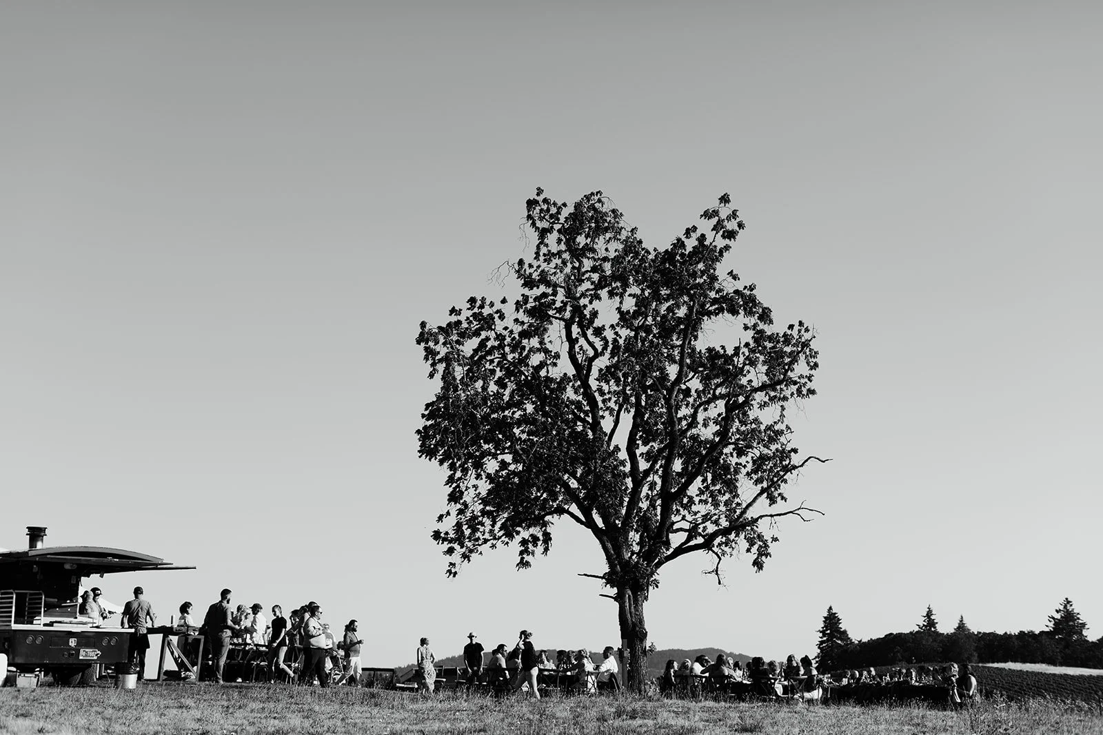 After the ceremony the reception moved into the blue barn, strung with warm globe lights, while dinner came out courtesy of Red Hills Market — the beloved Dundee institution that knows how to feed a crowd well. Beautiful individual ratatouille crocks garnished with microgreens arrived at long outdoor tables set against the vineyard view, with wine flowing freely and guests who clearly knew how to enjoy themselves. The golden hour first dance happened outside under the oak with the last light of the day pouring through the trees, an old truck in the background, and not a single thing that needed to be better than it already was.